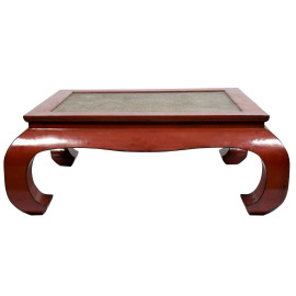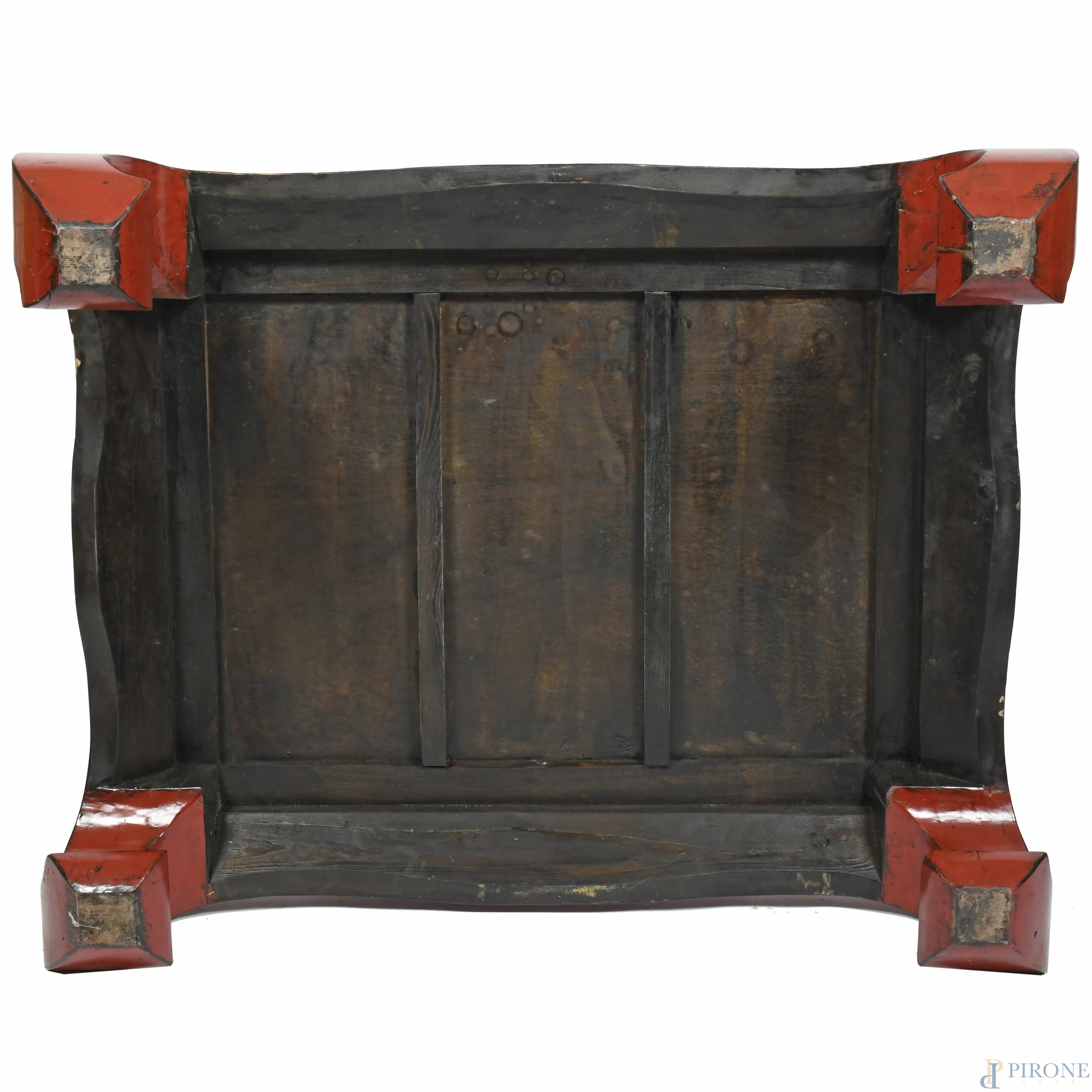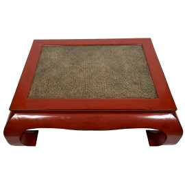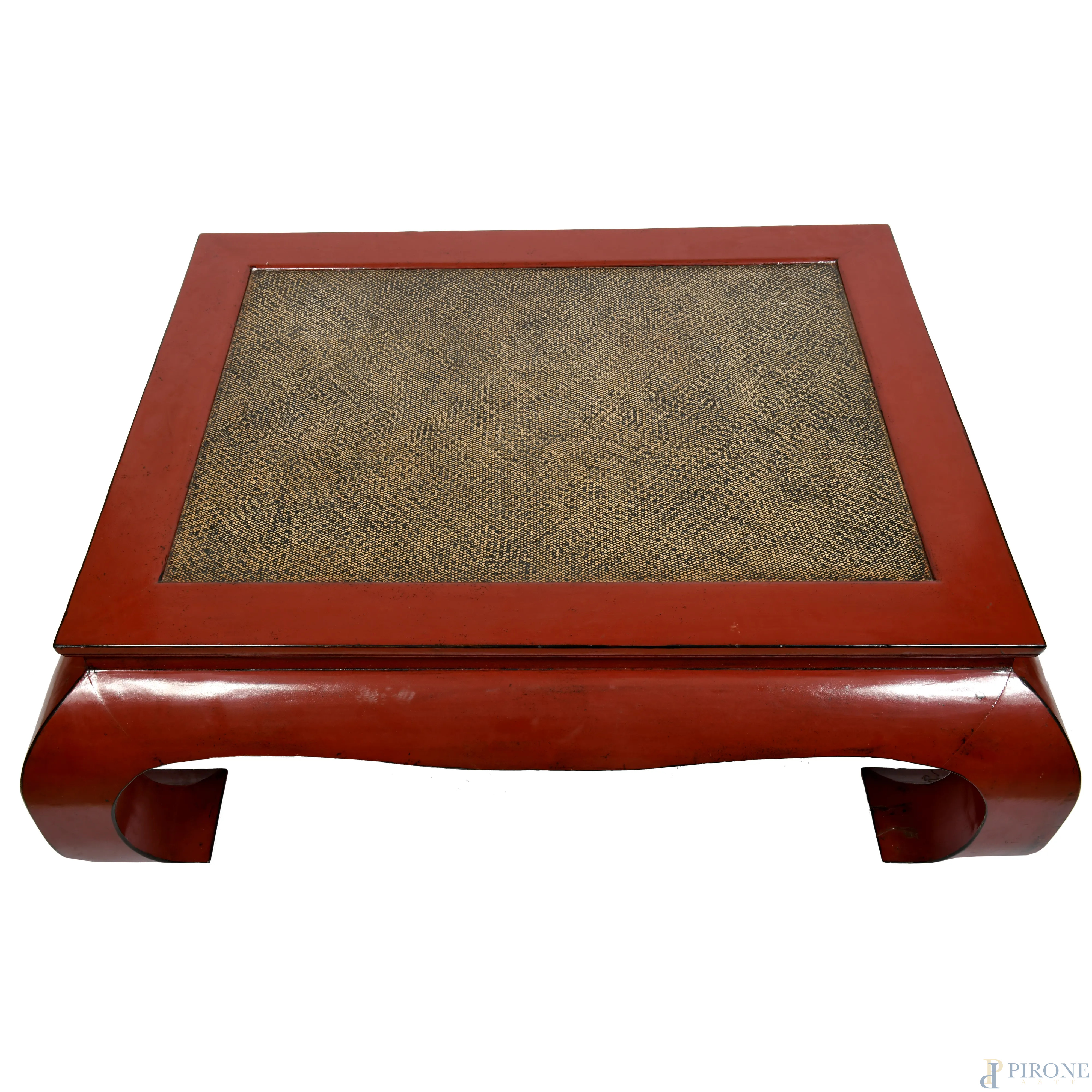 Tavolo basso in legno laccato rosso con piano in legno a finto rattan, XX secolo, cm 55x119x149, (segni di usura, graffi, cadute di colore, difetti)