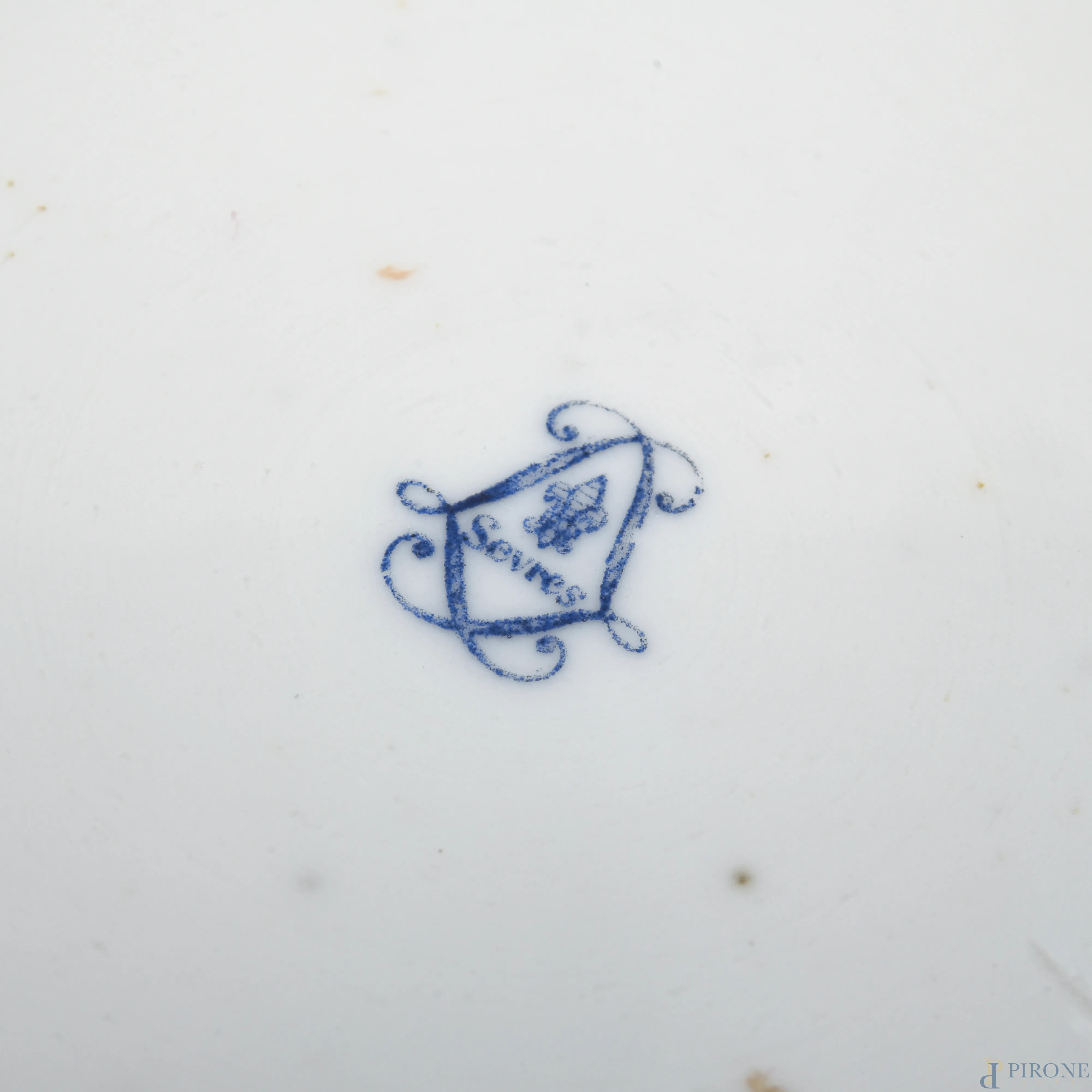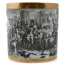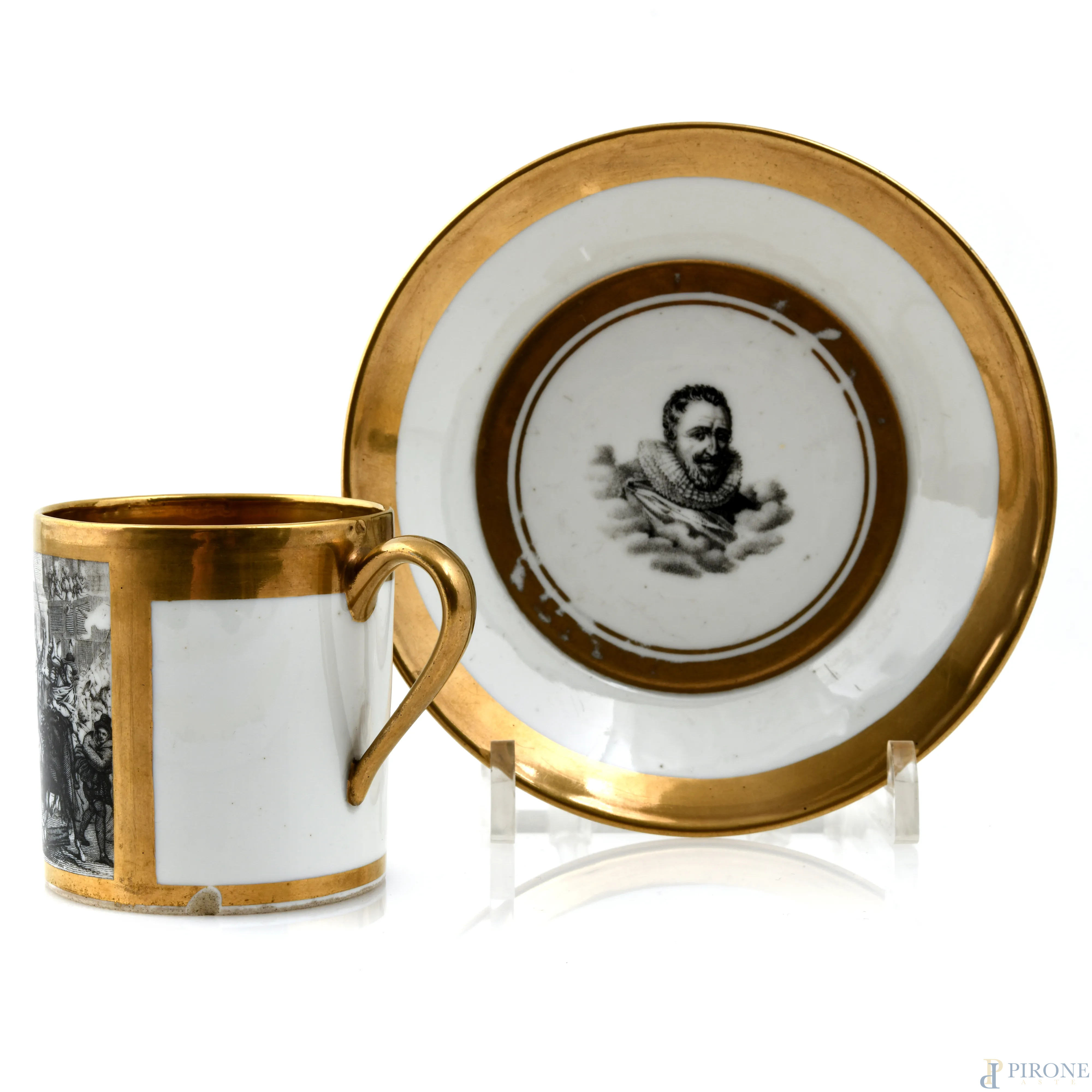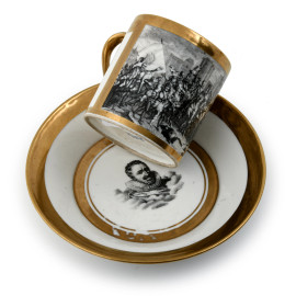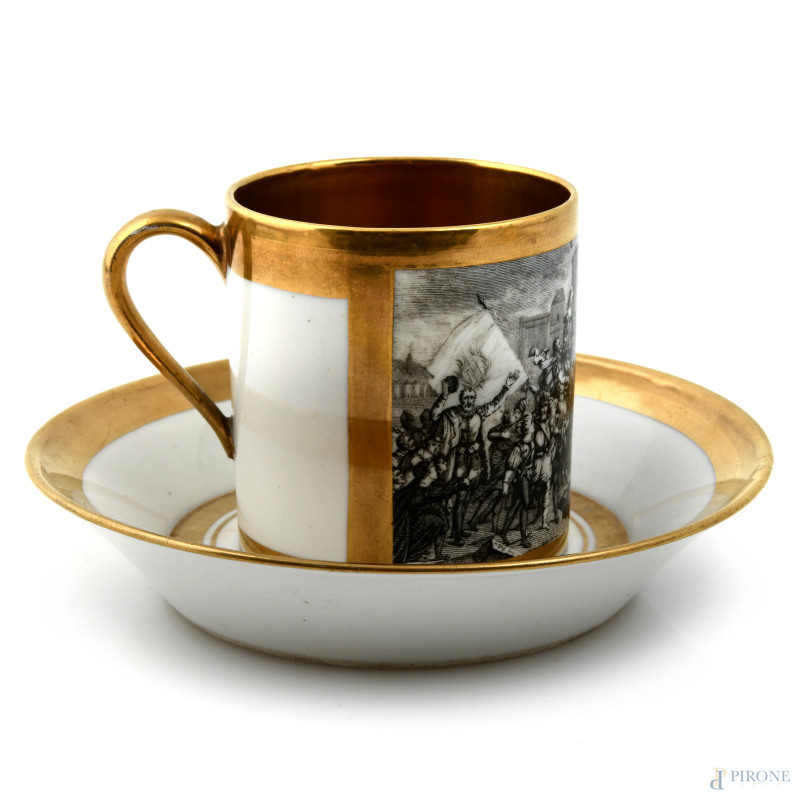 Tazzina e piattino da caffè in porcellana Sevres a fondo bianco con profili oro e scena di battaglia, altezza cm 6,5, (sbeccature, difetti)
