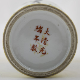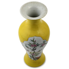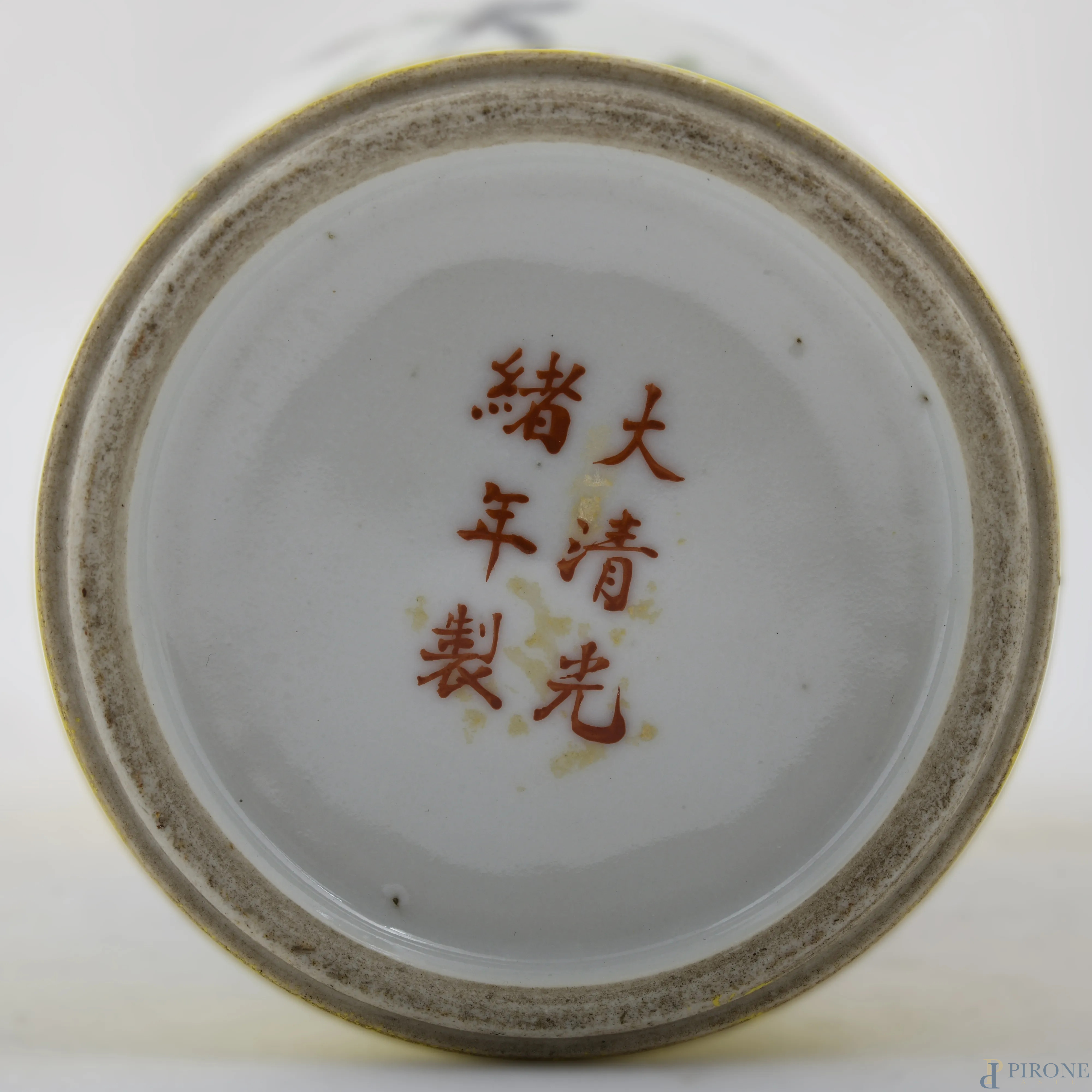 Vasetto in porcellana dipinta con fiori e rondine su fondo giallo, XX secolo, altezza cm 25, (difetti di cottura, segni di usura)