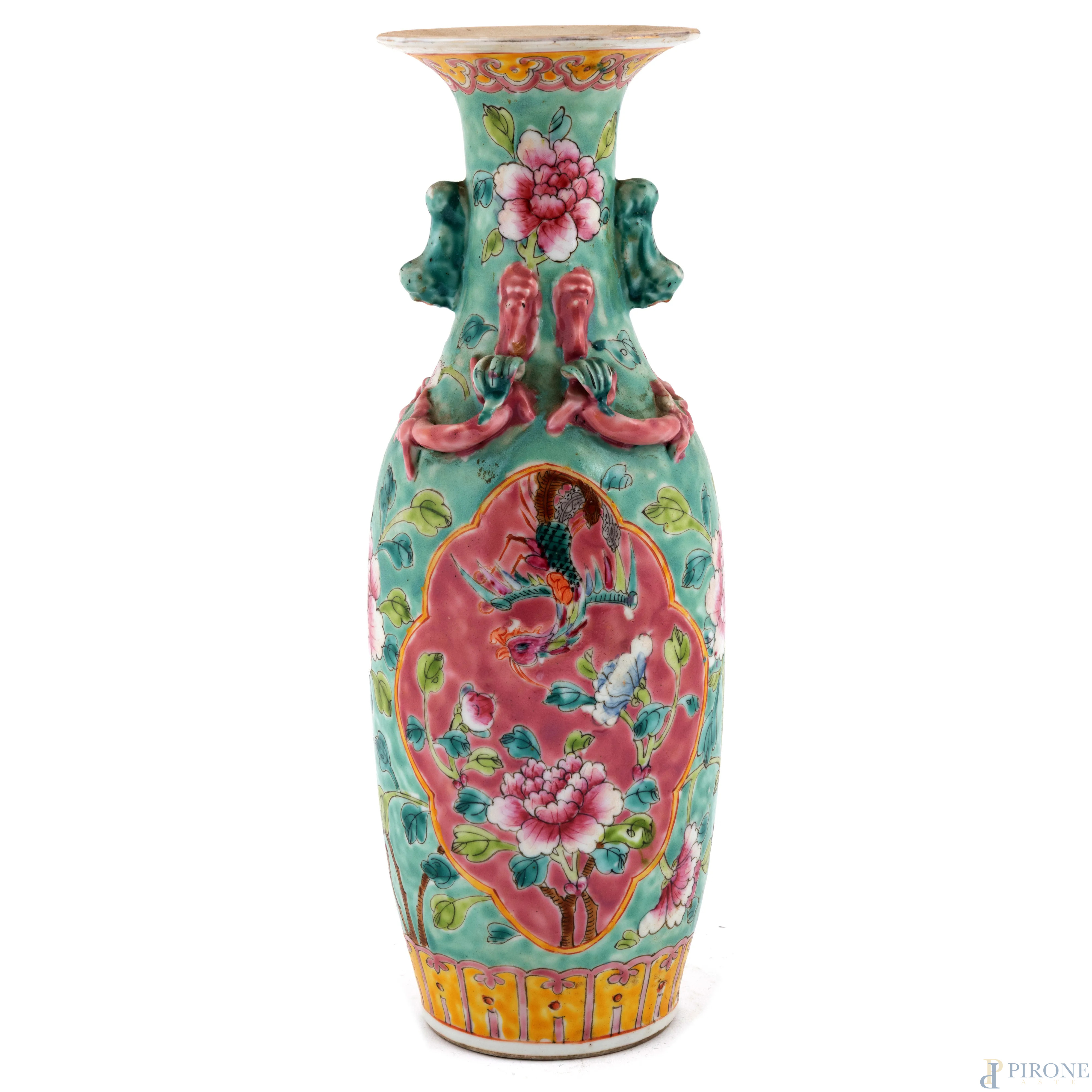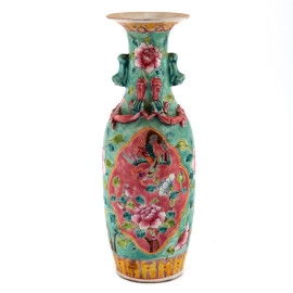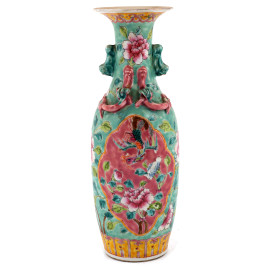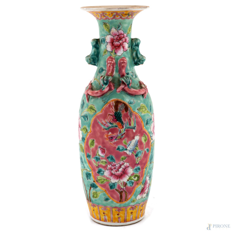 Vaso in porcellana policroma a decori floreali. Cina, XIX-XX secolo, altezza 29,5, (difetti di cottura, segni di usura)