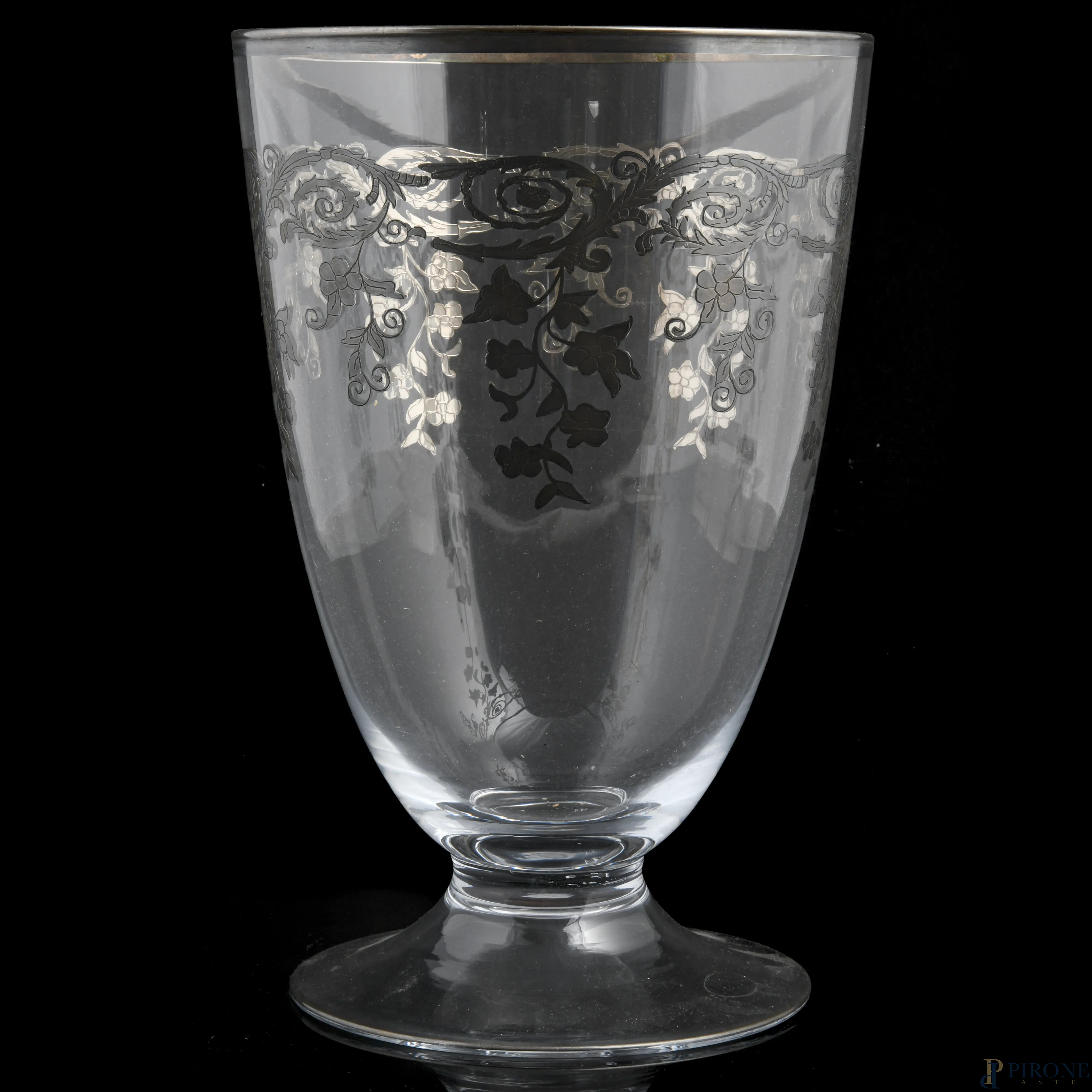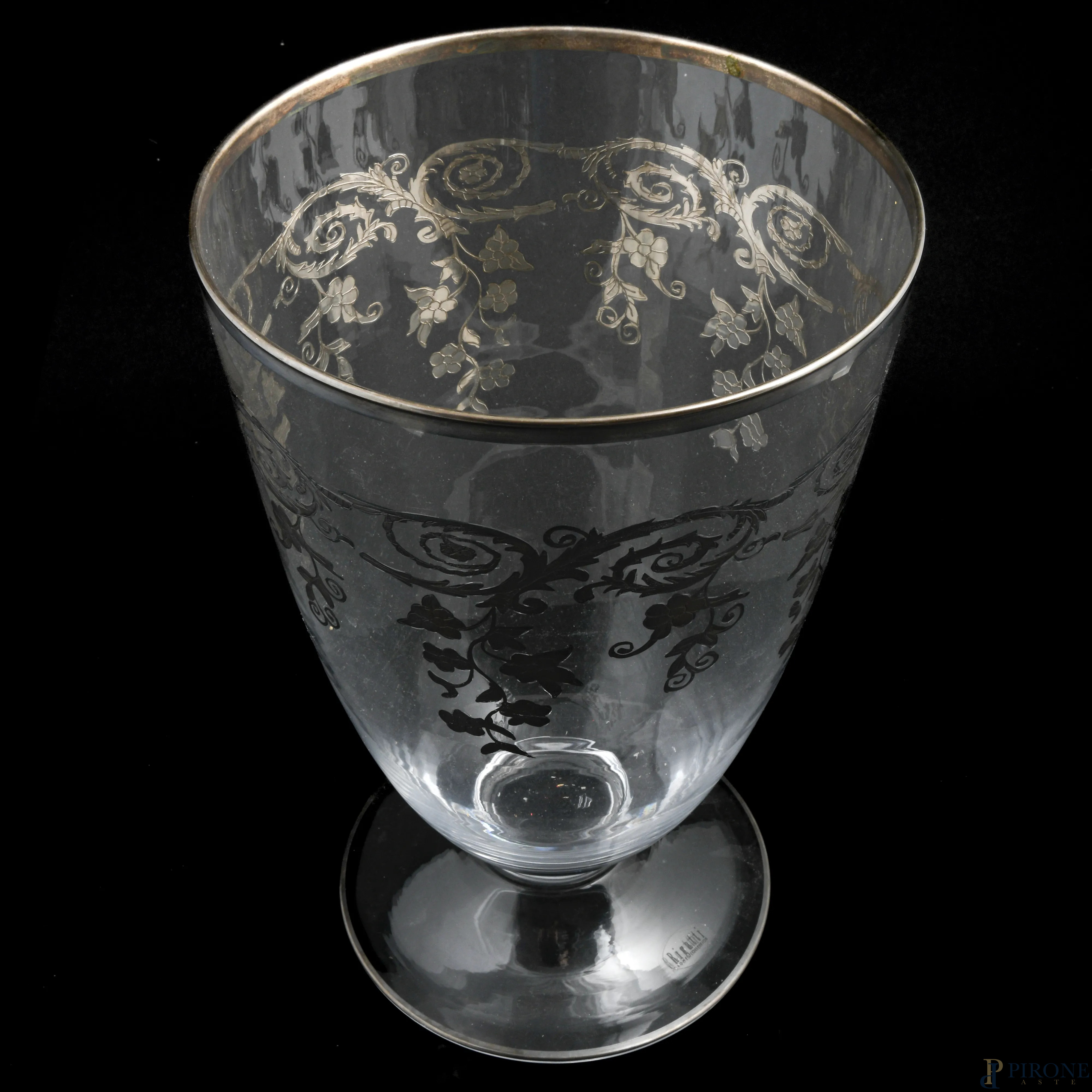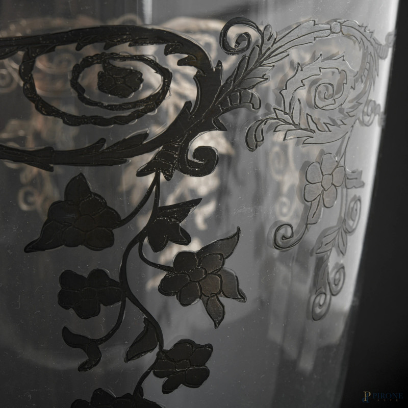 Vaso in vetro Rigatti con decori a racemi argentati, XX secolo, altezza cm 31