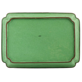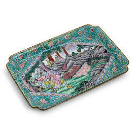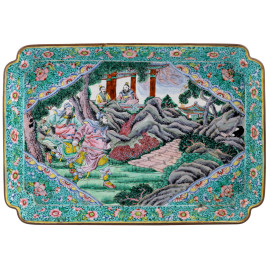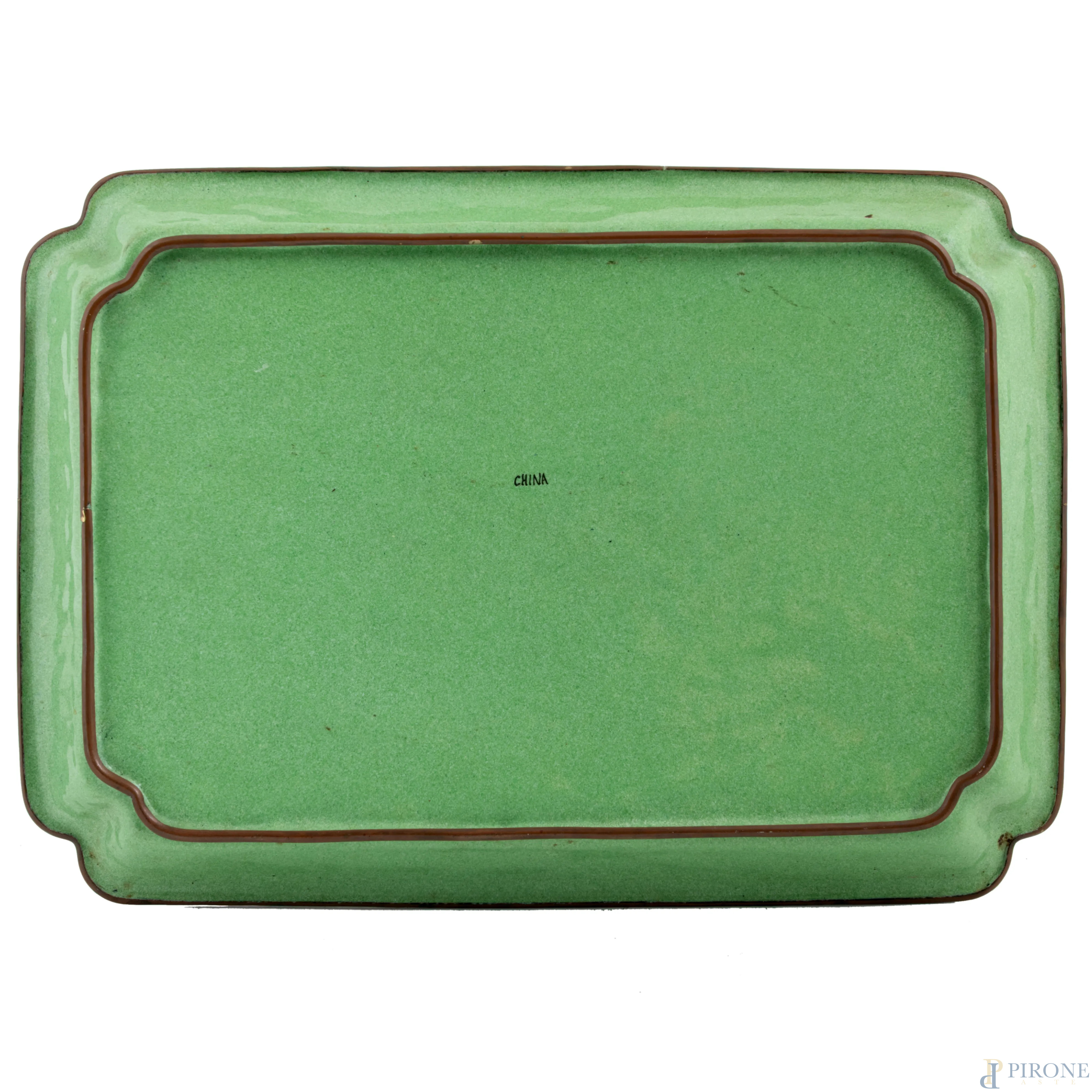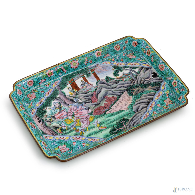 Vassoio cloisonnè in metallo dipinto con scene di genere in paesaggio. Cina, XX secolo, cm 31x21,5