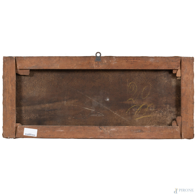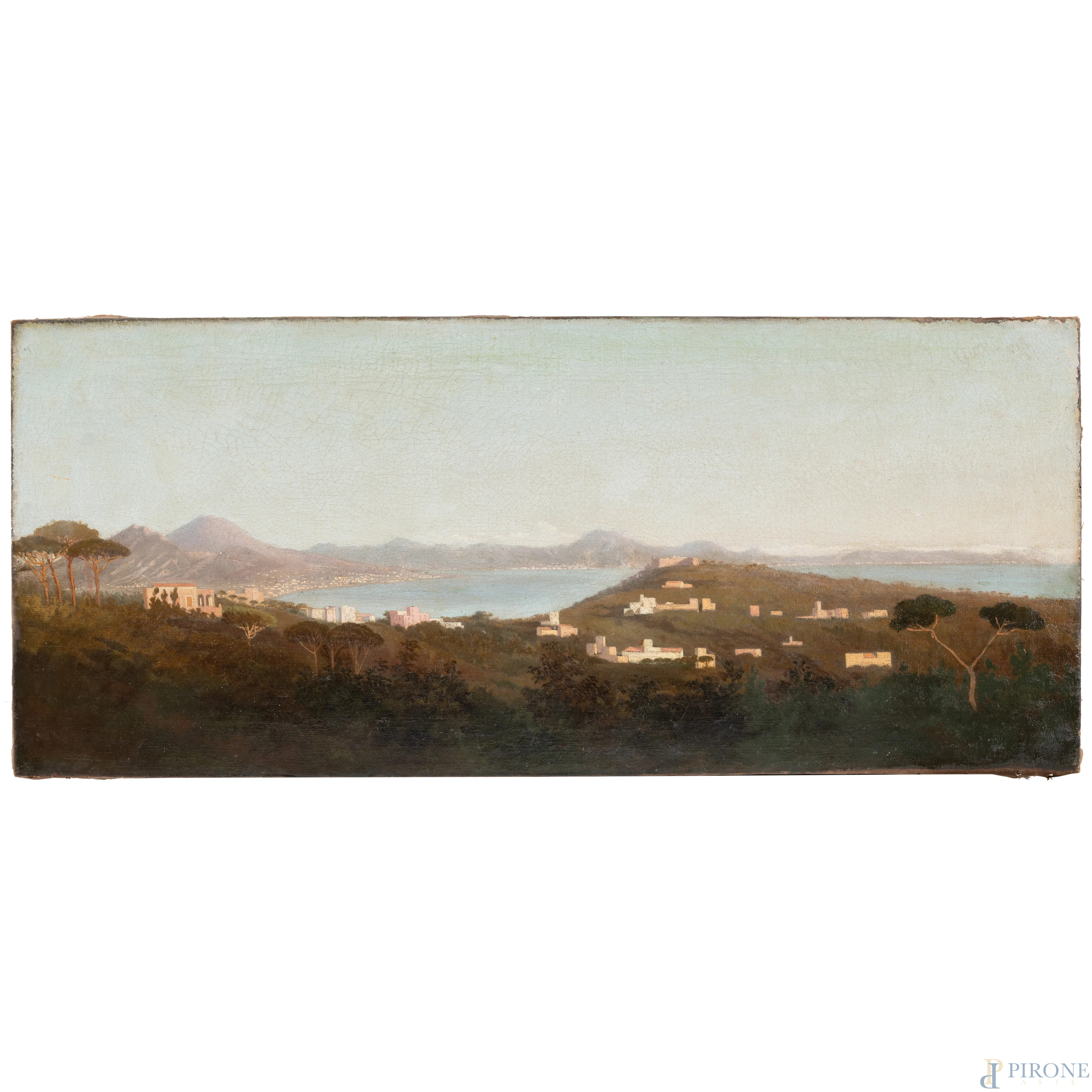 Veduta del golfo di Napoli, XIX-XX secolo, cm 35x82, (craquelure, sollevamenti della pellicola pittorica, segni di usura, graffi)