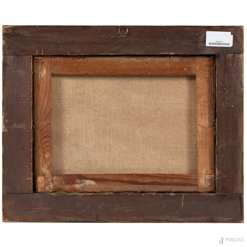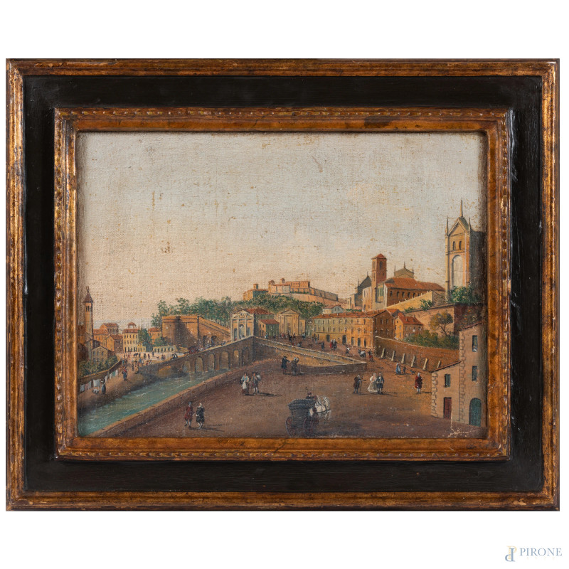 Veduta di Bergamo, XVIII secolo, olio su tela, cm 29x39, entro cornice, (craquelure, segni di usura, tracce di umidità)
