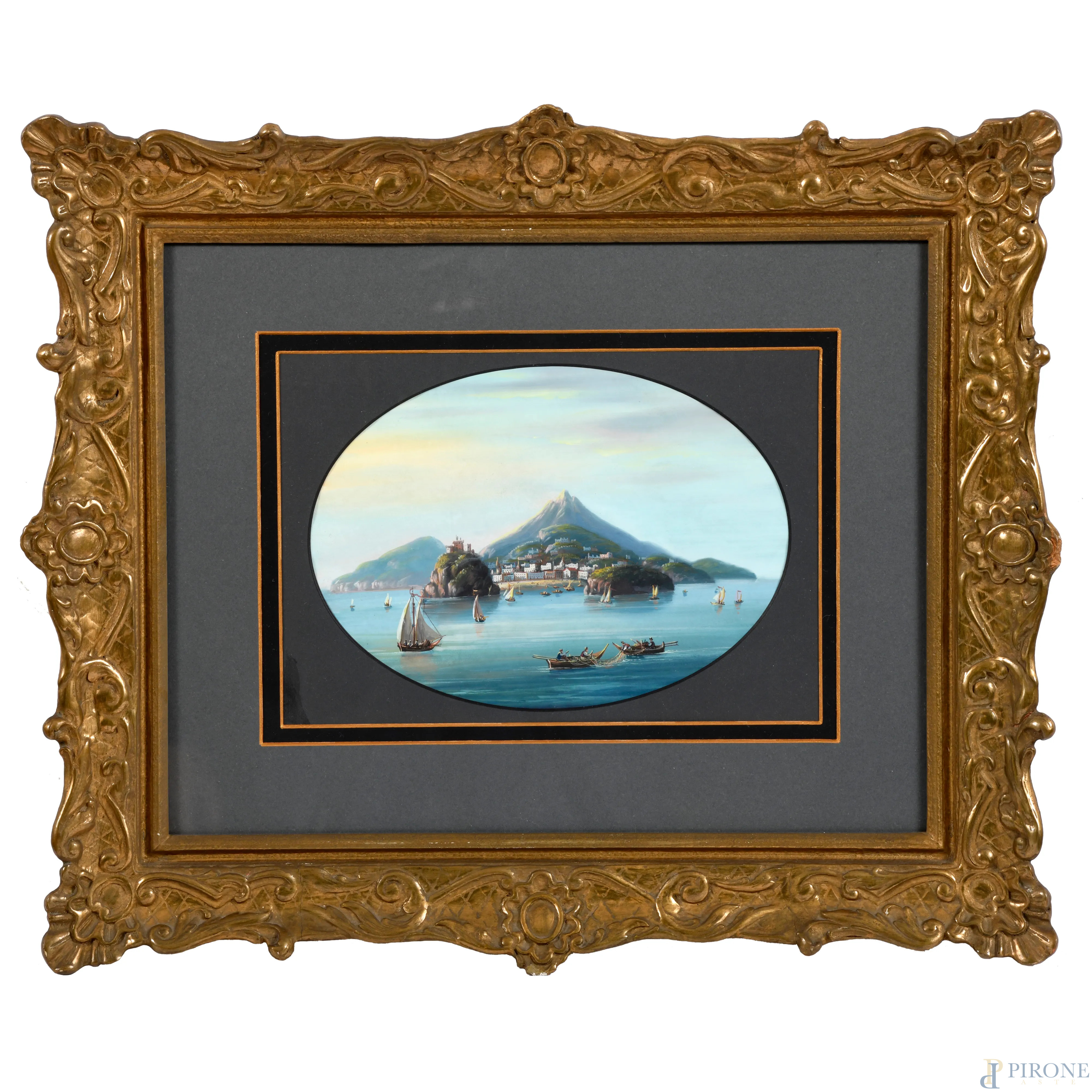Veduta marina con pescatori, XX secolo, gouache su carta, cm 32x41 compreso passepartout, entro cornice