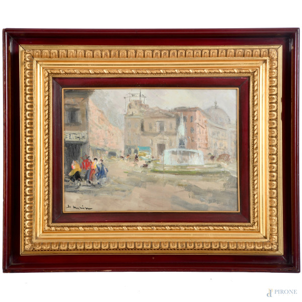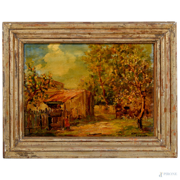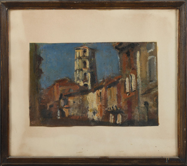 Carlo Quaglia (1903-1970), Scorcio con tetti, olio su compensato, cm 50x70 , firmato in basso, entro cornice