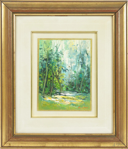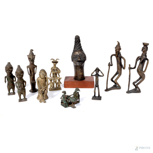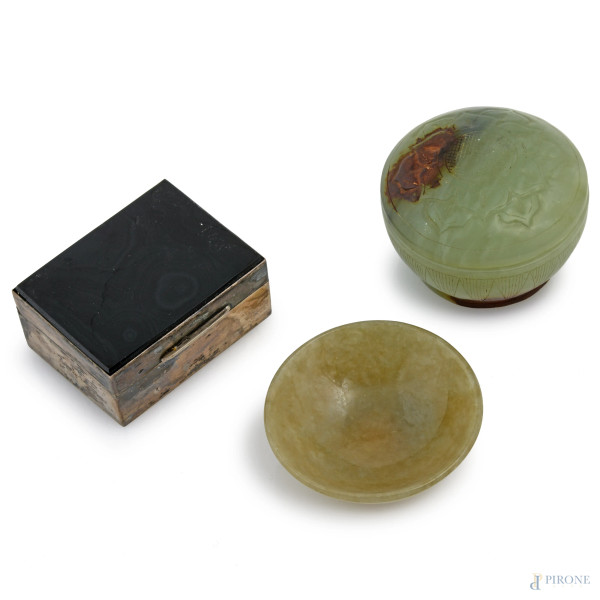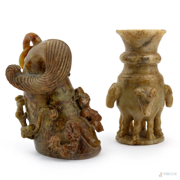 Coppia di coppe in bronzo cesellato con scene mitologiche a rilievo su base in marmo, XX secolo, altezza massima cm 22, (segni di usura)