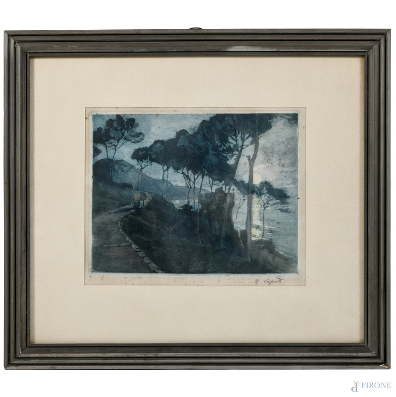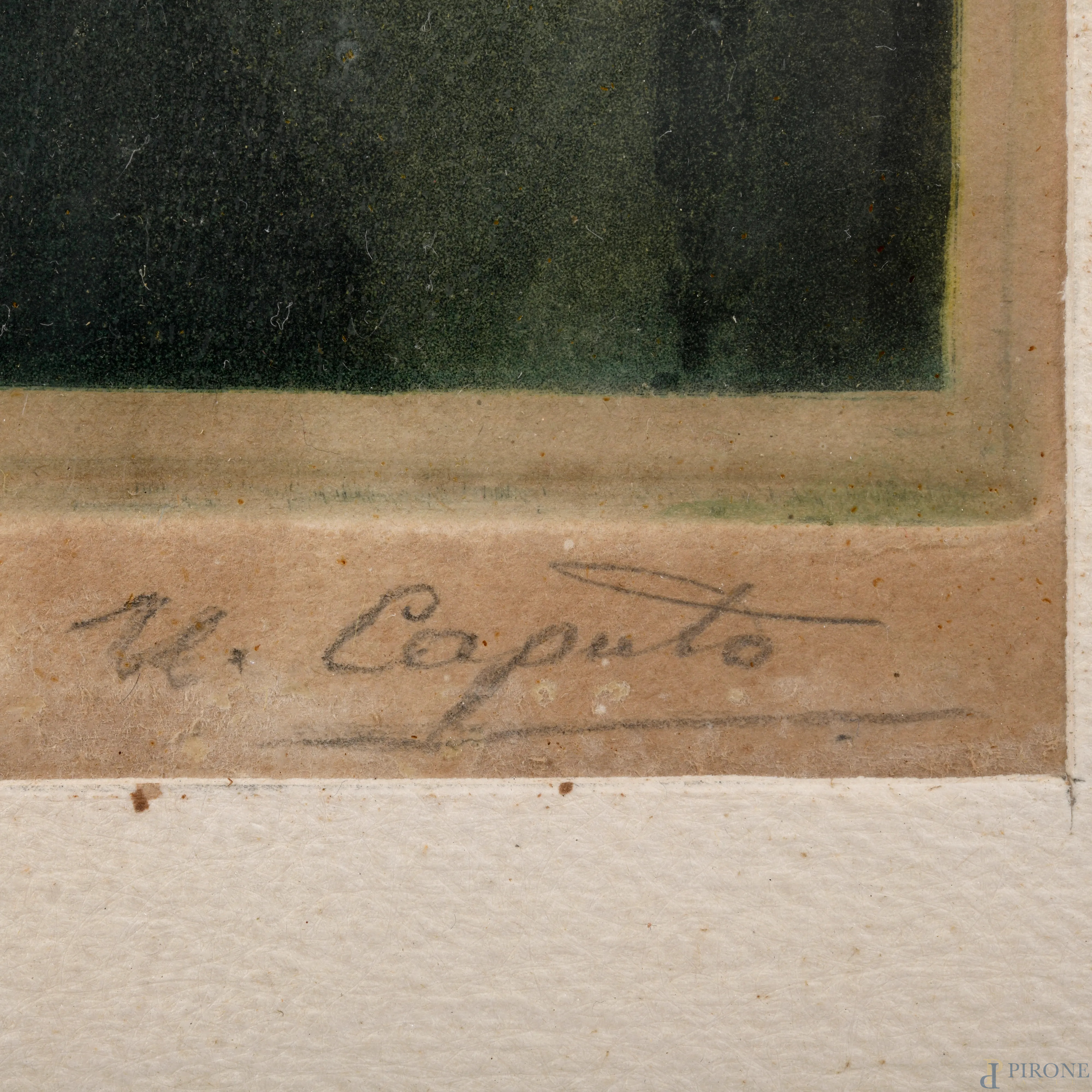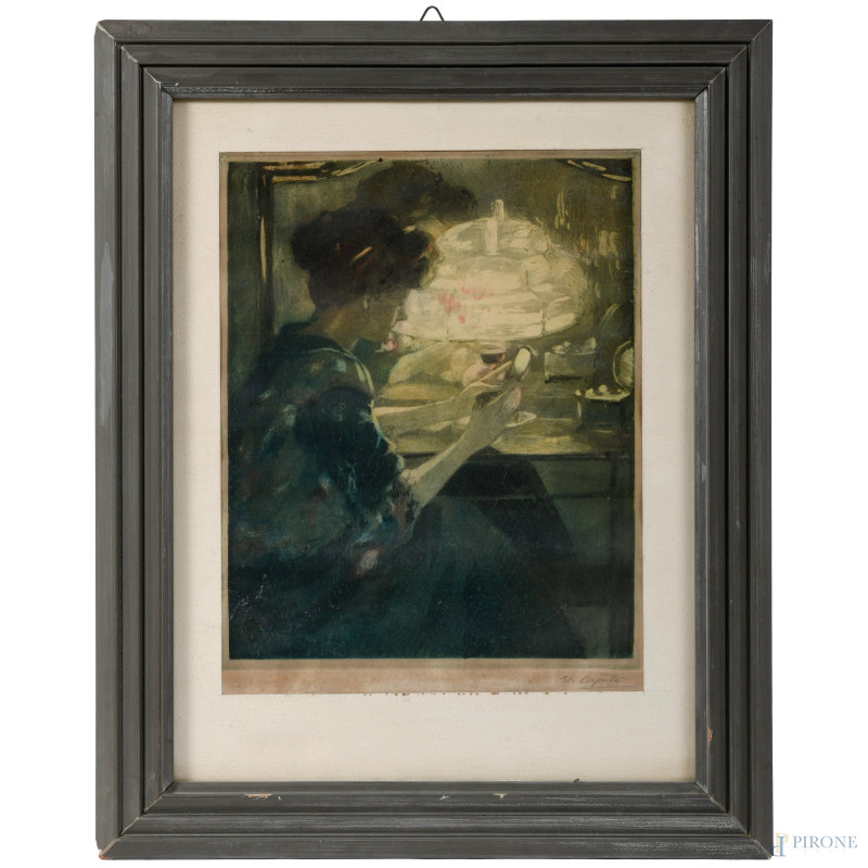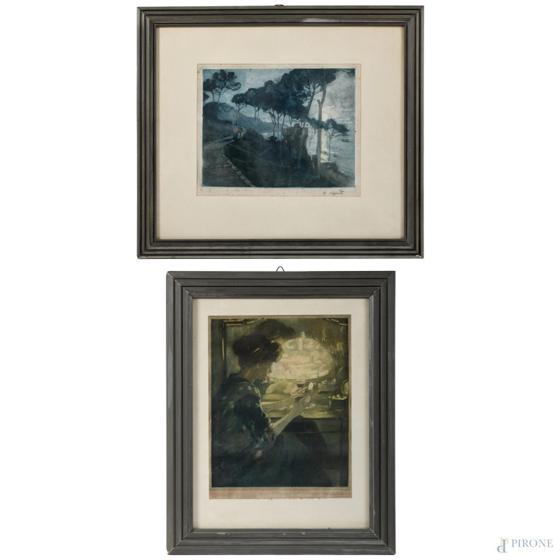 Coppia di litografie di Ulisse Caputo, raffiguranti rispettivamente donna alla toletta e scorcio notturno, cm 43x33 compreso passepartout (difetti, ondulazioni della carta)