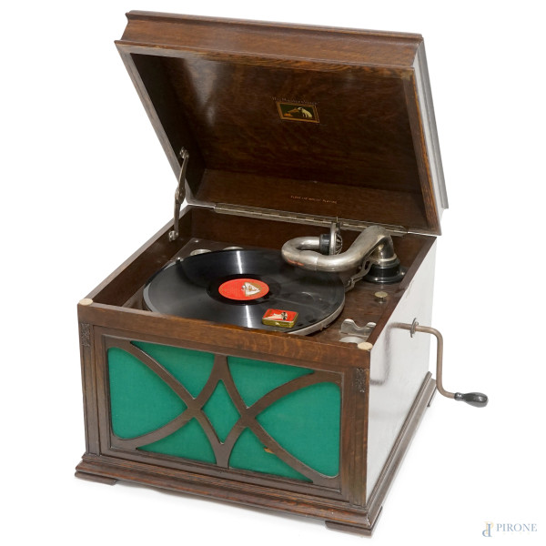 Coppia di poltroncine in noce con gambe mosse. Seduta, braccioli e schienale imbottiti e rivestiti in tessuto, XX secolo, cm 93x63x43, (rotture e mancanze)