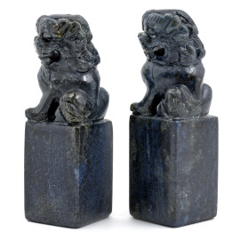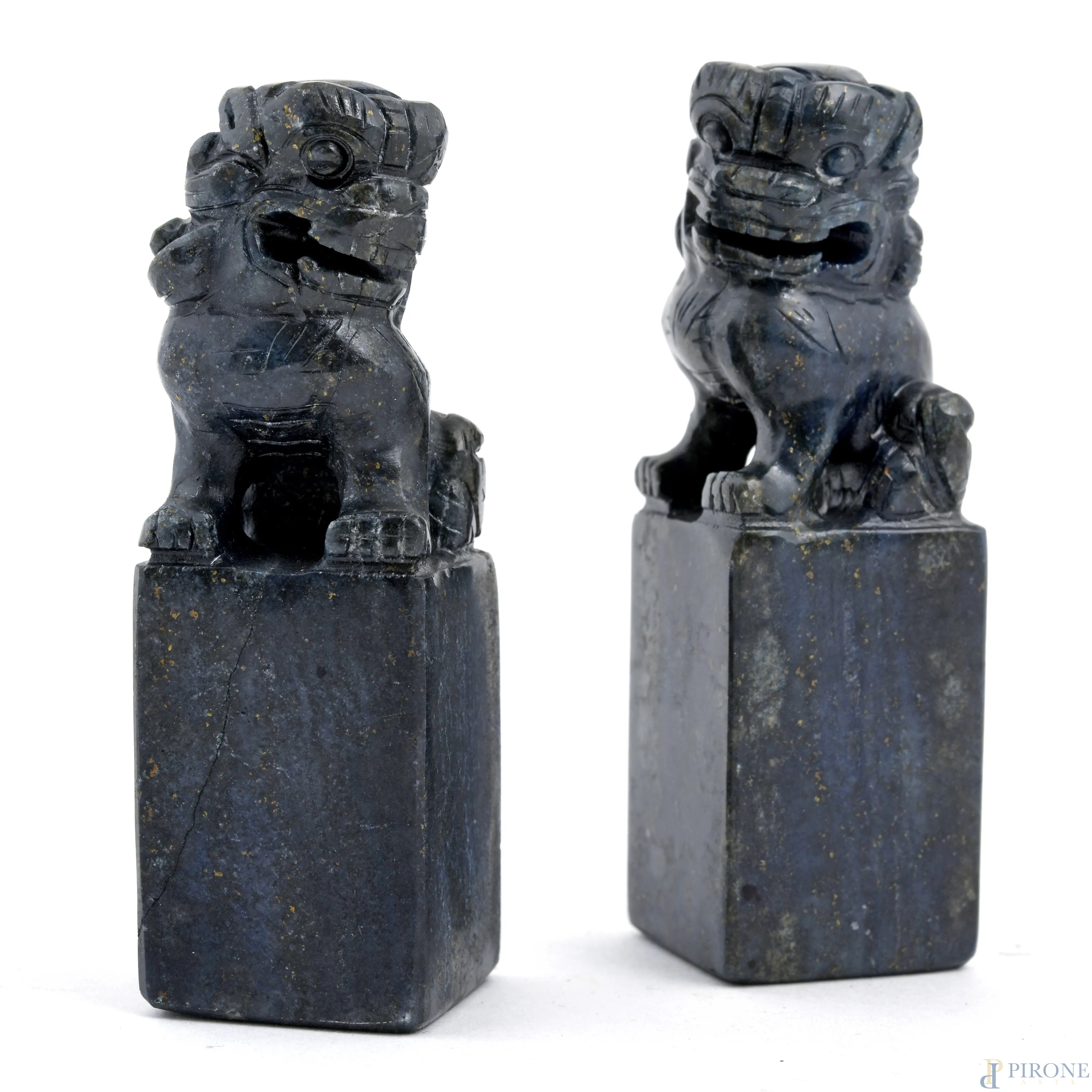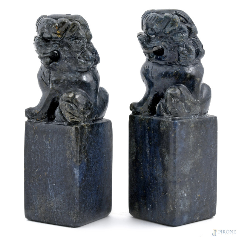 Coppia di sigilli in pietra blu raffiguranti Cani di Pho, altezza cm 9