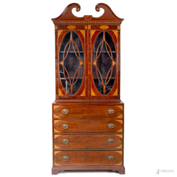 Credenza olandese a doppio corpo in legno impiallacciato e intarsiato a motivi floreali in varie essenze, XIX-XX secolo, cm 179,5x100x50,5, (segni di usura, difetti))