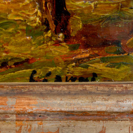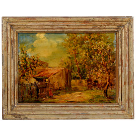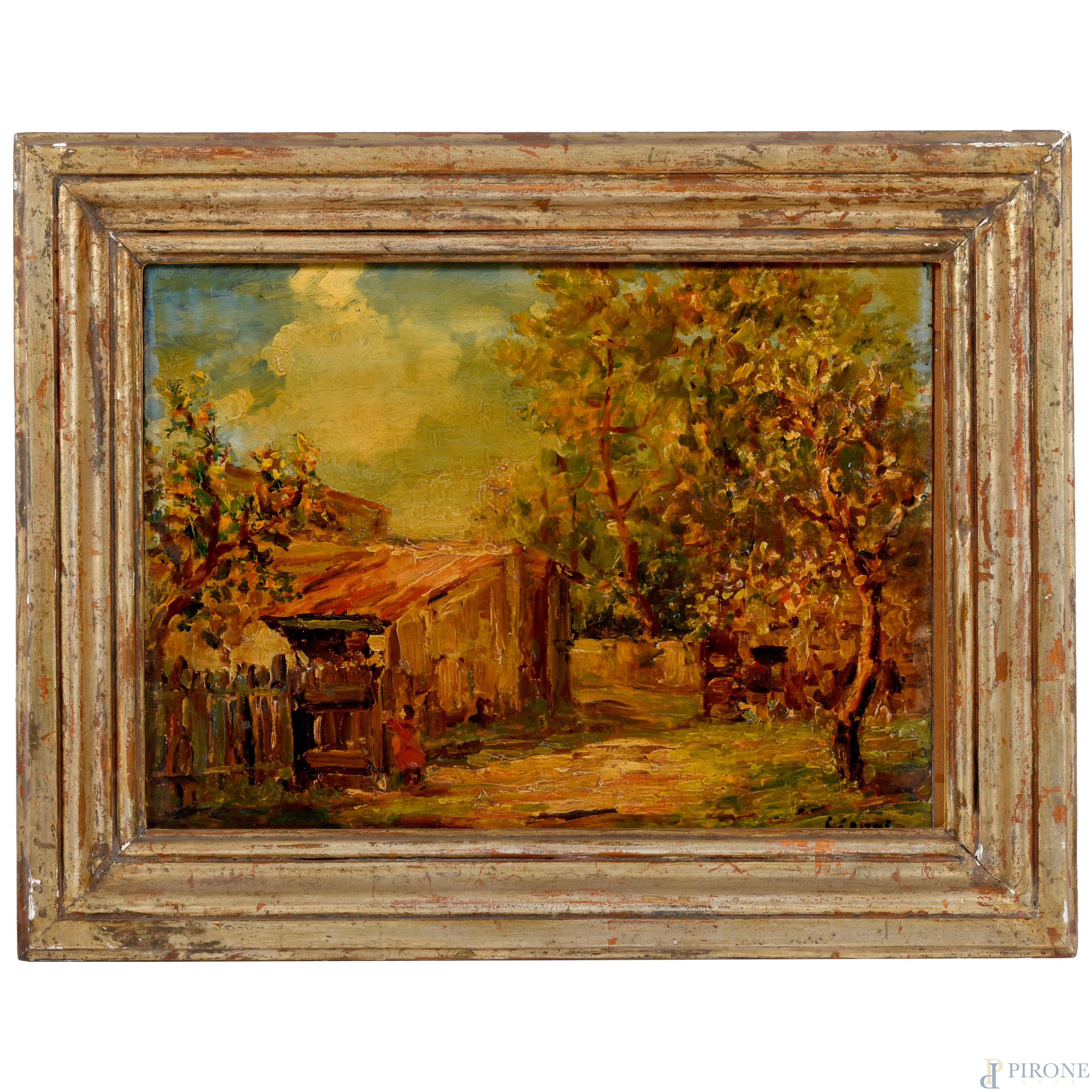 Esterno di casolare, XIX-XX secolo, olio su compensato, cm 25x32,5, firmato in basso a destra, entro cornice