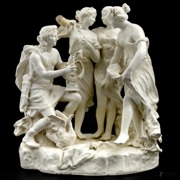 Gruppo in maiolica raffigurante il Trionfo di Bacco e Arianna, Manifattura di Bassano, XIX secolo, cm 25x42,5x18,5 (rotture, scheggiature, mancanze, restauri diffusi)
