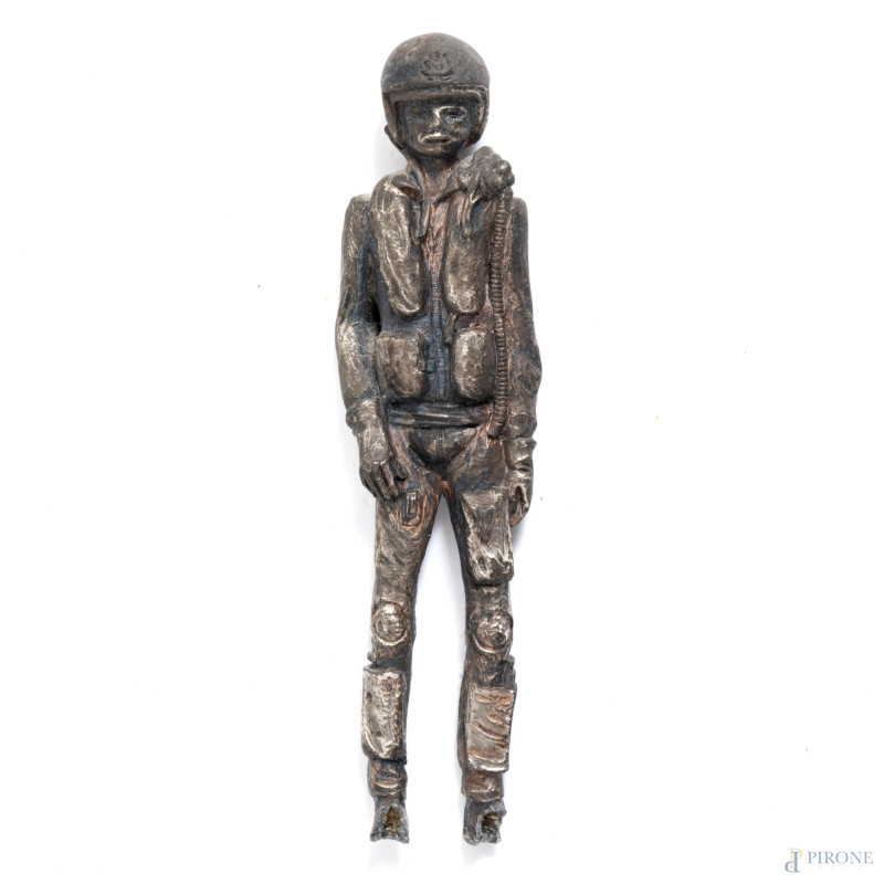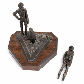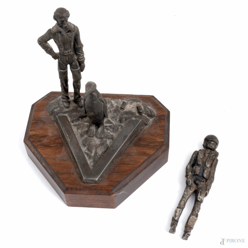 Gruppo in peltro argentato raffiguranti piloti con pinguino su base in legno, XX secolo, cm 18x16x13,5 (rotture, segni di usura, difetti)
