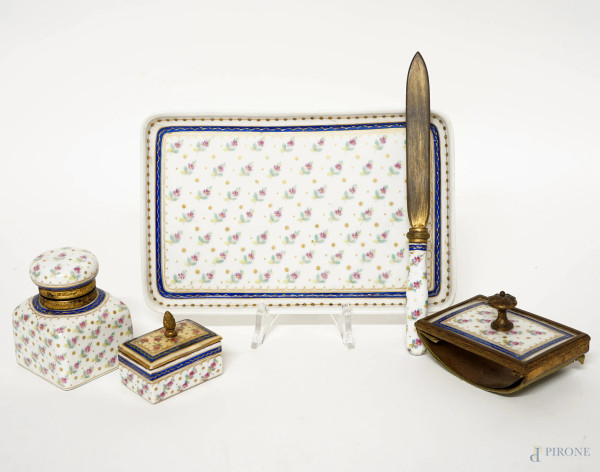 Lotto composto da una zuppiera in porcellana bianca e blu, Richard Ginori, e da una bottiglia in vetro nel toni del blu, misura max cm 15,5x30,5 (difetti)