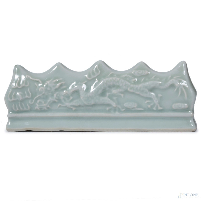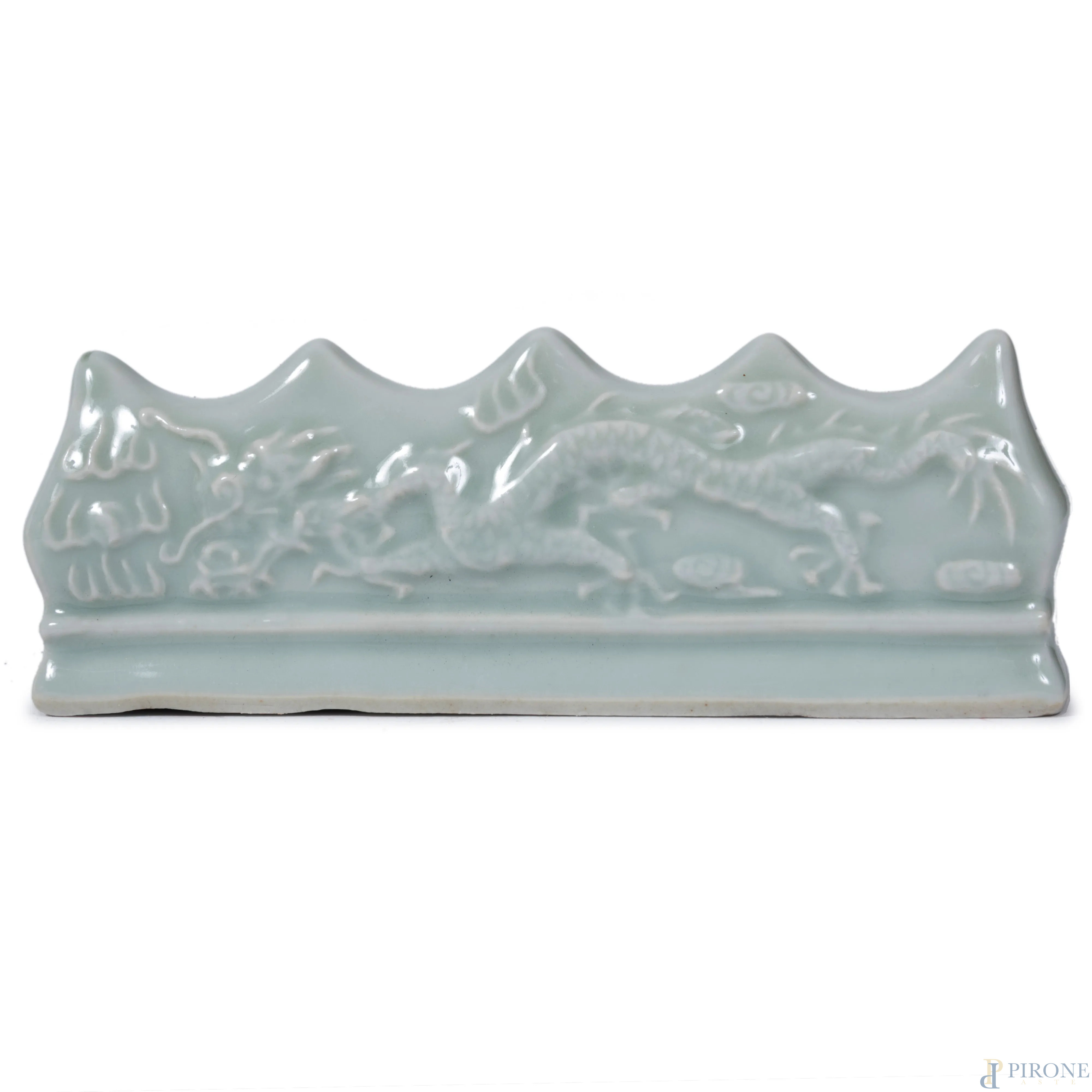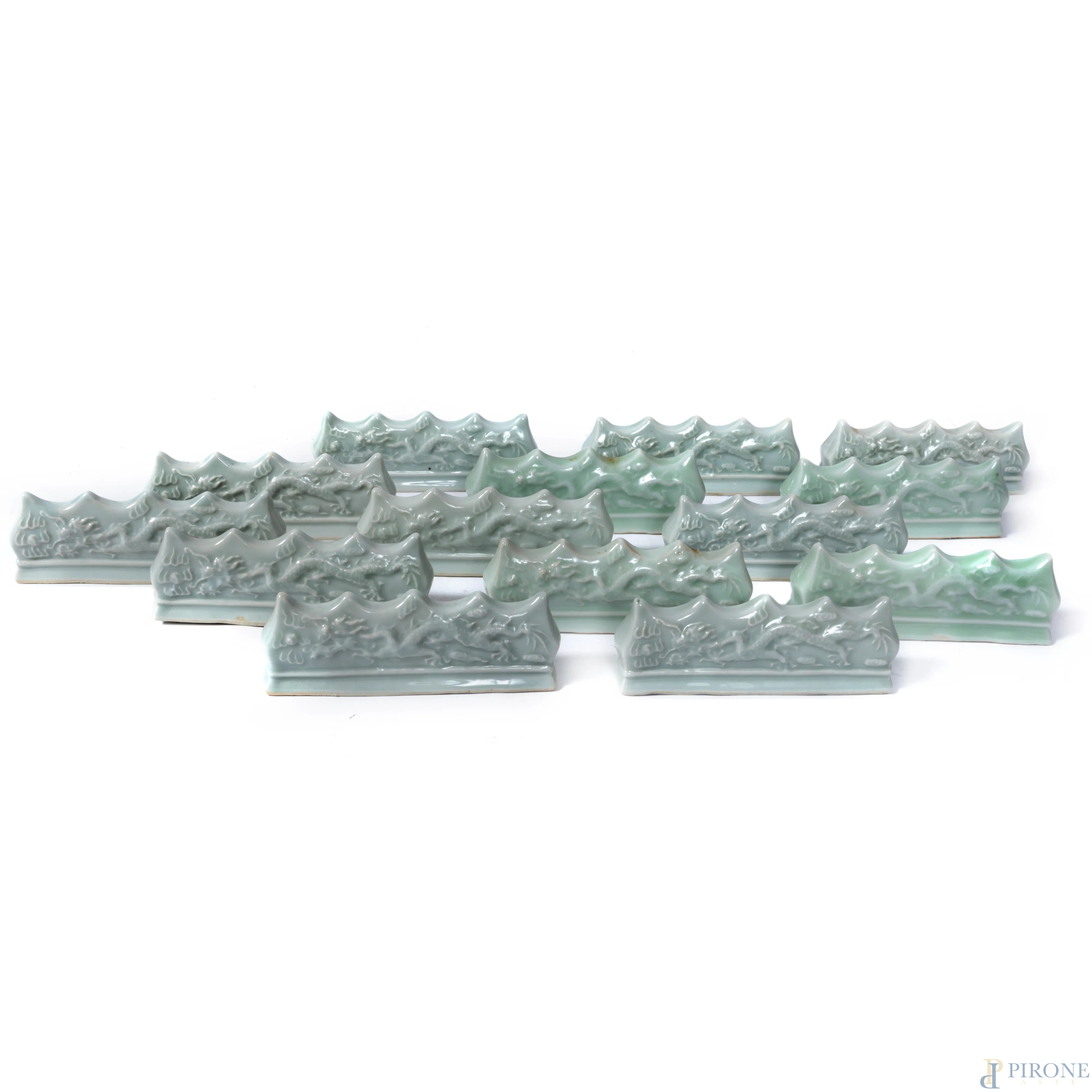 Lotto di 14 segnaposto in porcellana cinese con rilievi di dragoni. Cina, XX secolo, cm 5x13x2
