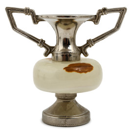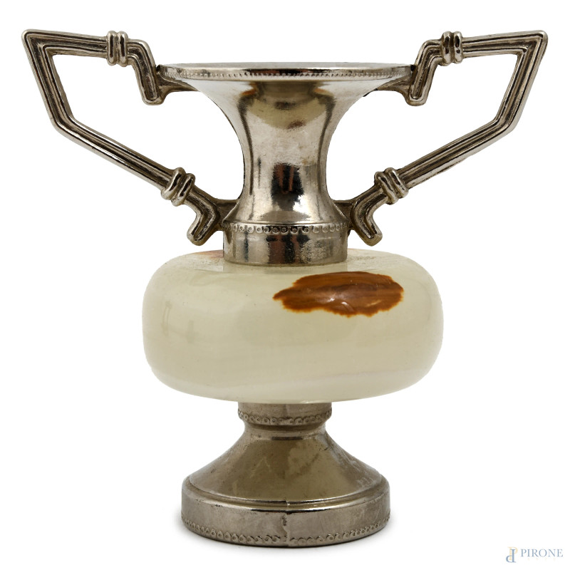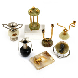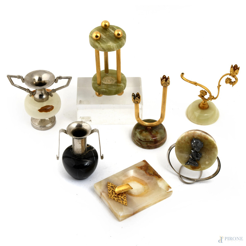 Lotto di 7 oggetti in marmo e metallo, altezza massima cm 10,5, (difetti, sbeccature)