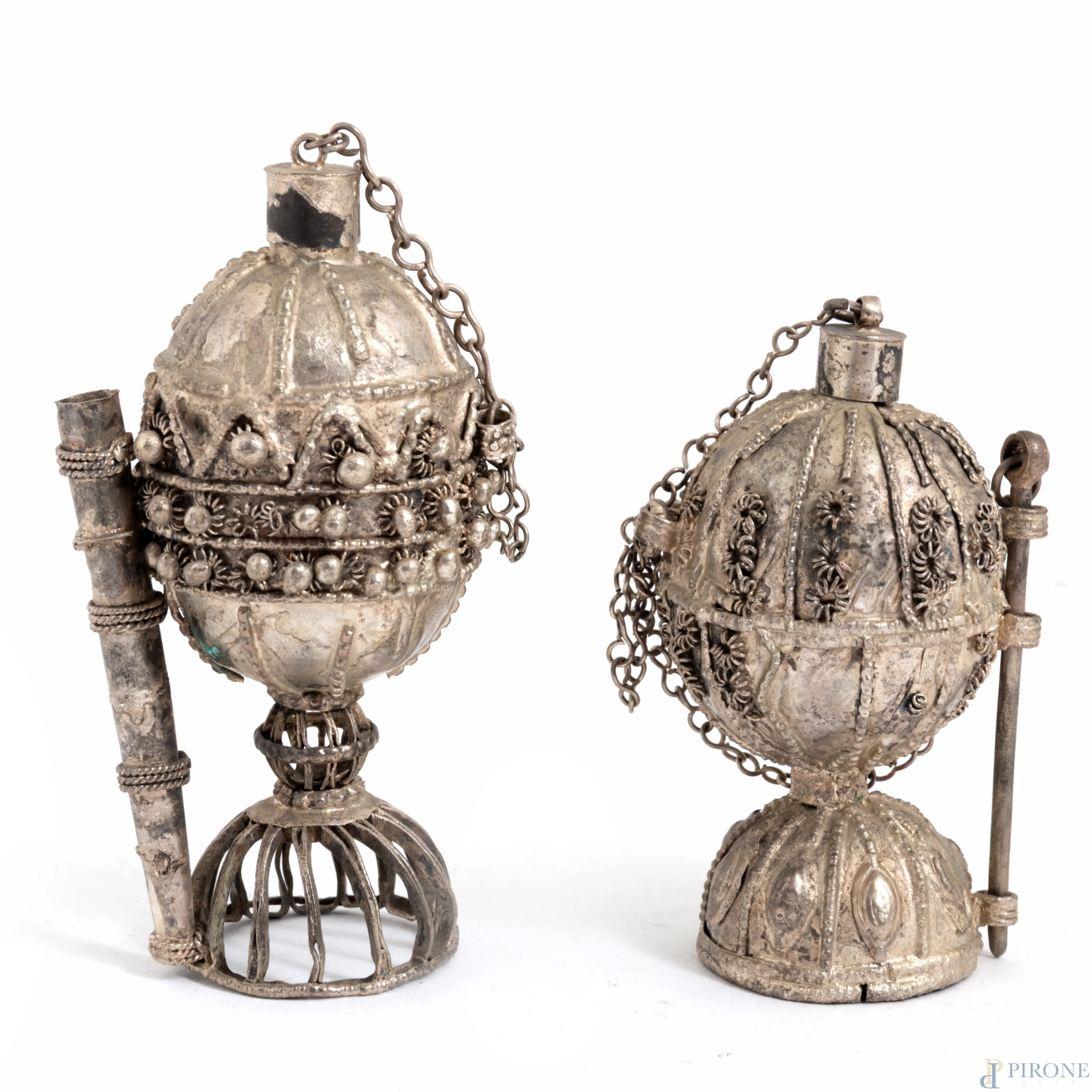 Lotto di due incensieri mediorientali in metallo argentato finemente cesellato, XX secolo, altezza cm 10 (segni di usura)