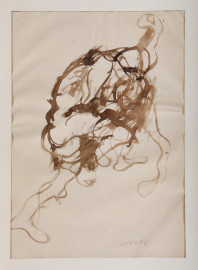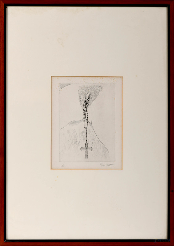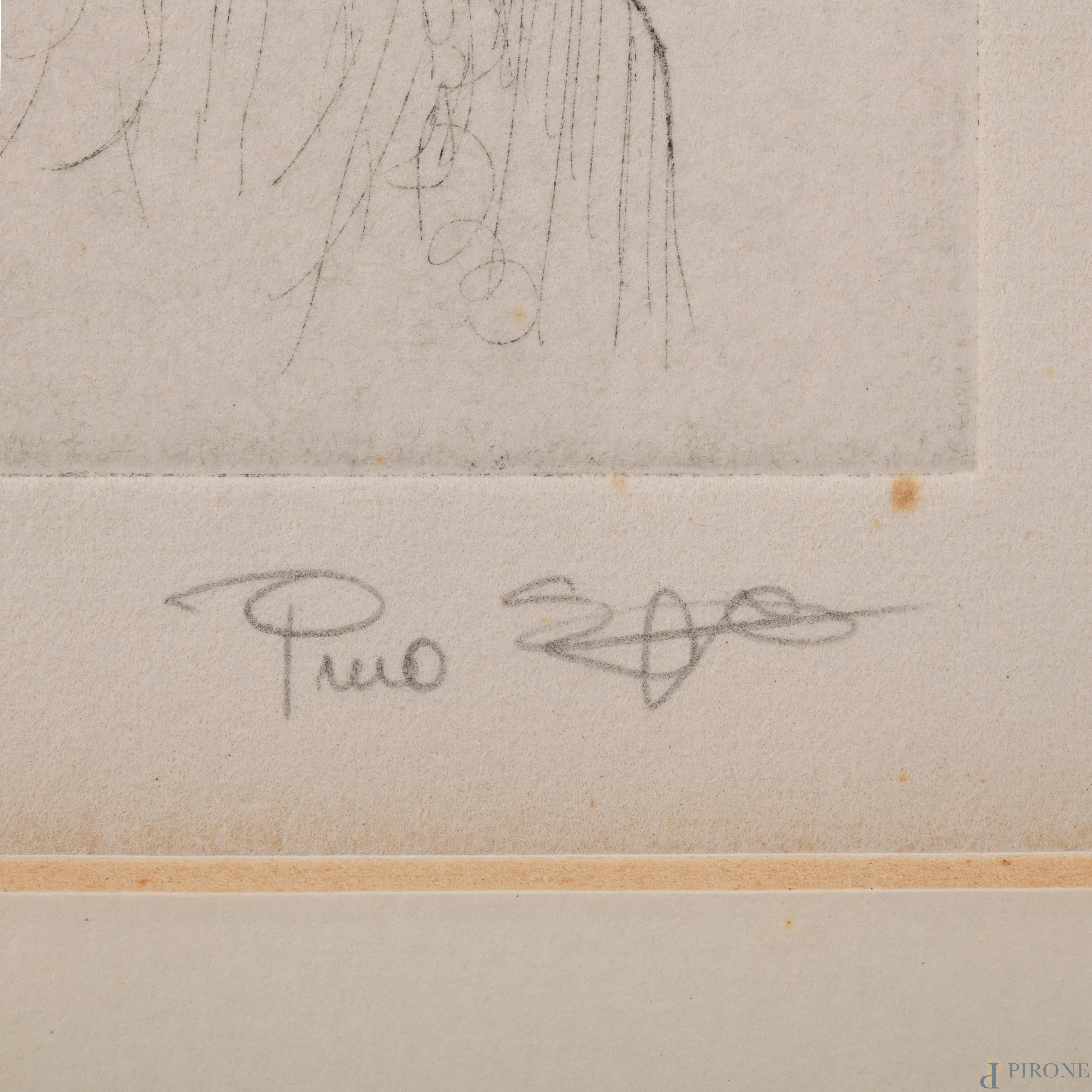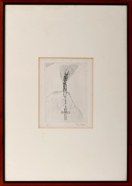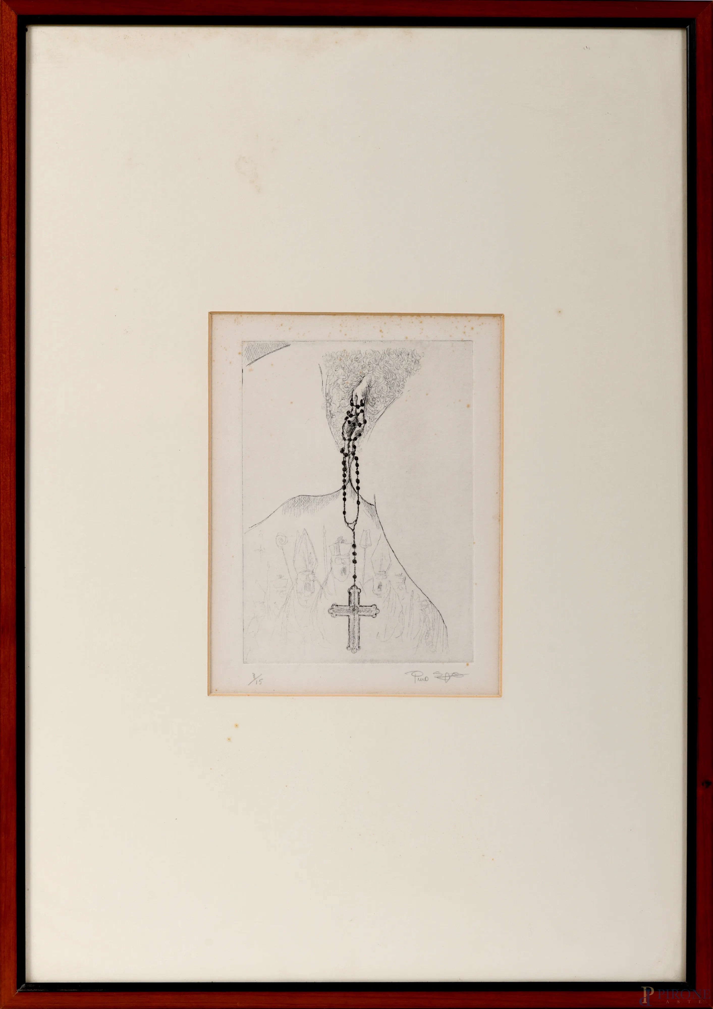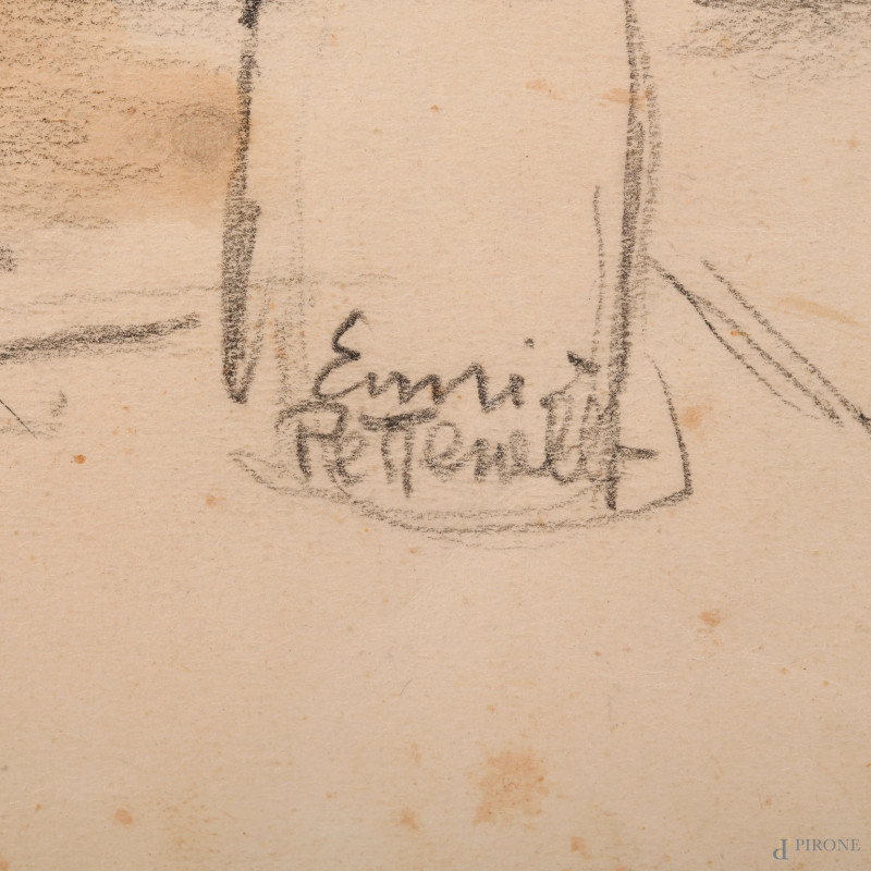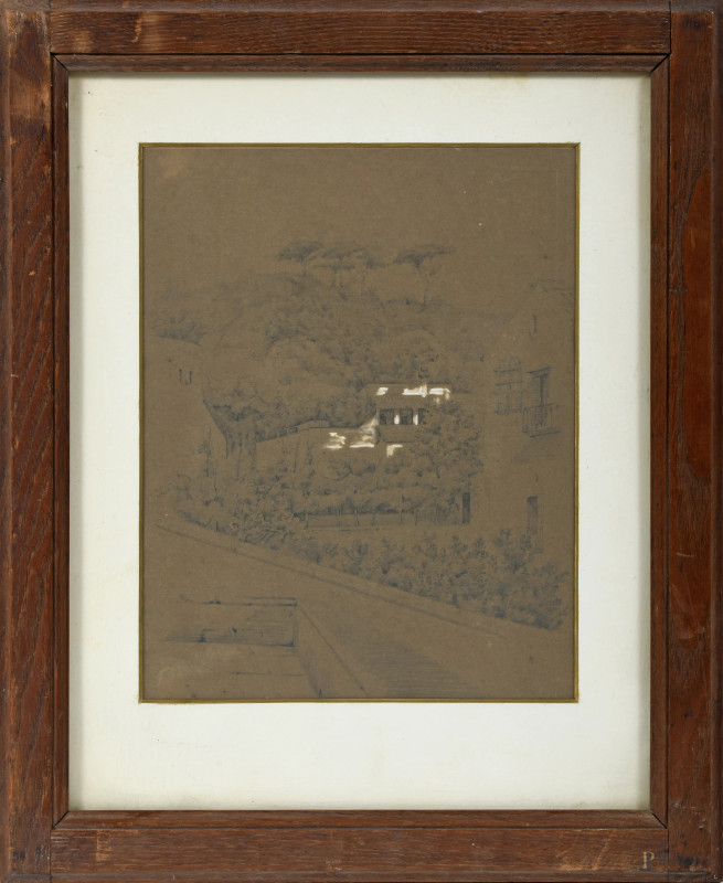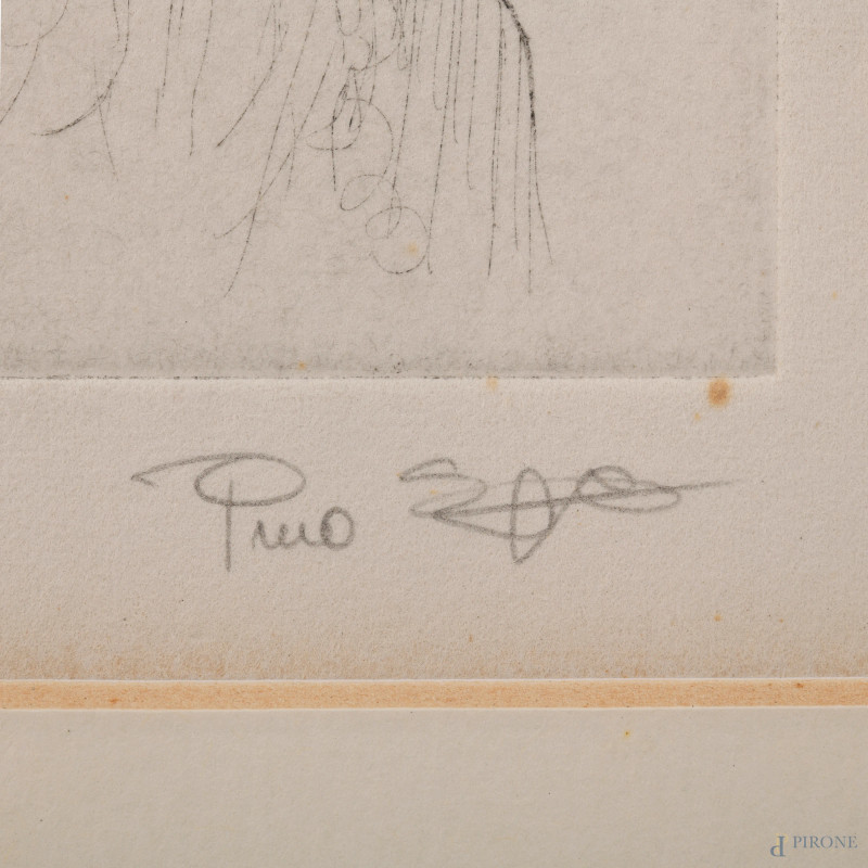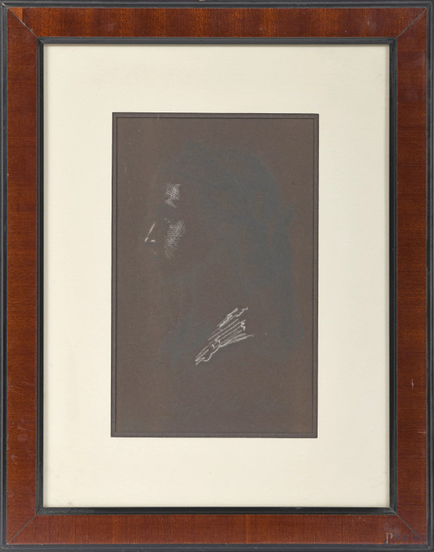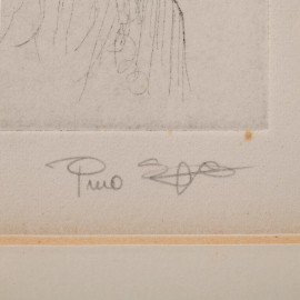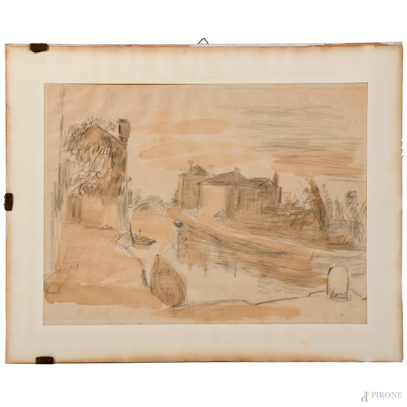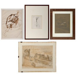 Lotto di quattro disegni a tecnica mista su carta e una litografia, XX secolo, misure massime cm 23x33, (difetti)