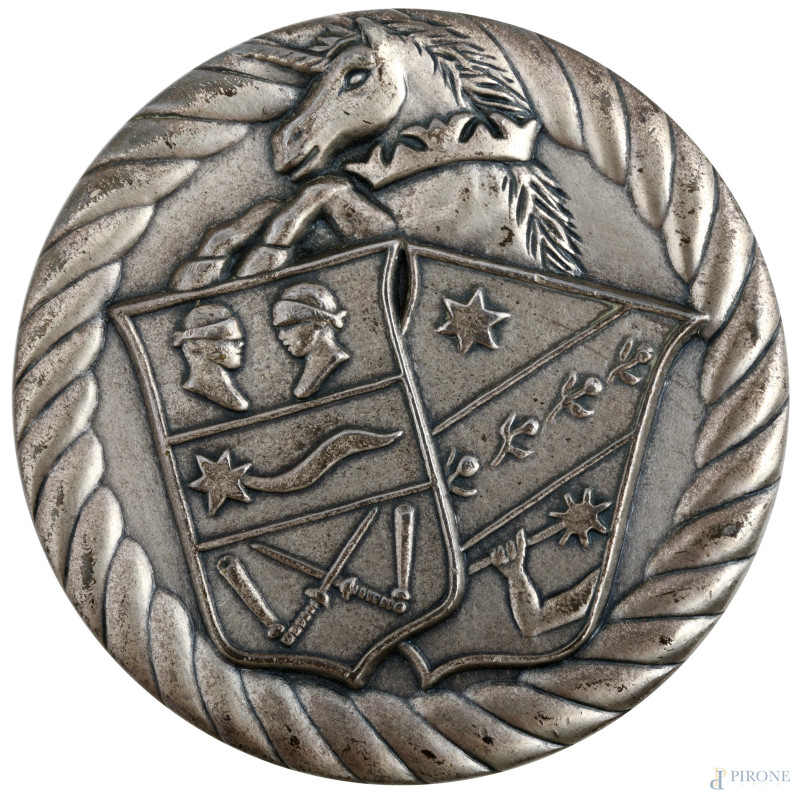 Medaglia in metallo argentato con stemma centrale, XX secolo, (difetti)