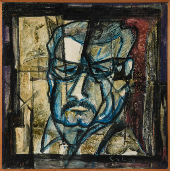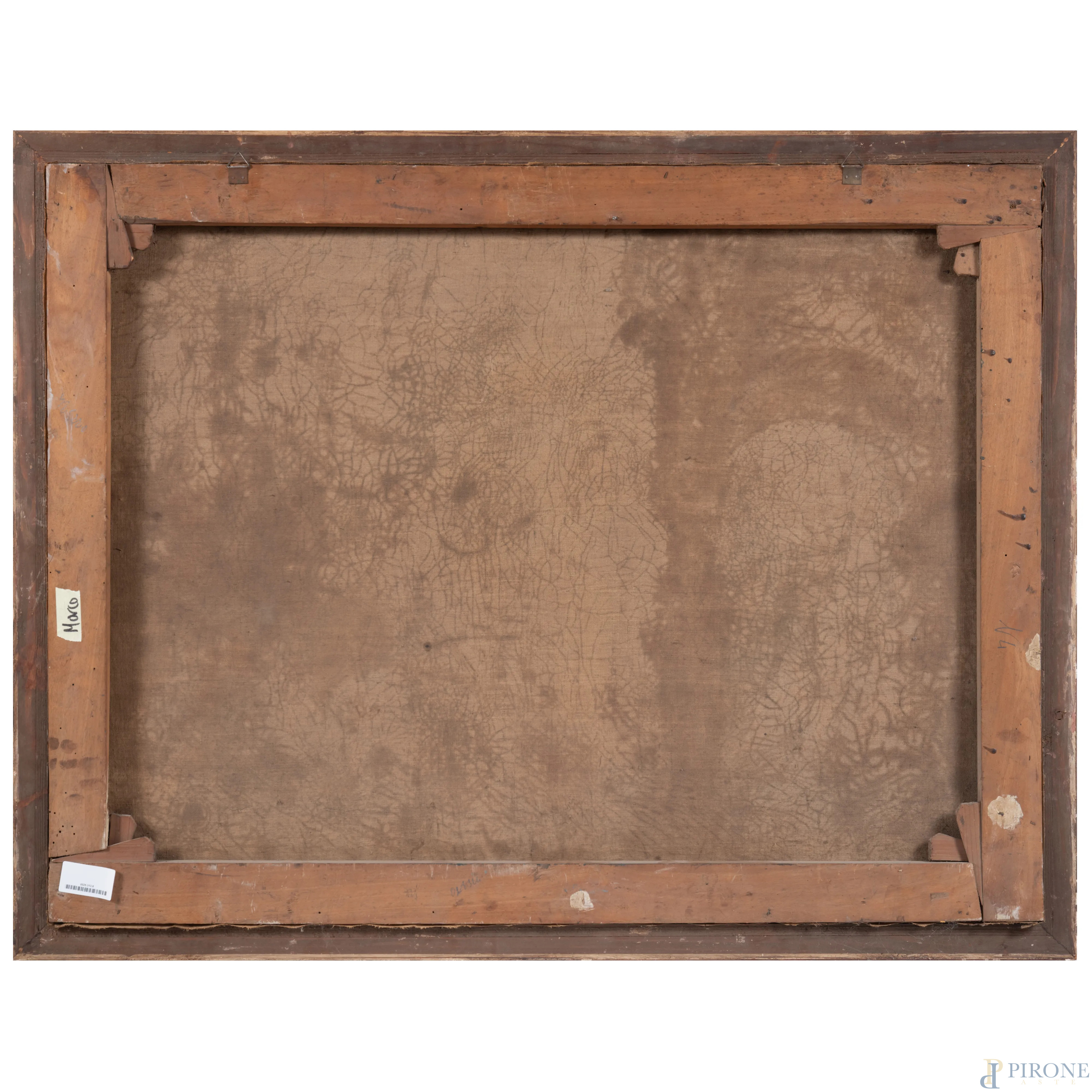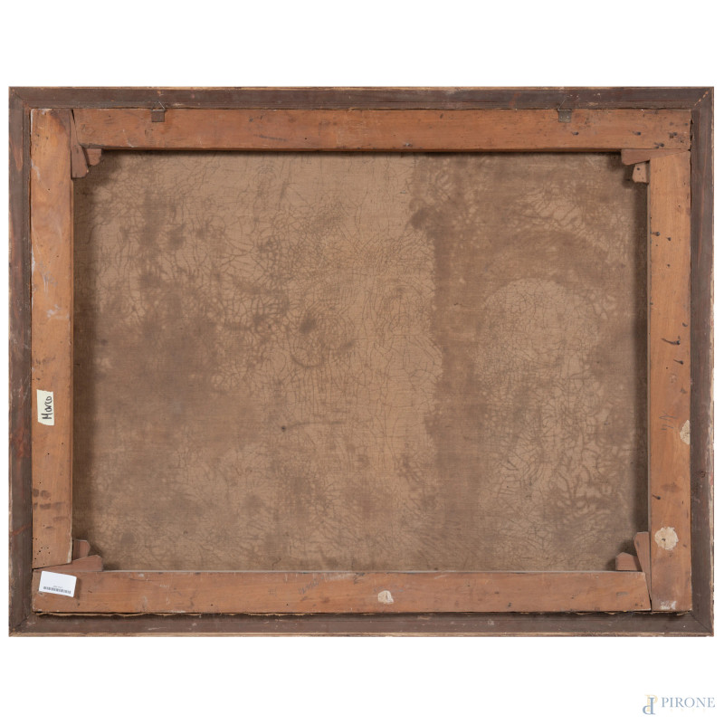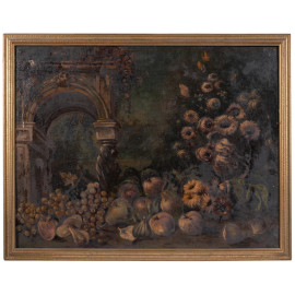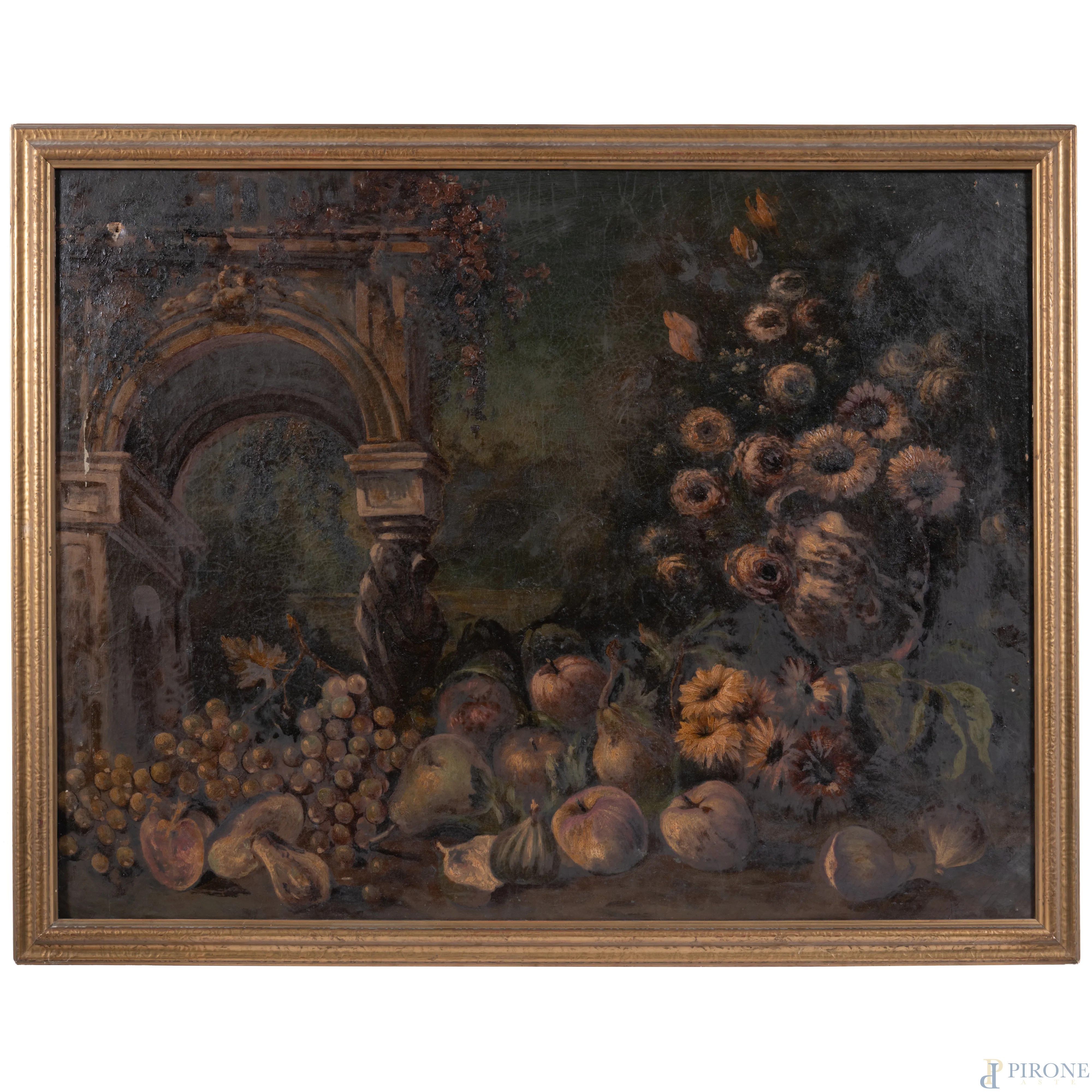 Natura morta con fiori e frutta in architettura, XX secolo, olio su tela, cm 79x103, entro cornice, (cadute di colore, rottura della tela)