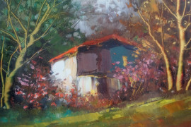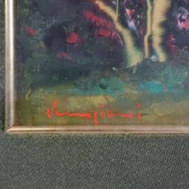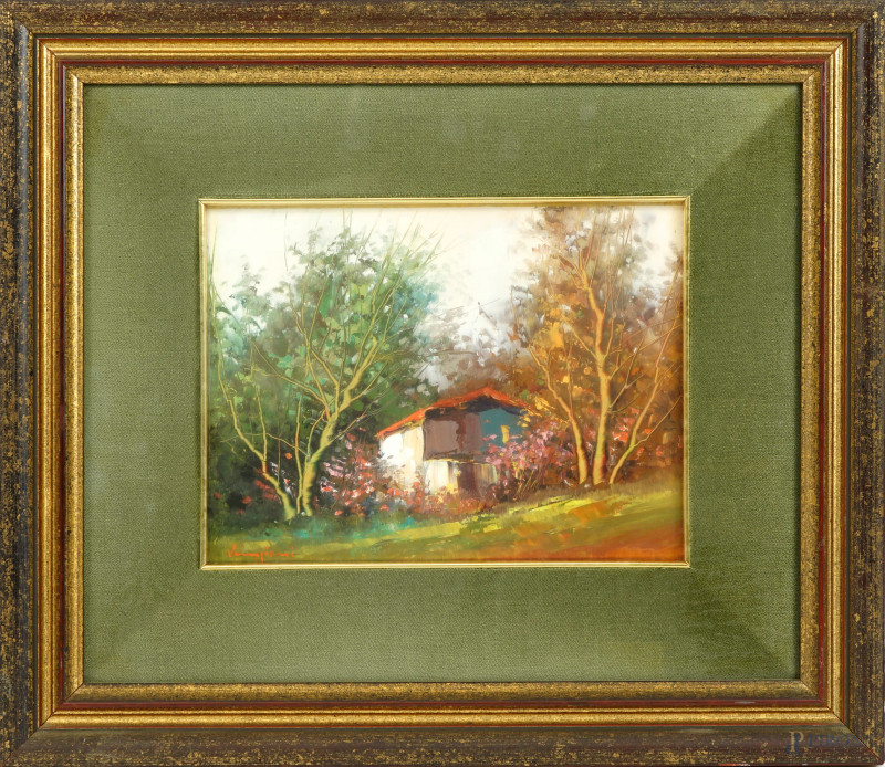 Paesaggio con casa, serigrafia su lastra, cm 16x21,5, firmato Veneziani, entro cornice