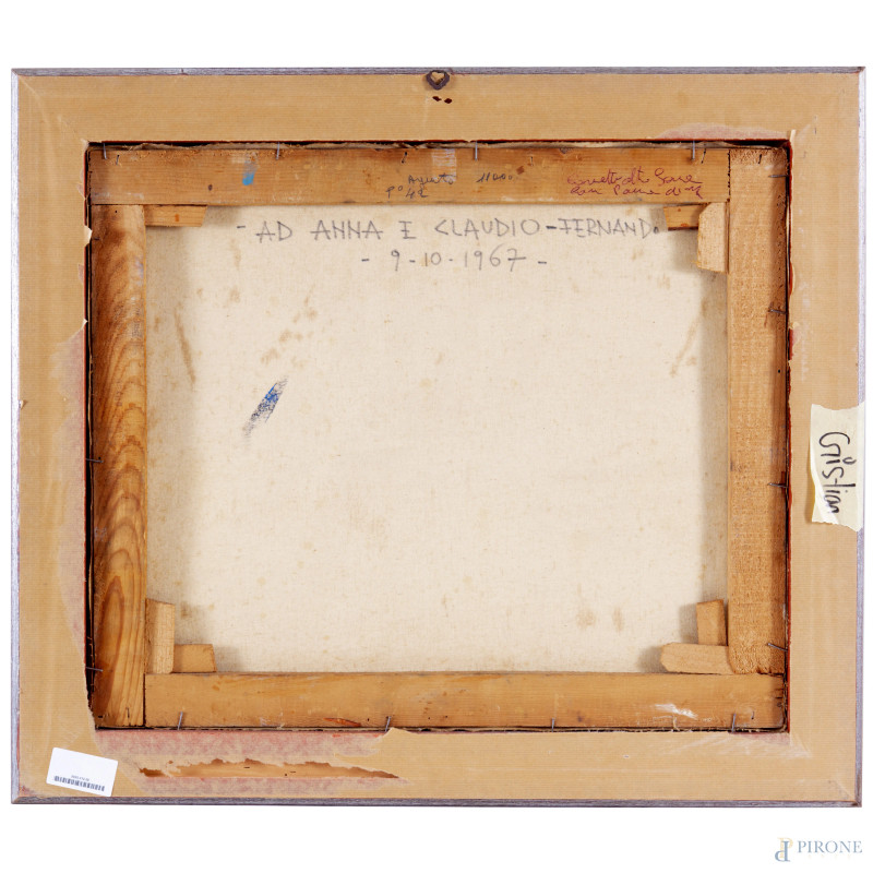 Porto con imbarcazioni, olio su tela, cm 50x60, firmato in basso a destra, entro cornice, (ondulazioni della tela)