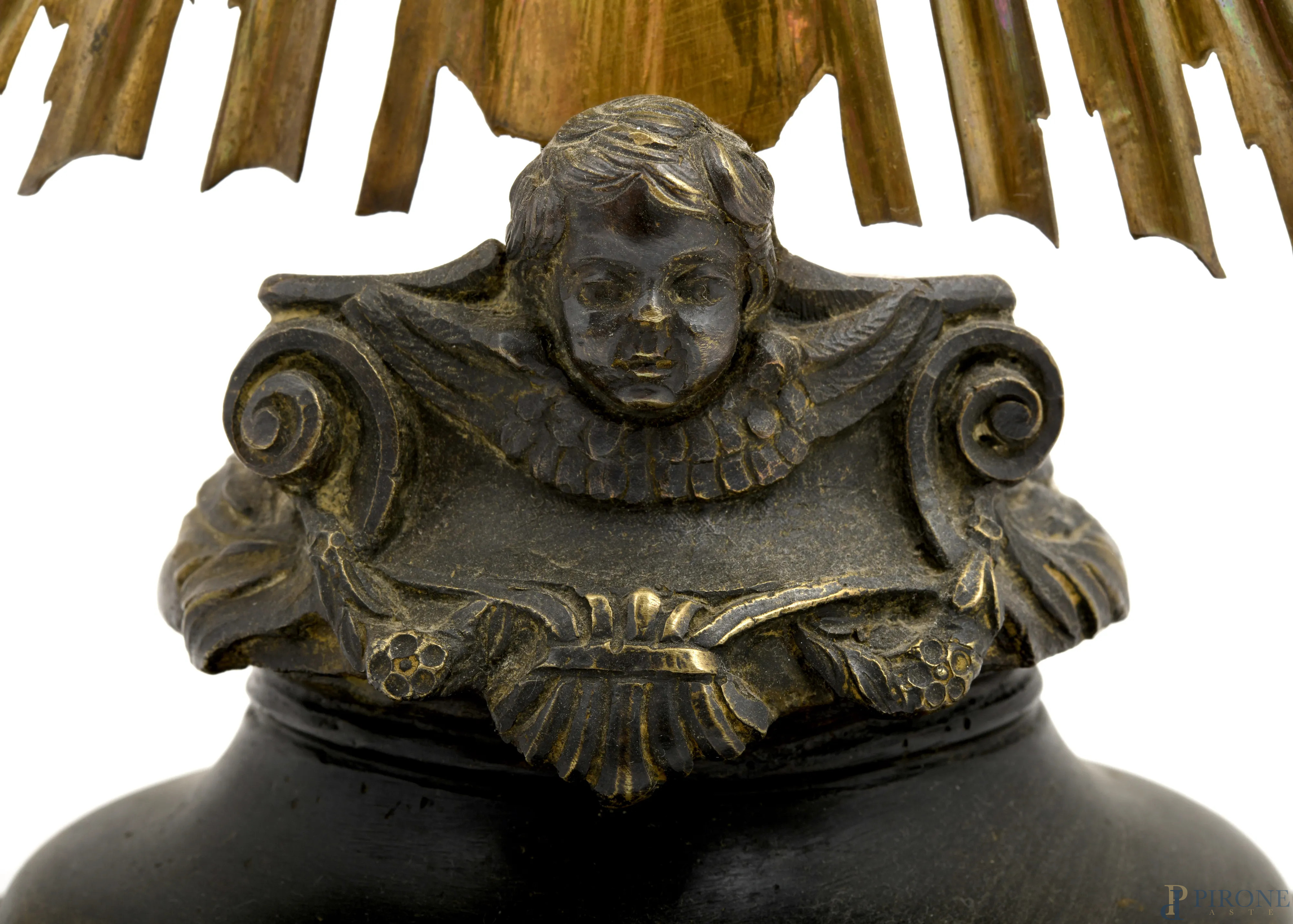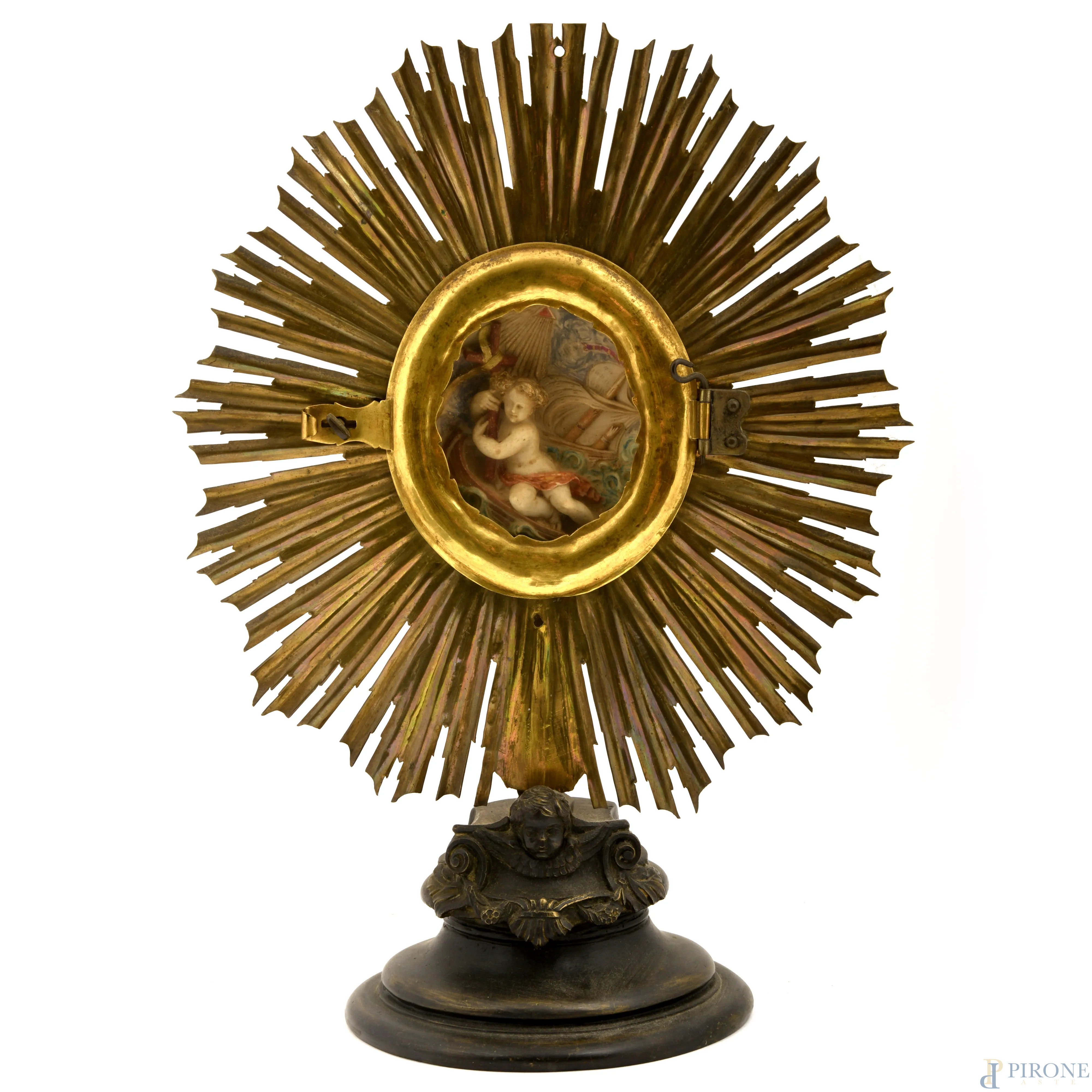 Reliquiario a raggiera con bassorilievo in stucco, XIX scolo, cm 39x27x15, (difetti).