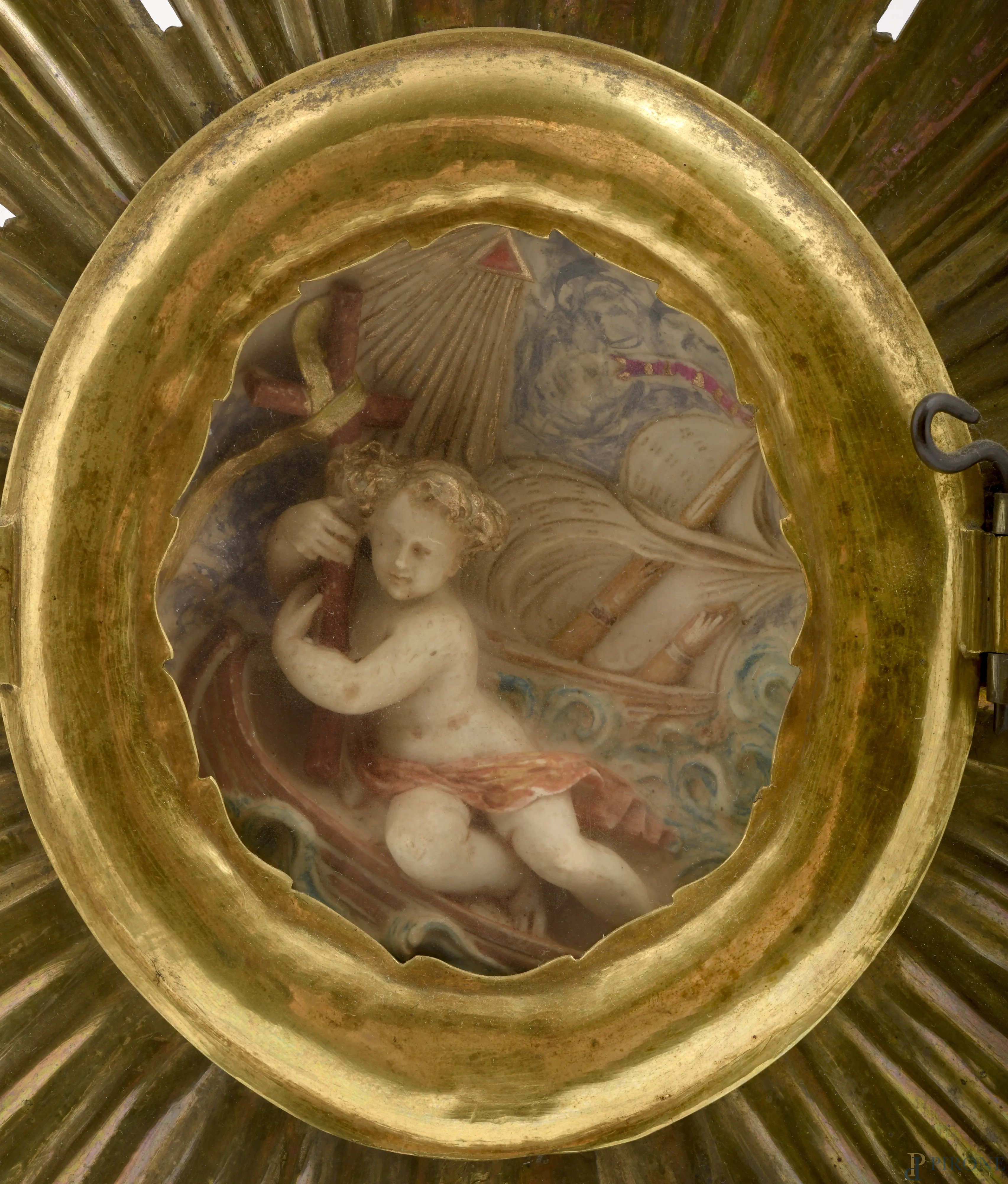 Reliquiario in bronzo dorato e cesellato caratterizzato da una raggiera con decorazioni a fiamma. Al centro, all'interno di una cornice circoalre in bronzo dorato, è collocato un bassorilievo raffigurante Gesù Bambino che porta la croce in stucco policromo. La base è formata da un supporto saomato in bronzo con elementi ornamentali tra cui testine di cherubini e volute.