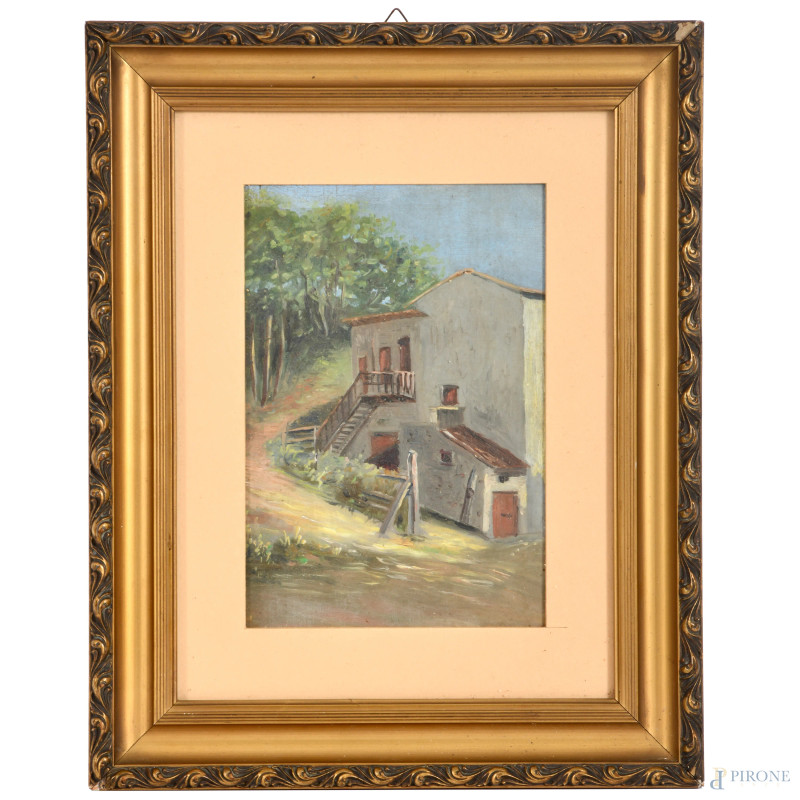 Scorcio con casolare, olio su tavoletta, XX secolo, cm 29x21,5 compreso passepartout entro cornice