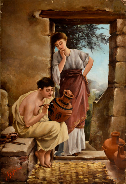 Arricchito da dettagli cesellati e applicazioni in bronzo dorato a motivo fogliato e rocaille. Il piano presenta una placchetta ovale dipinta, raffigurante un paesaggio con uccelli in volo, incastonata in un coperchio che rivela un vano foderato in tessuto. Gmbe tornite e scanalate, collegate da crociera sagomata con elemento centrale decorativo.