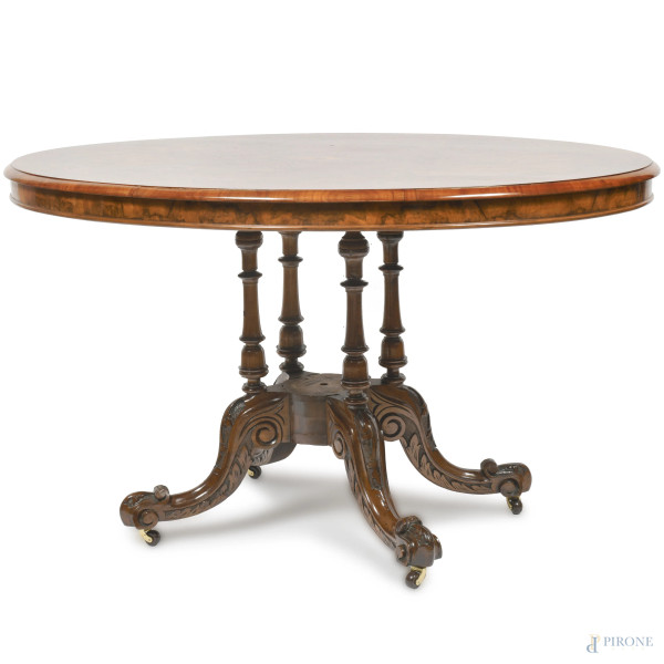 Tavolino con piano circolare in ceramica turchese decorata con ritratti, con struttura in bronzo dorato e cesellato, XIX secolo, cm 72x49,5, ( segni di usura, difetti)