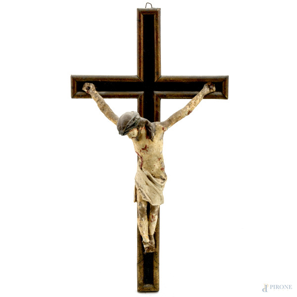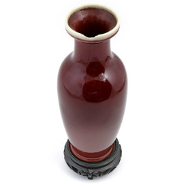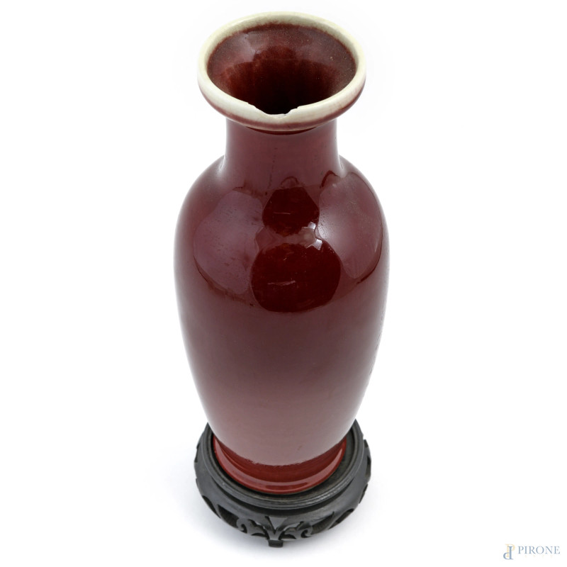 Vaso in porcellana sangue di bue con base in teak, XX secolo, altezza cm (rotture, scalfiture, cadute di colore)