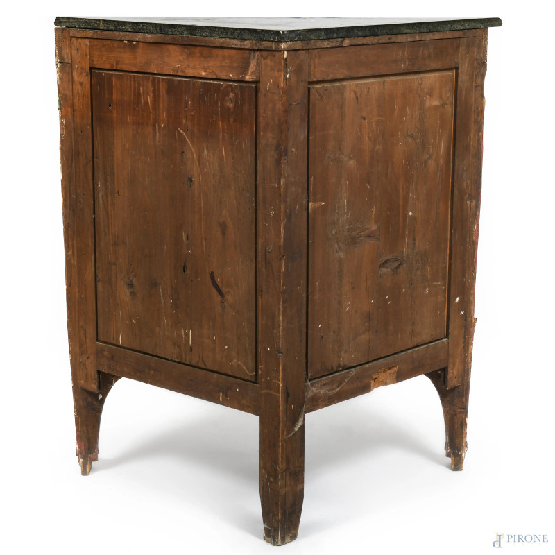 Angoliera in legno dipinto e intagliato a motivi vegetali e floreali con piano in marmo, XIX - XX secolo, cm 110x103x60,(segni di usura, scalfiture, graffi, piccole rotture, cdute di colore e doratura)