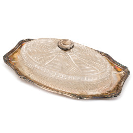 Antipastiera composta da vassoio in argento, vaschette e coperchio in cristallo con presa in argento, XX secolo, misure massime cm 16,5x50,5x31,5, peso vassoio gr 1600