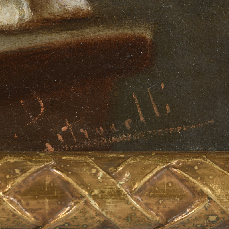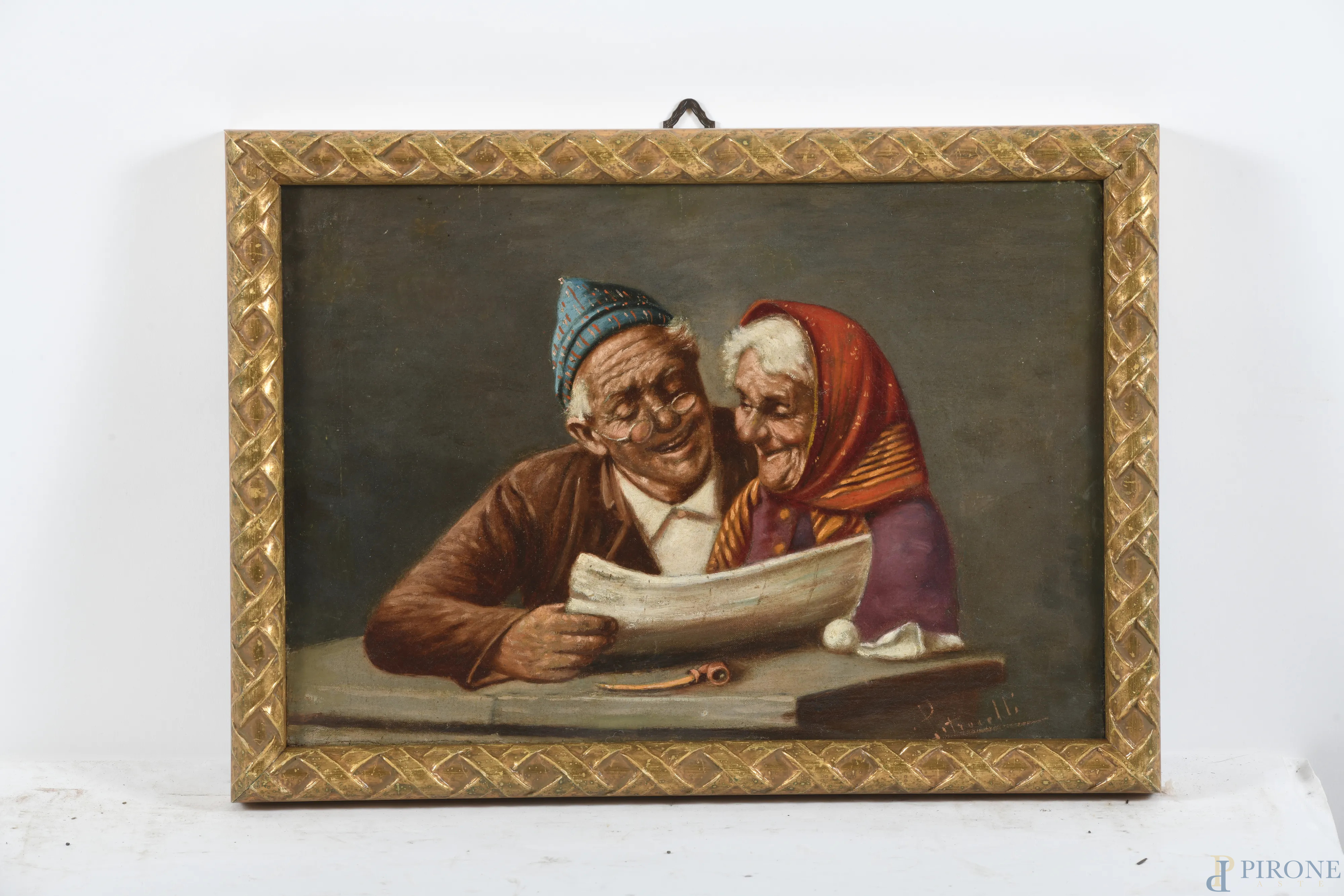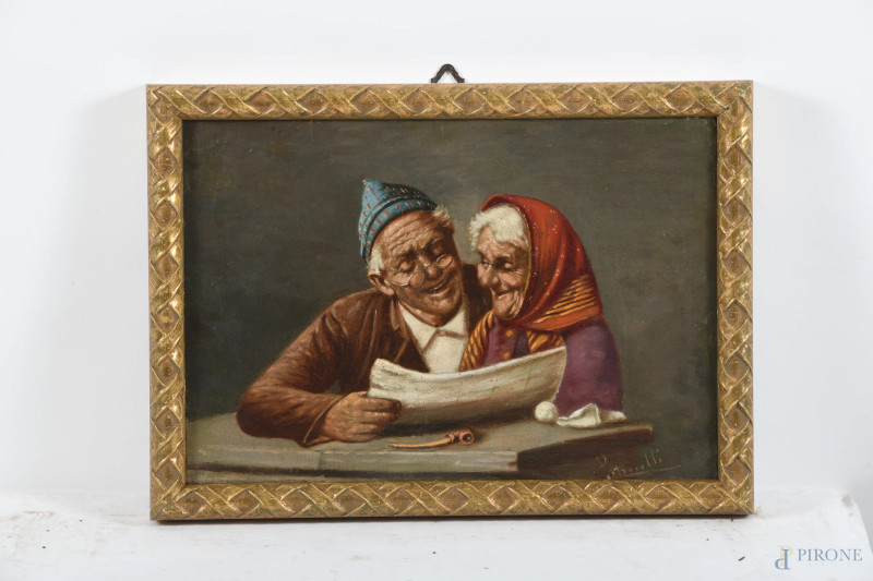 Anziani in lettura, XX secolo, olio su tela, cm 27x38,5, firmato in basso, entro cornice, (sollevamenti di colore, abrasioni, segni di battitura del telaio)