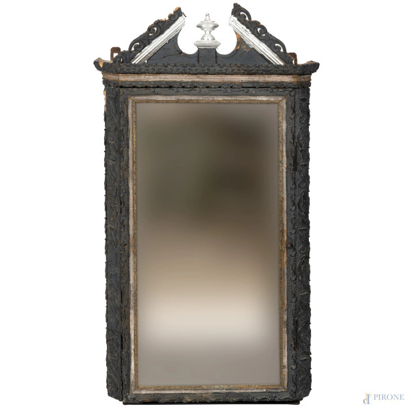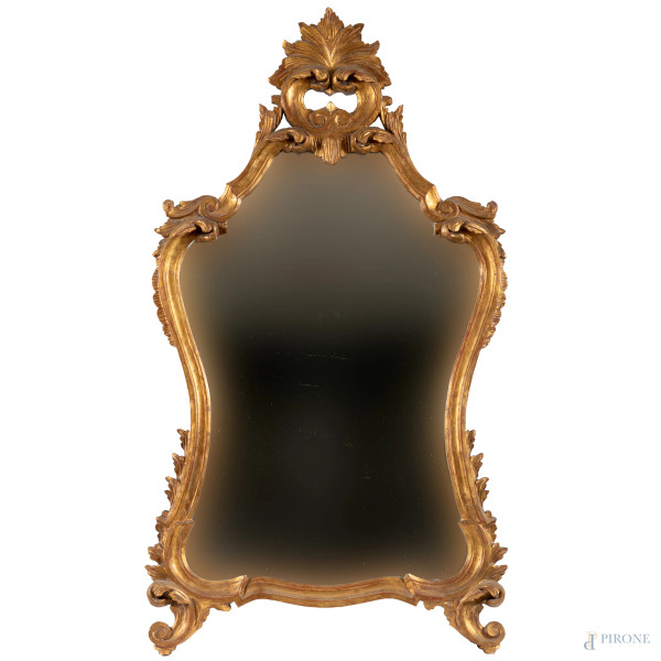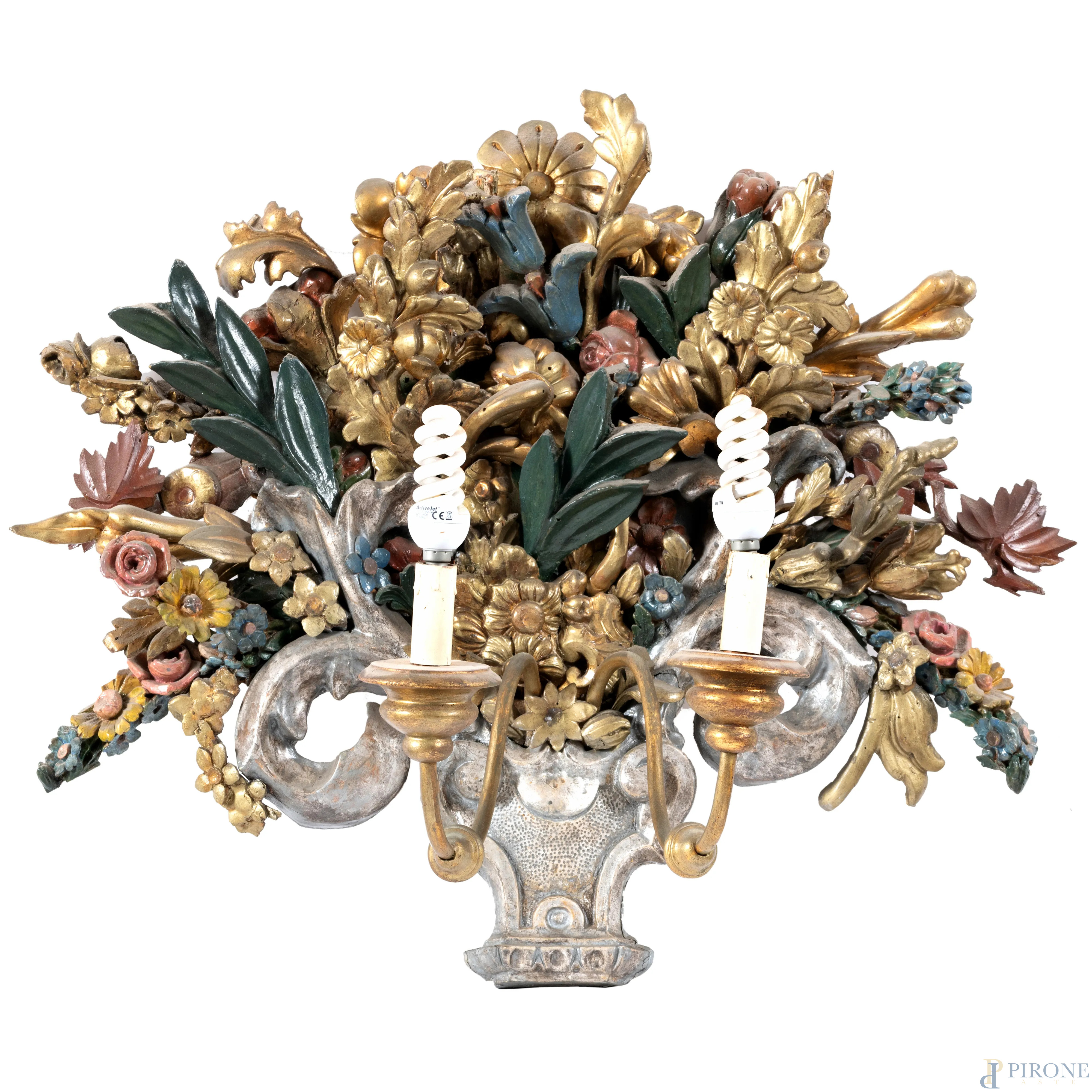 Applique a due luci in legno dorato e dipinto in policromia e intagliato a racemi vegetali e fiori, XX secolo, cm 57,5x68x31, (segni di usura, difetti, da revisionare)