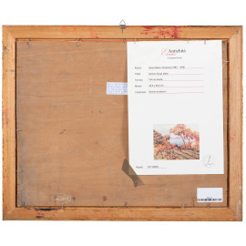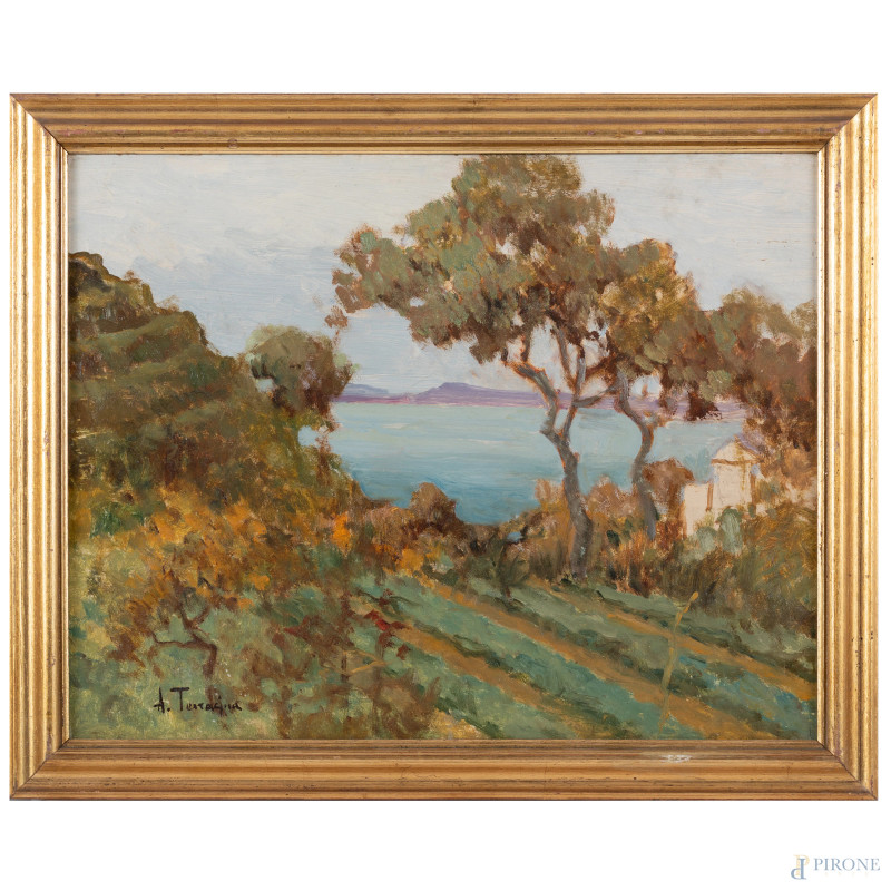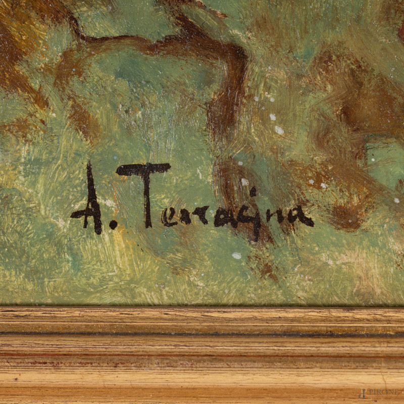 Arturo Bacio Terracina, Scorcio fra gli alberi, olio su tavoletta, cm 36,5x46,5, firmato in basso a sinistra, entro cornice