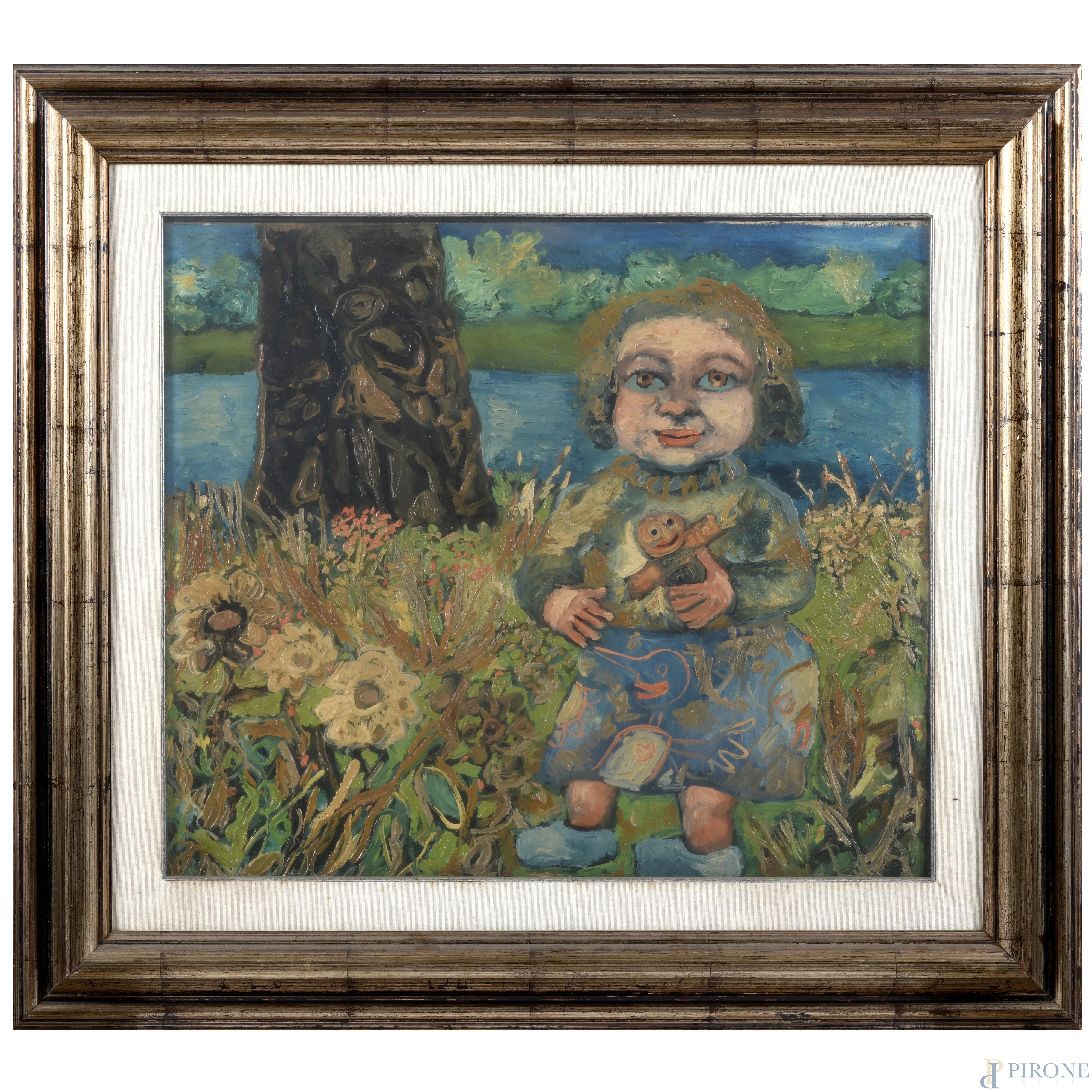 Bambina con bambola, olio su tela, cm 80x110, firmato 55x64, entro cornice