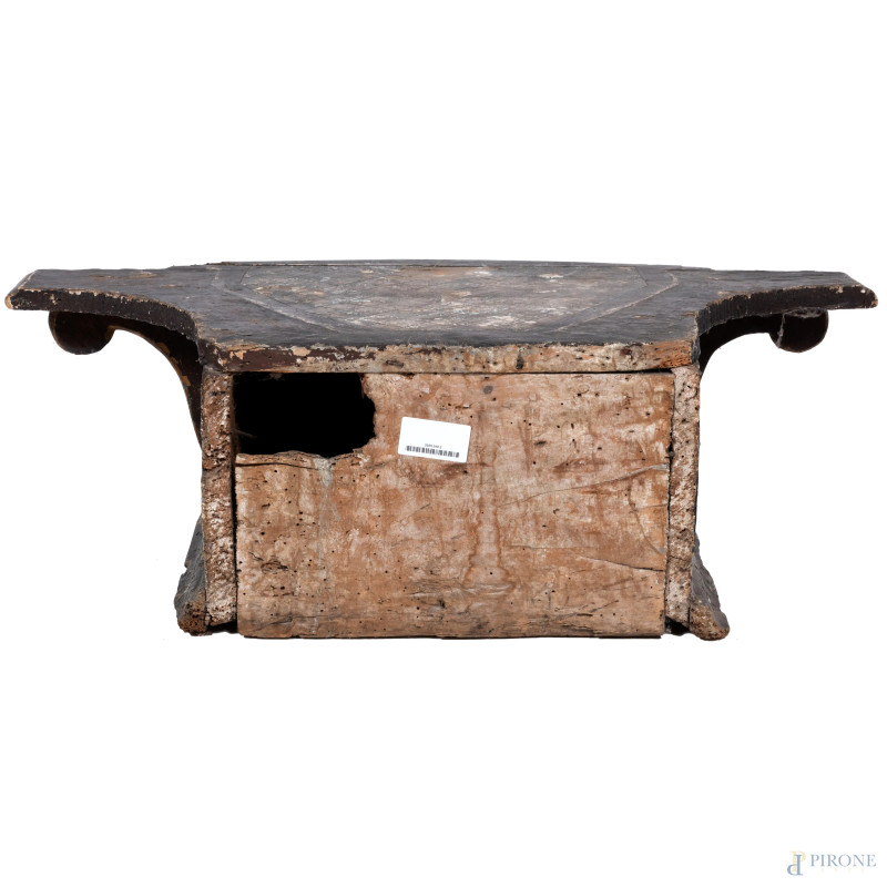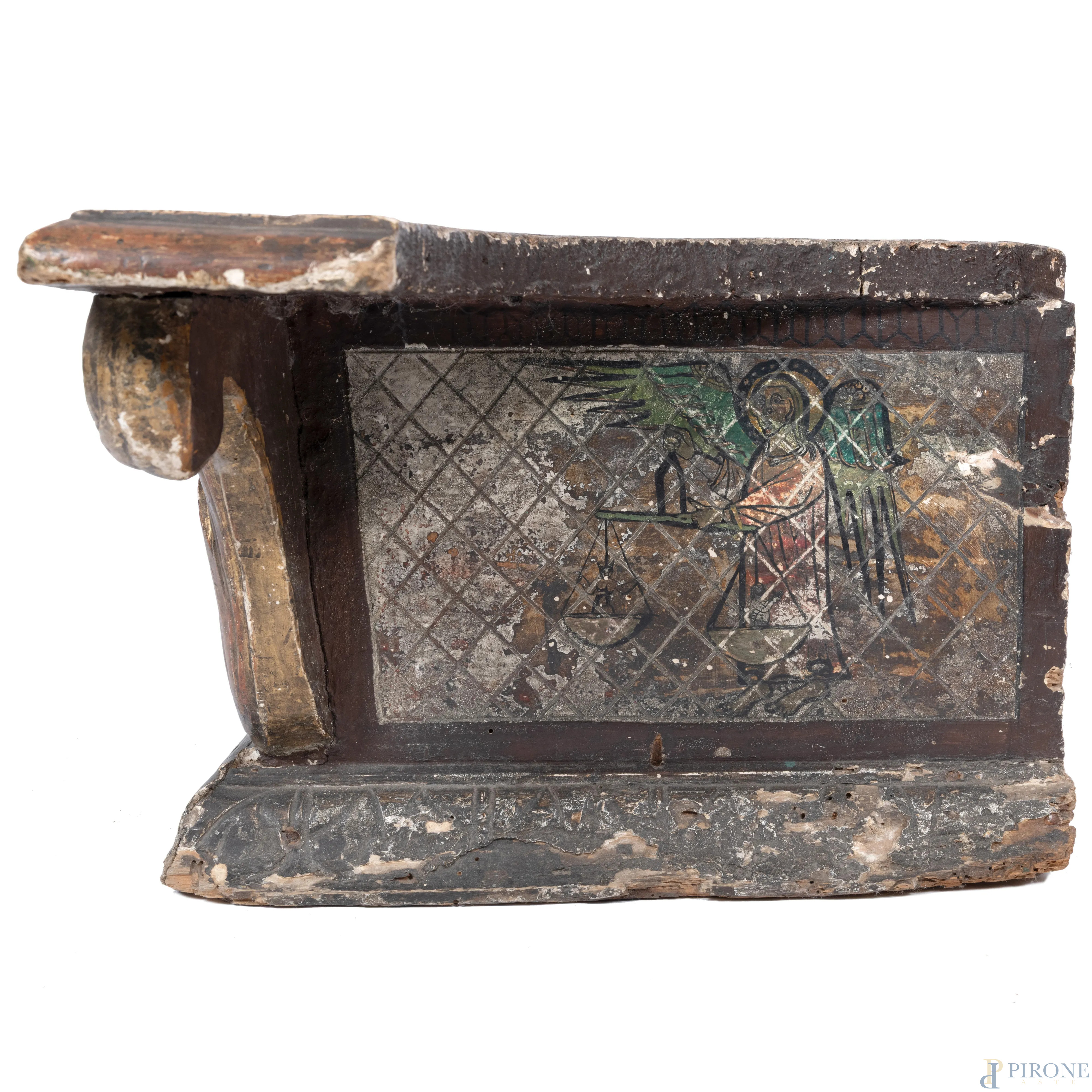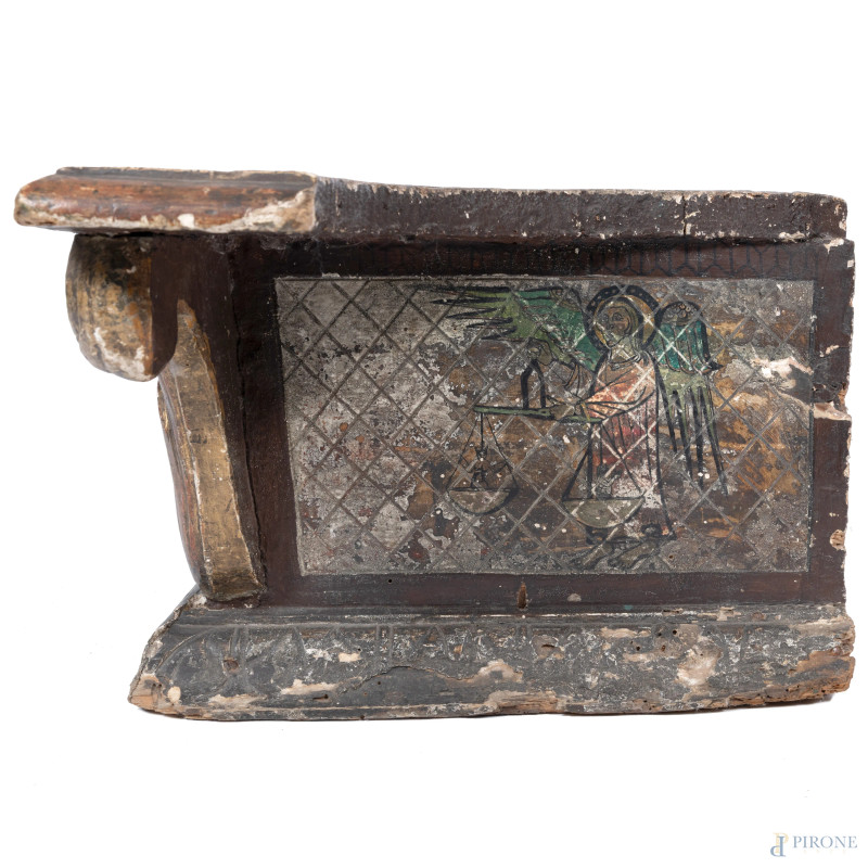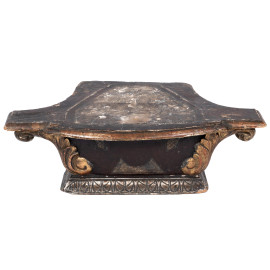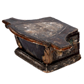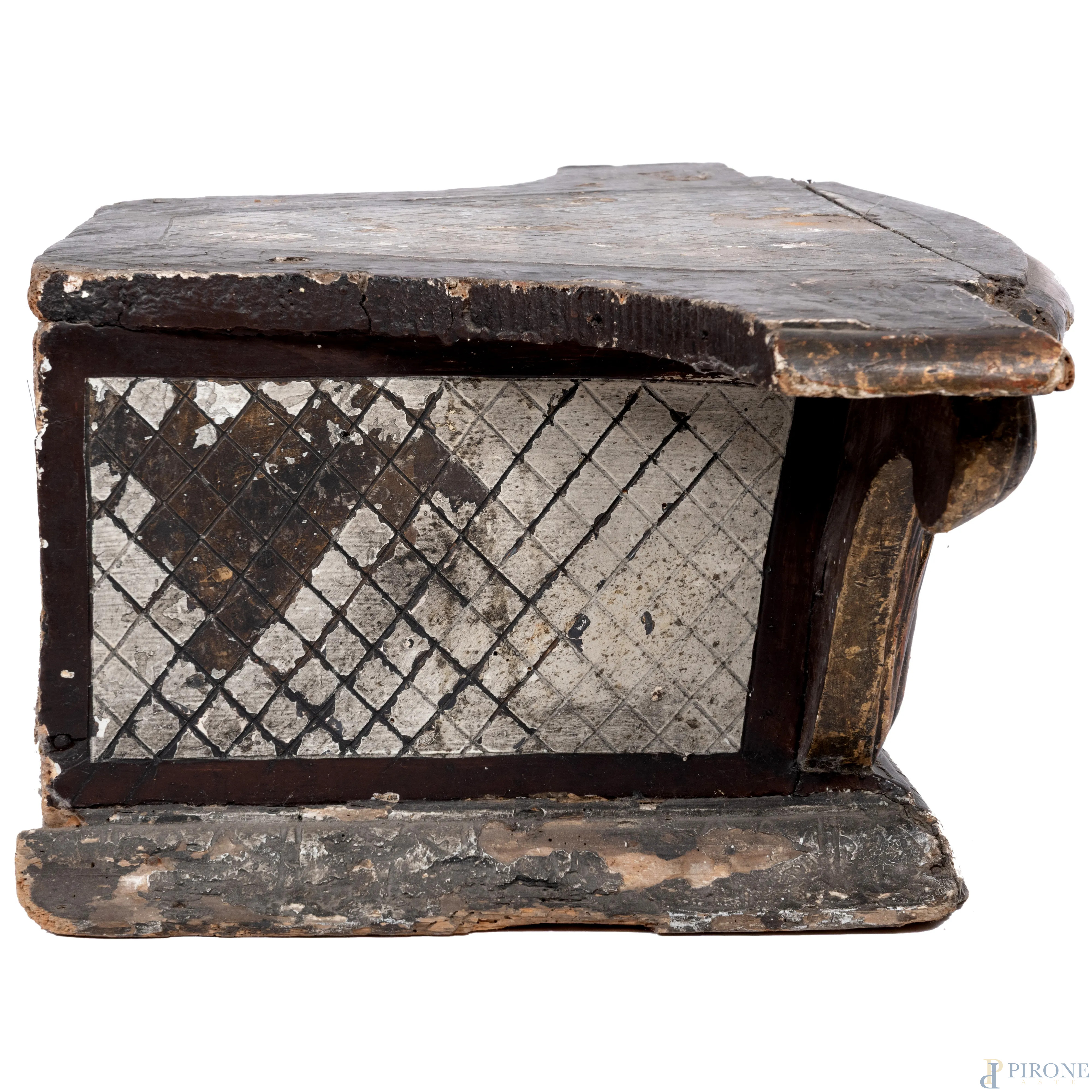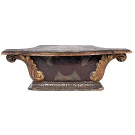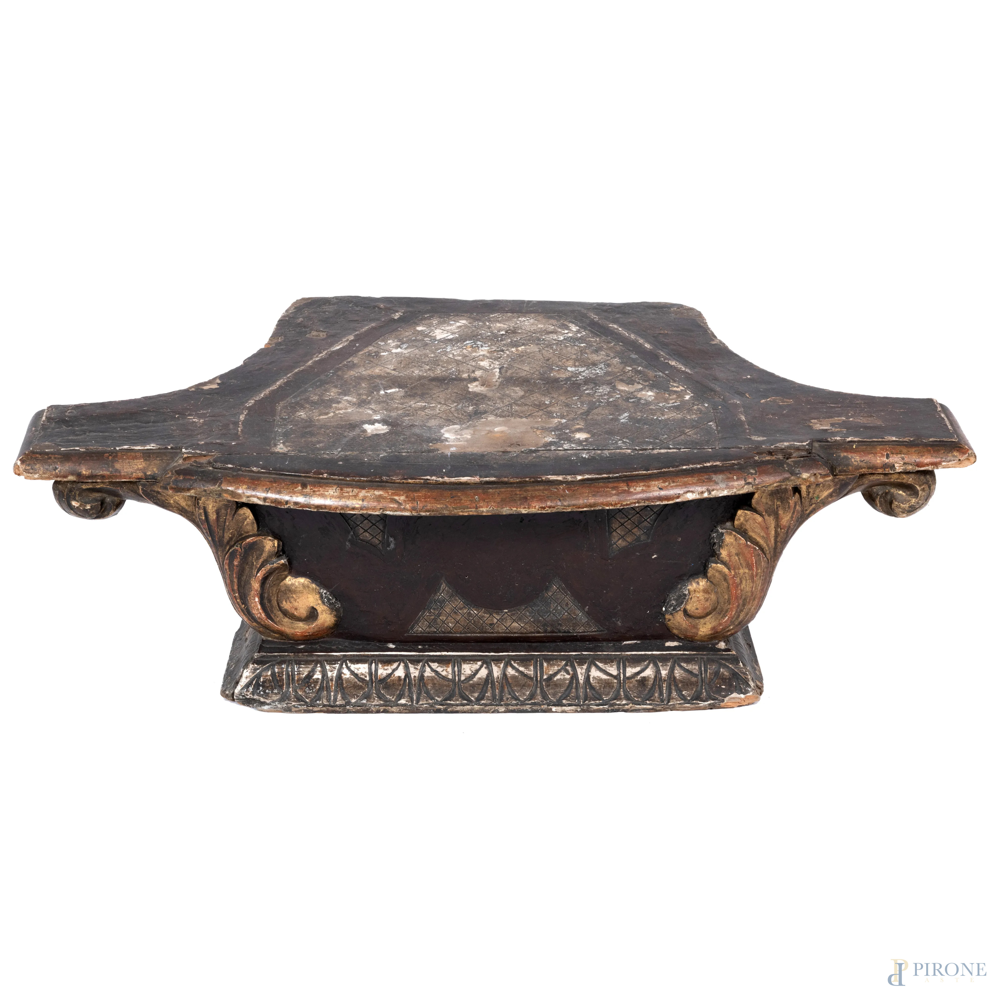 Base in legno intagliato e dipinto a guisa di capitello, XVIII secolo, cm 26x83x42, (segni di usura, scalfiture, difetti, cadute di colore, mancanze)