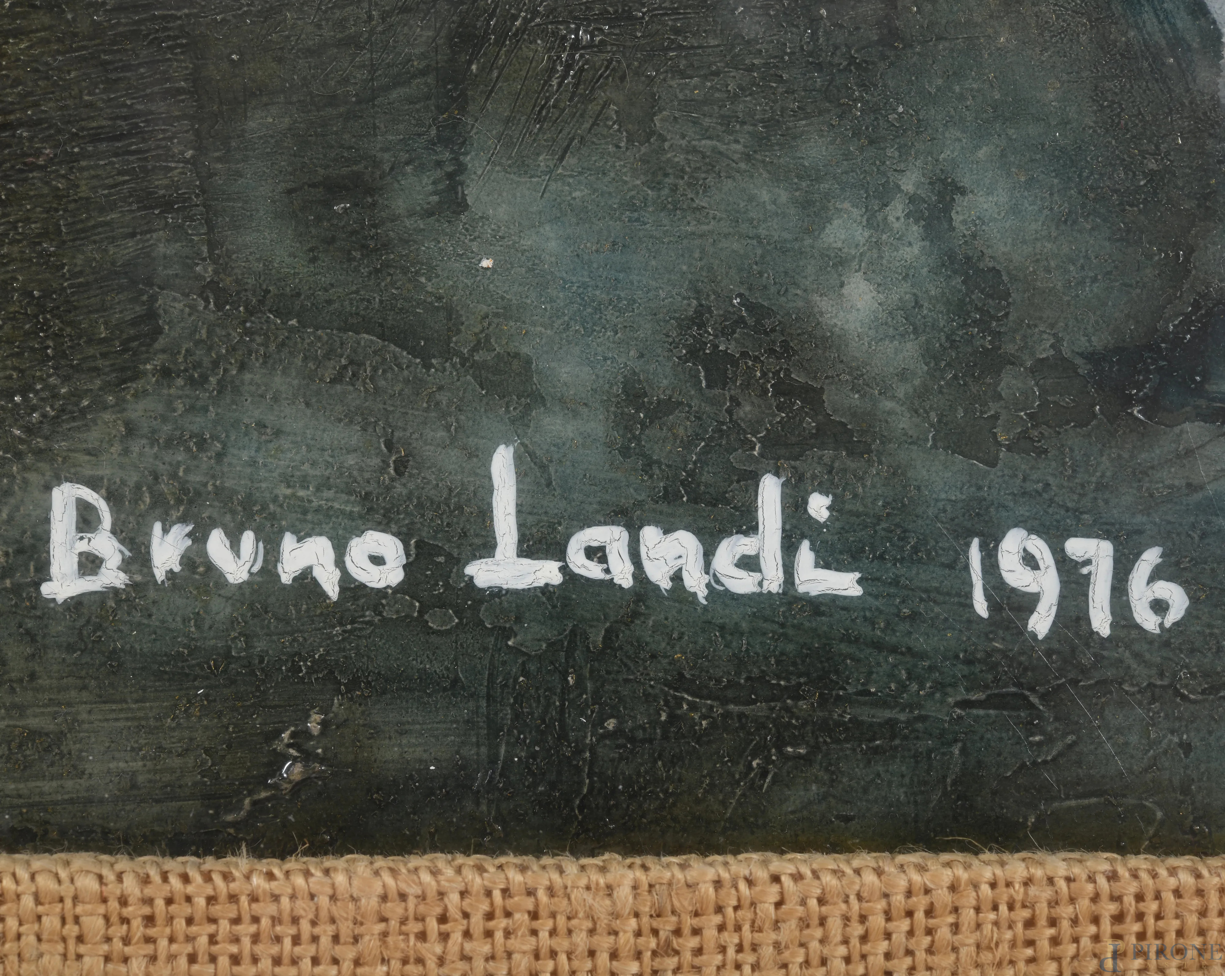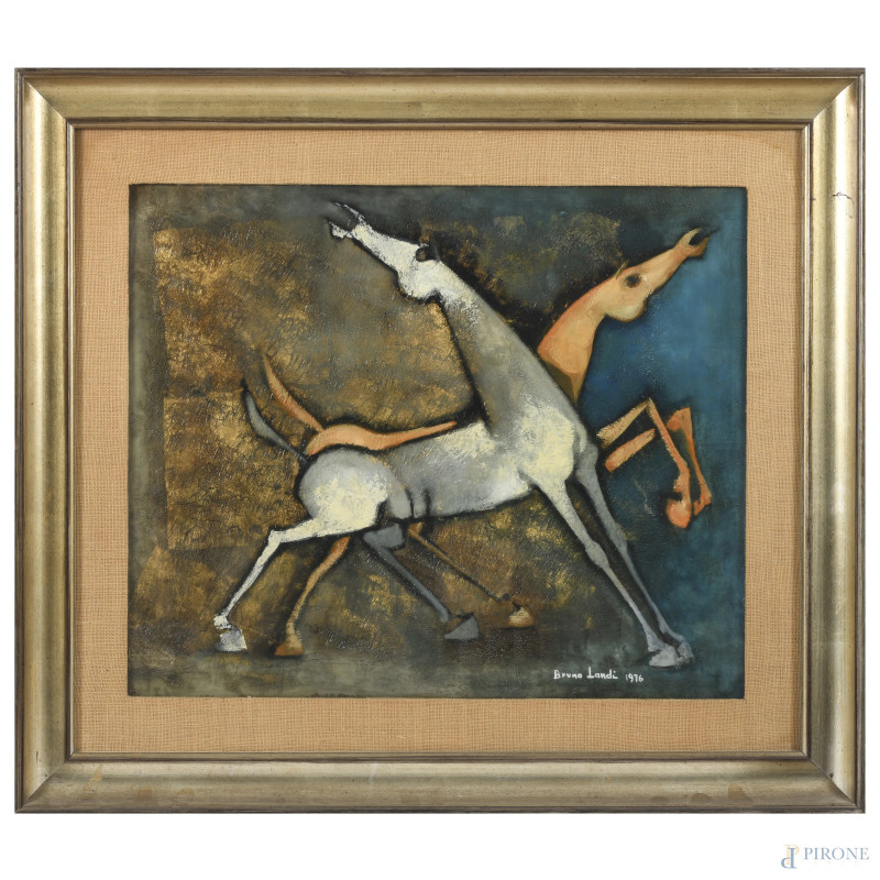 Bruno Landi (1941-), Cavalli, tecnica mista su cartoncino, cm 50,5x60,5, firmato e datato "1976" in basso a destra, entro cornice, (ondulazioni del supporto)