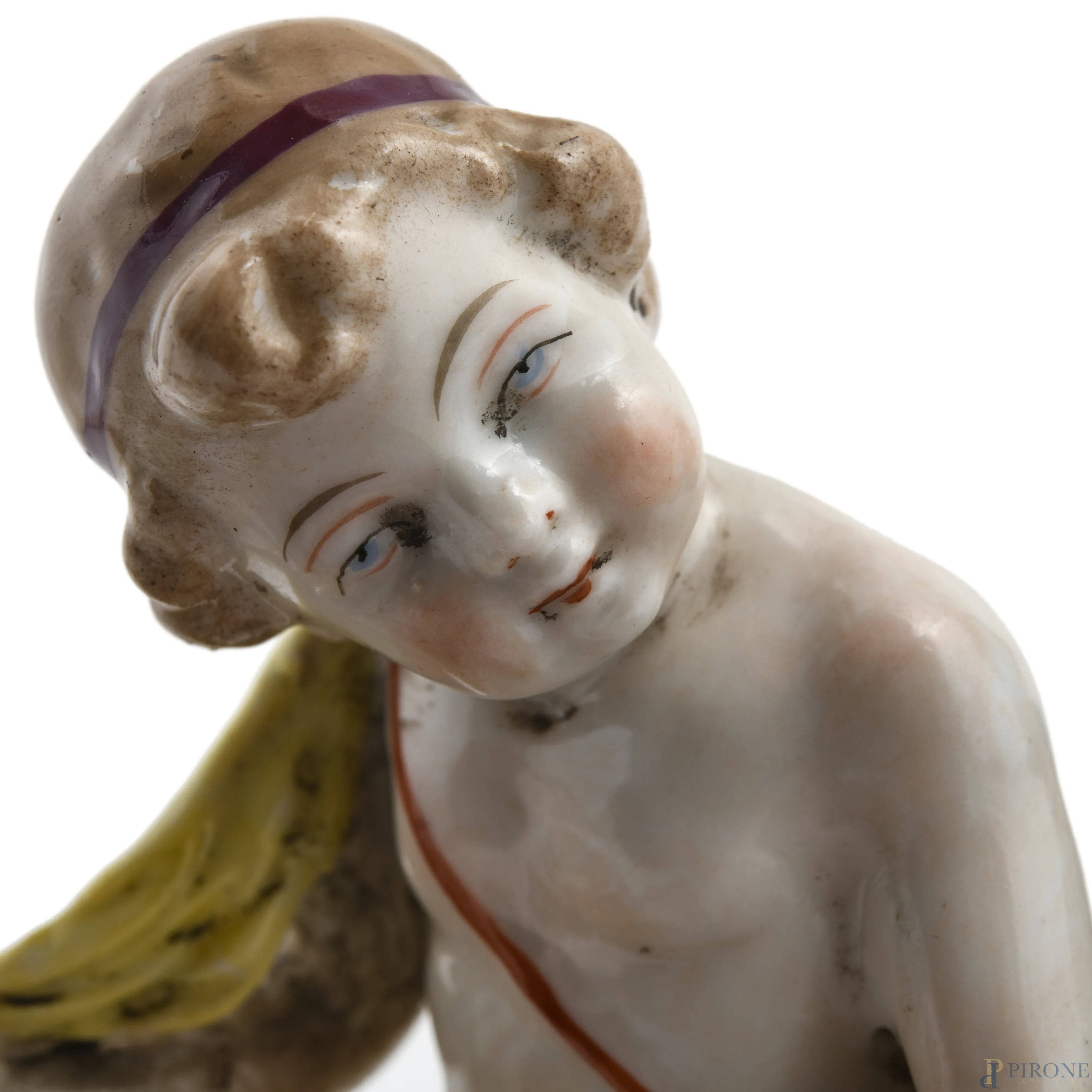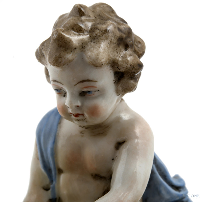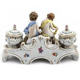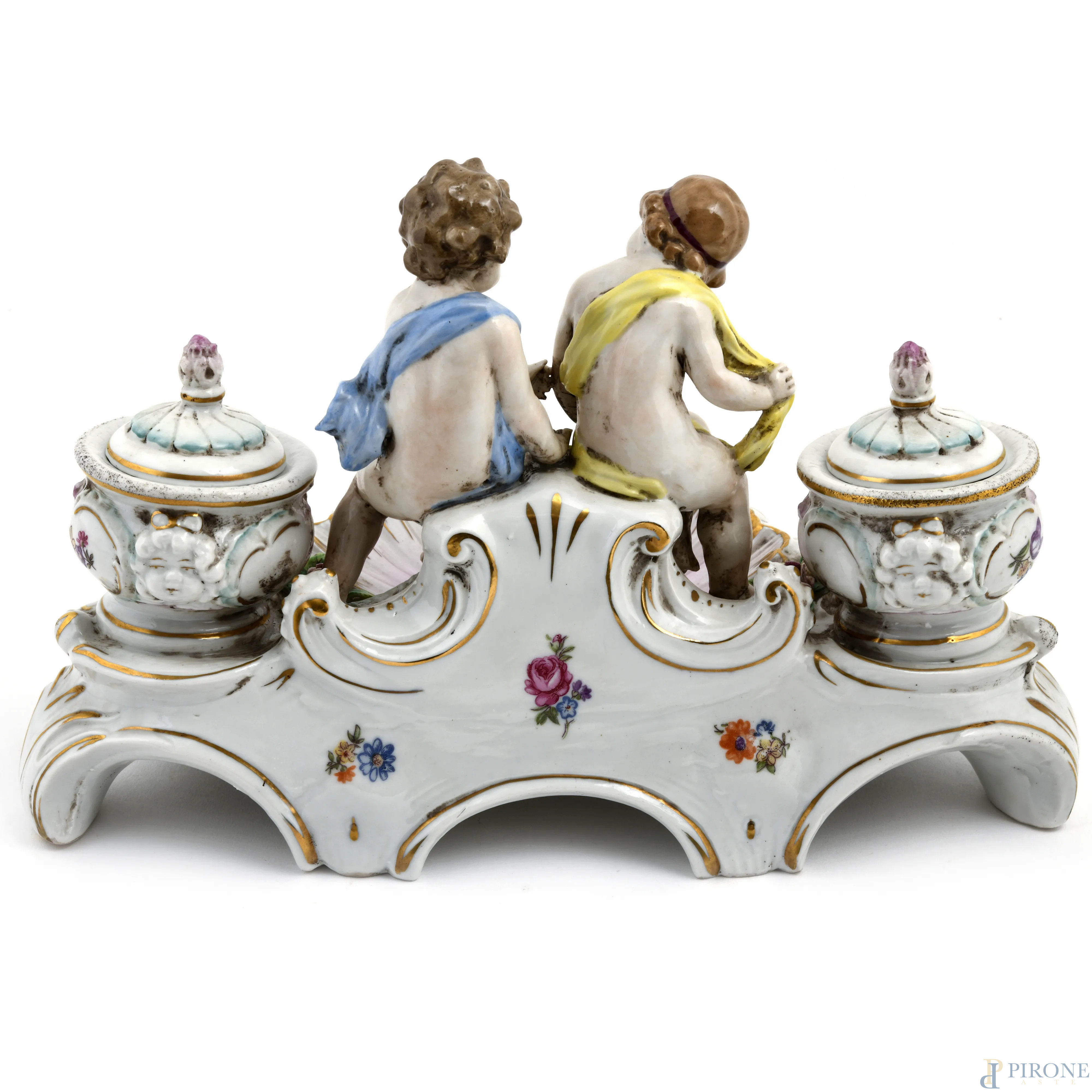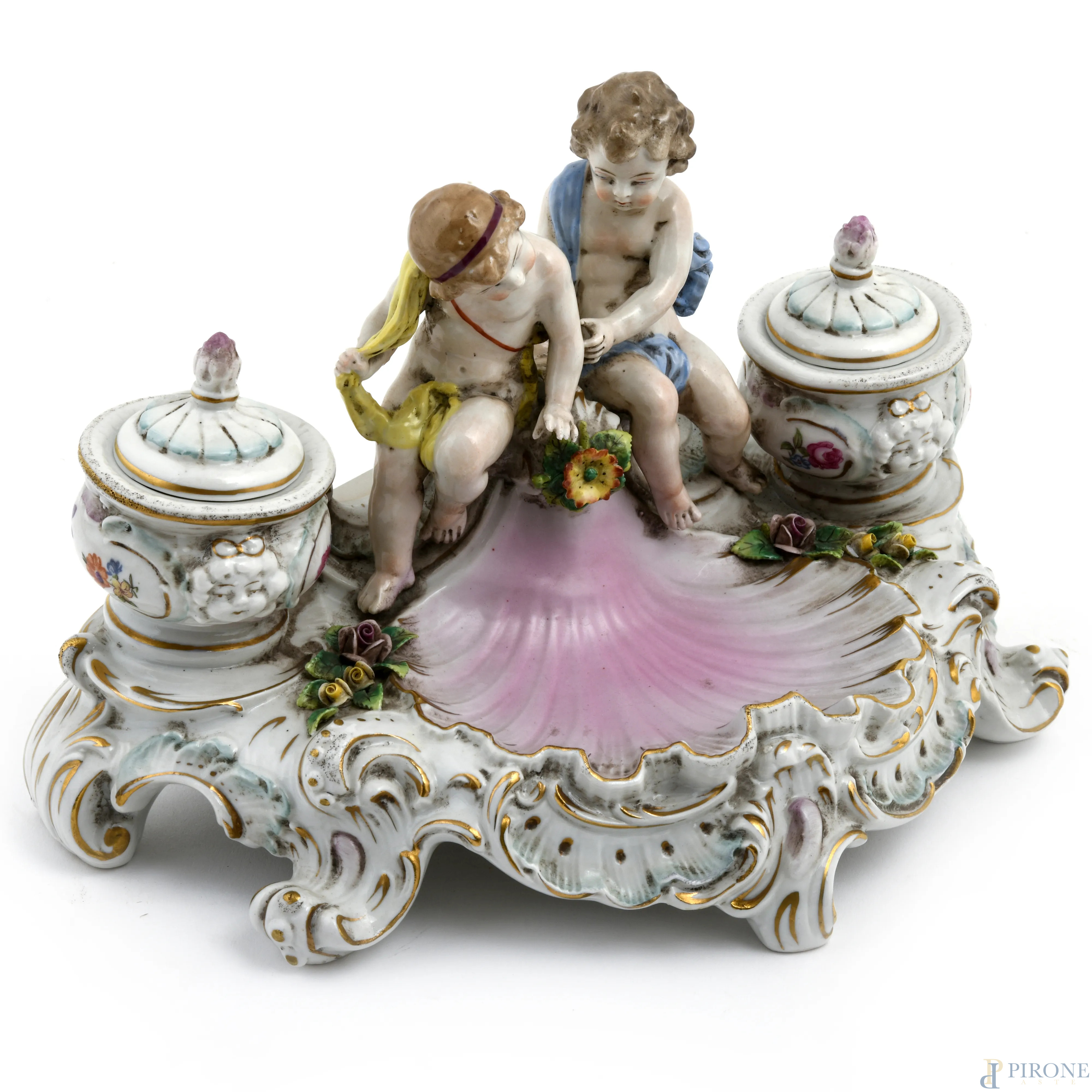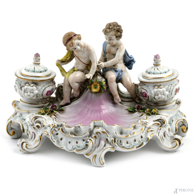 Calamaio in porcellana Capodimonte decorata in policromia con putti seduti su conchiglia, XX secolo, cm 17x26x16 (segni di usura, difetti, sbeccature, cadute di colore)