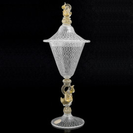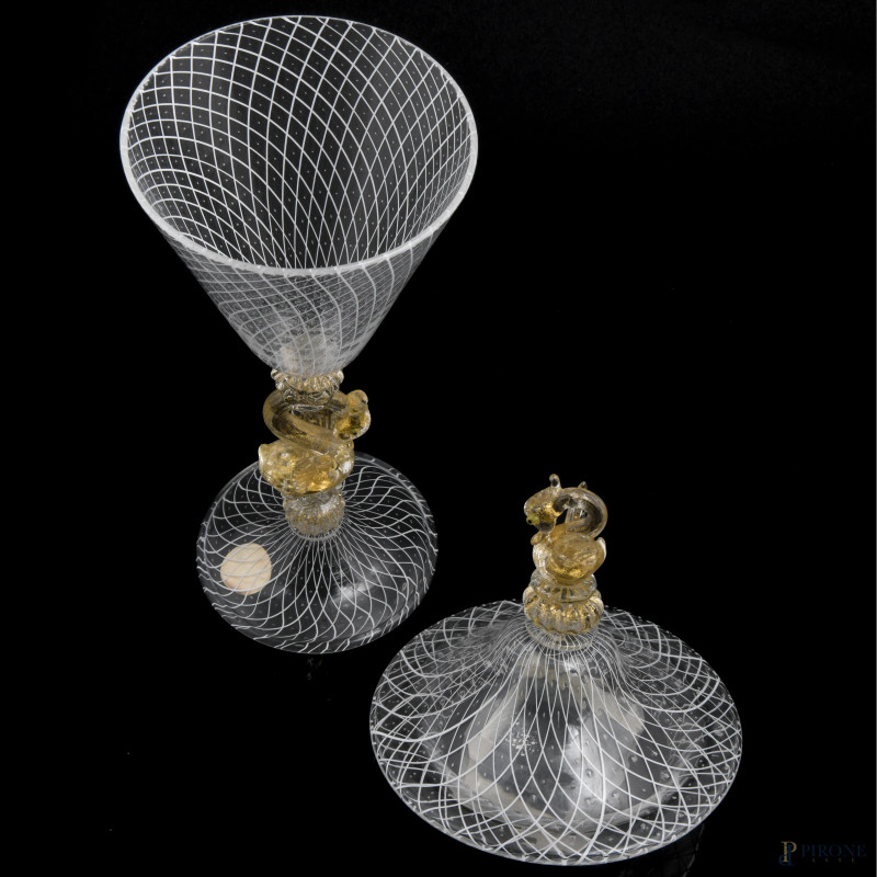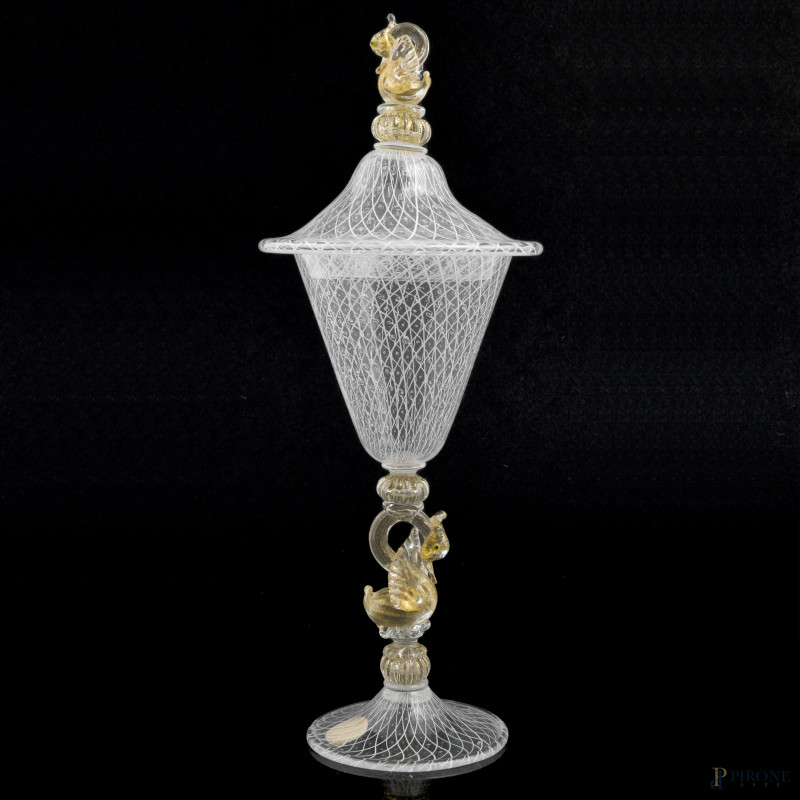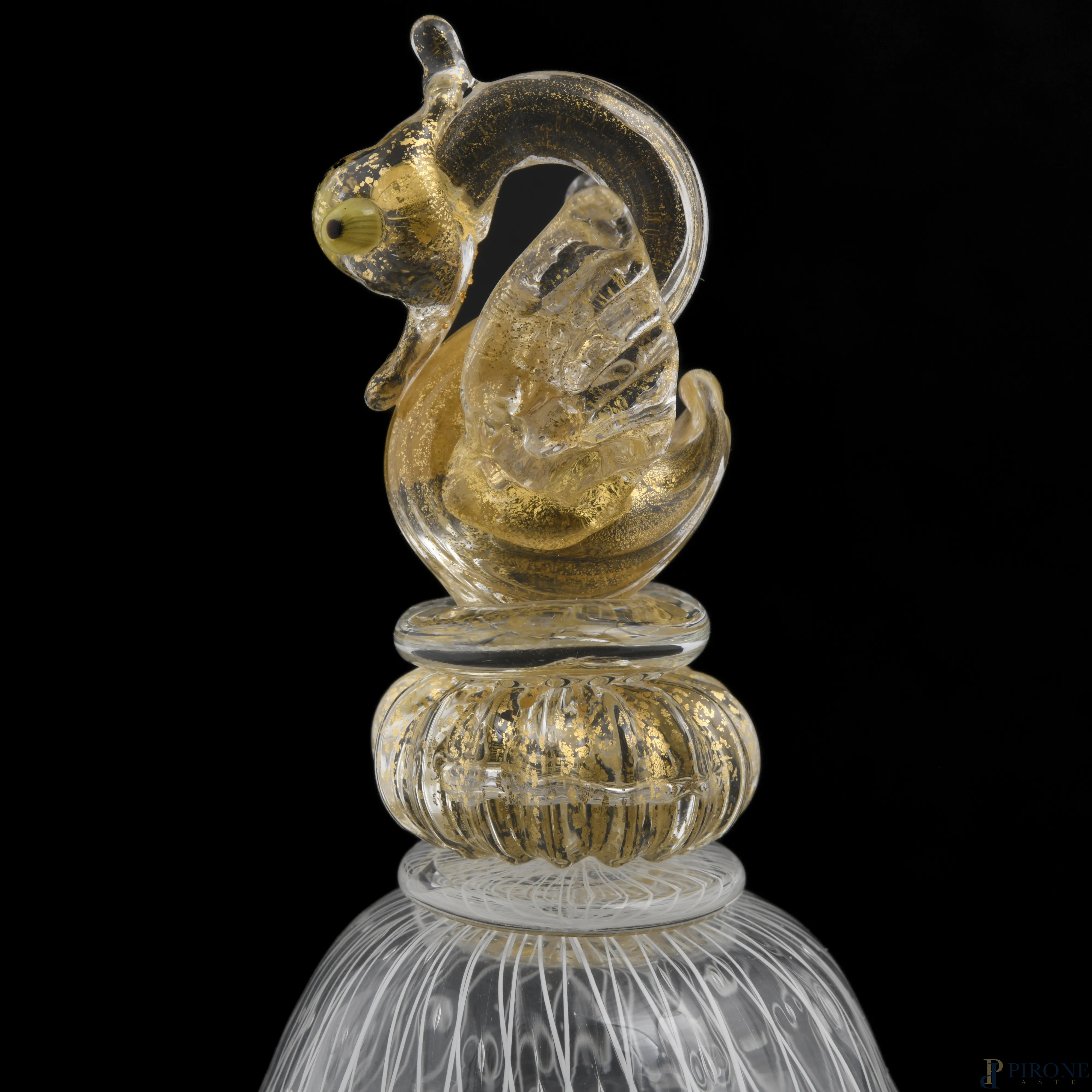 Calice con coperchio in vetro di Murano trasparente spruzzato oro con fusto e presa a guisa di cigno, XX secolo, altezza cm 30
