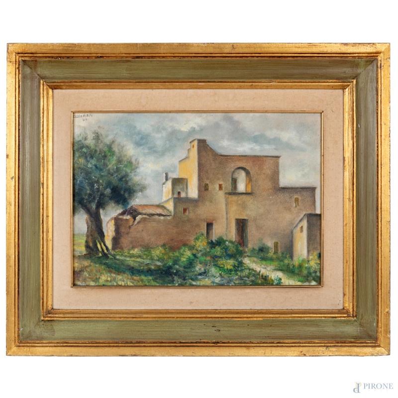 Casale di campagna, XX secolo, olio su faesite telata, cm 36x50, entro cornice