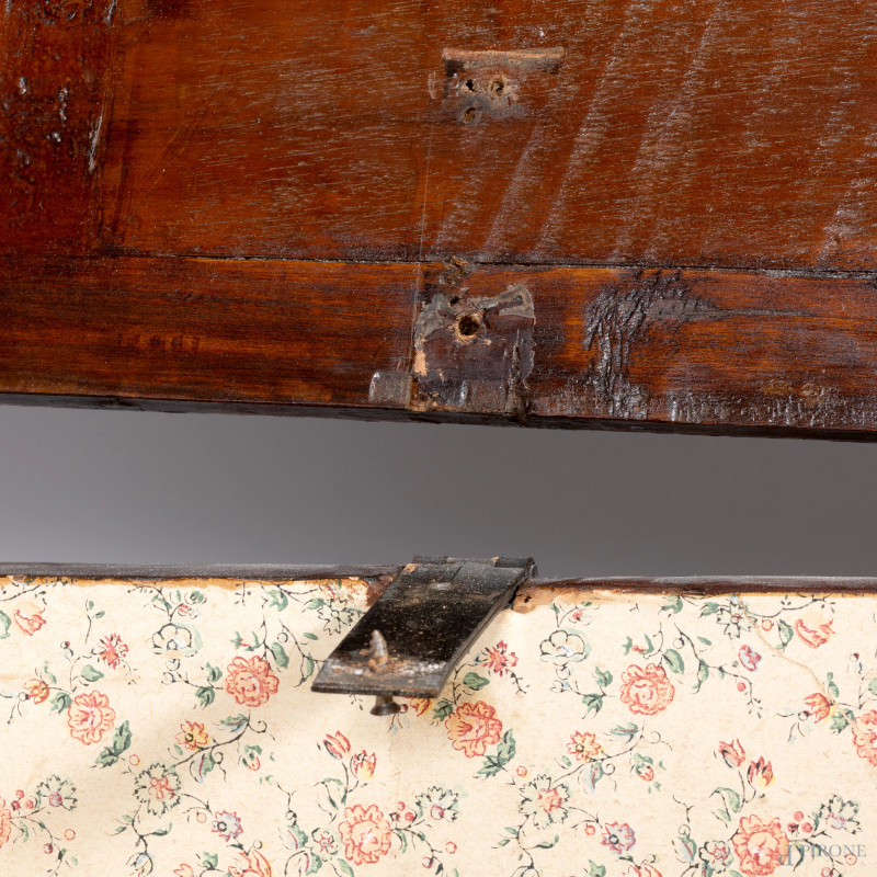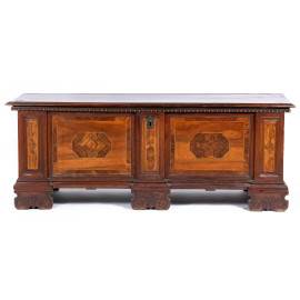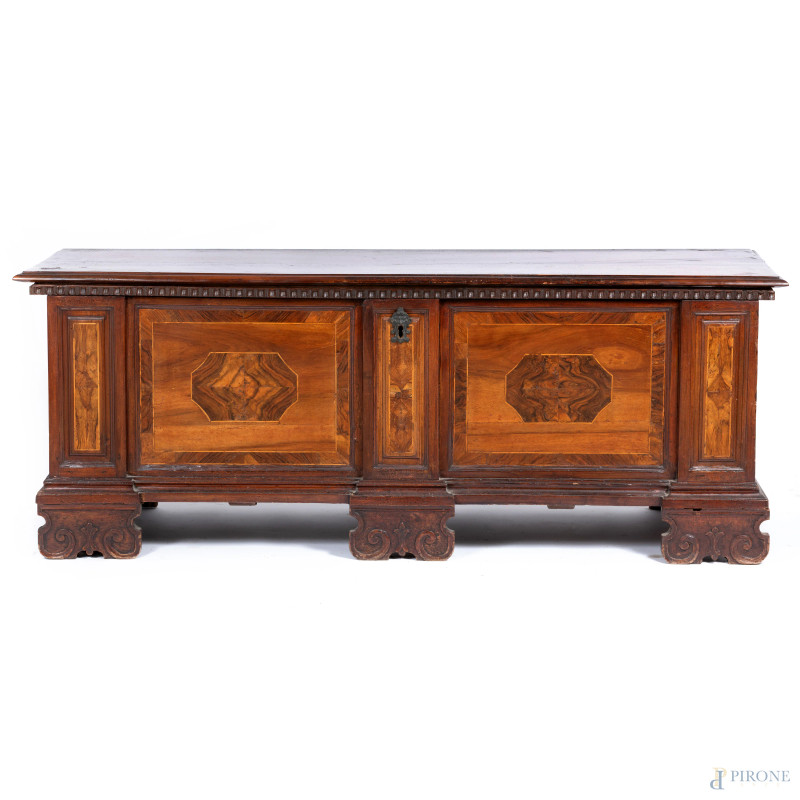 Cassapanca in legno intagliato e intarsiato in varie essenze con fronte scandito a doppia modanatura, XVIII secolo, cm 63,5x167x56, (segni di usura, scalfiture, difetti)