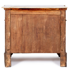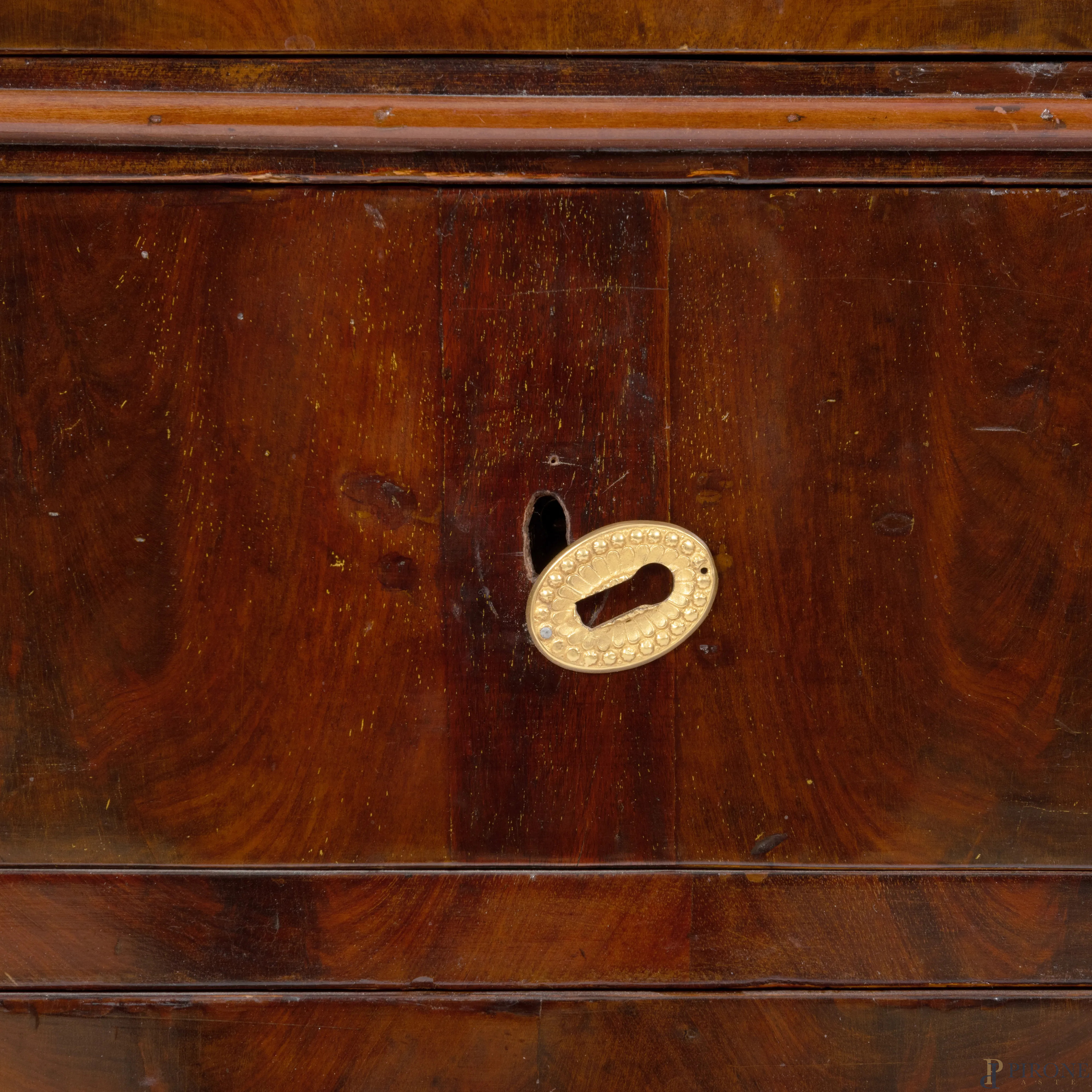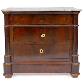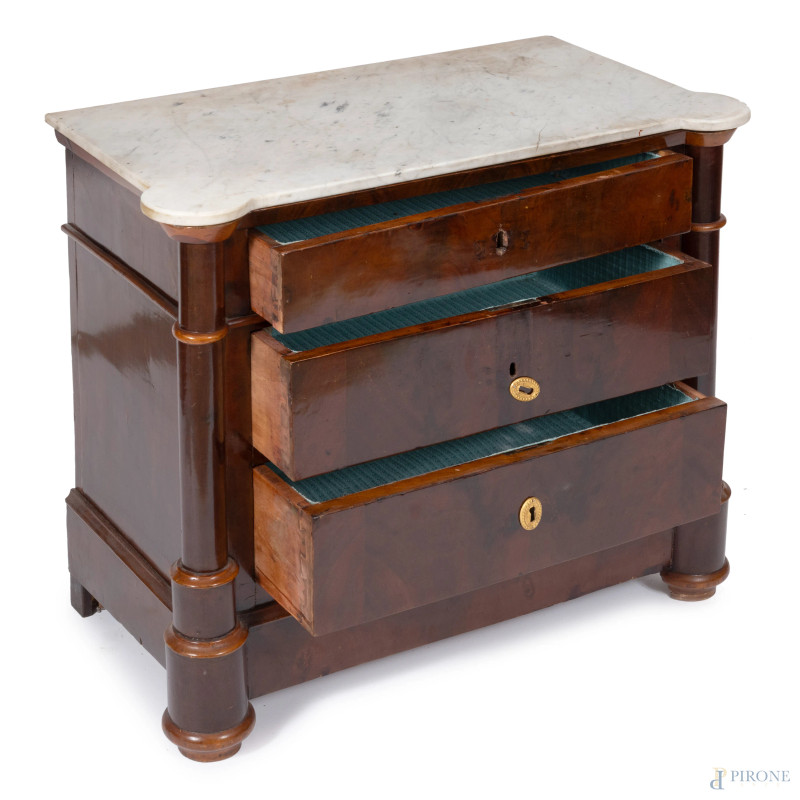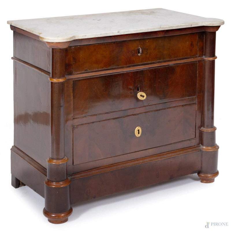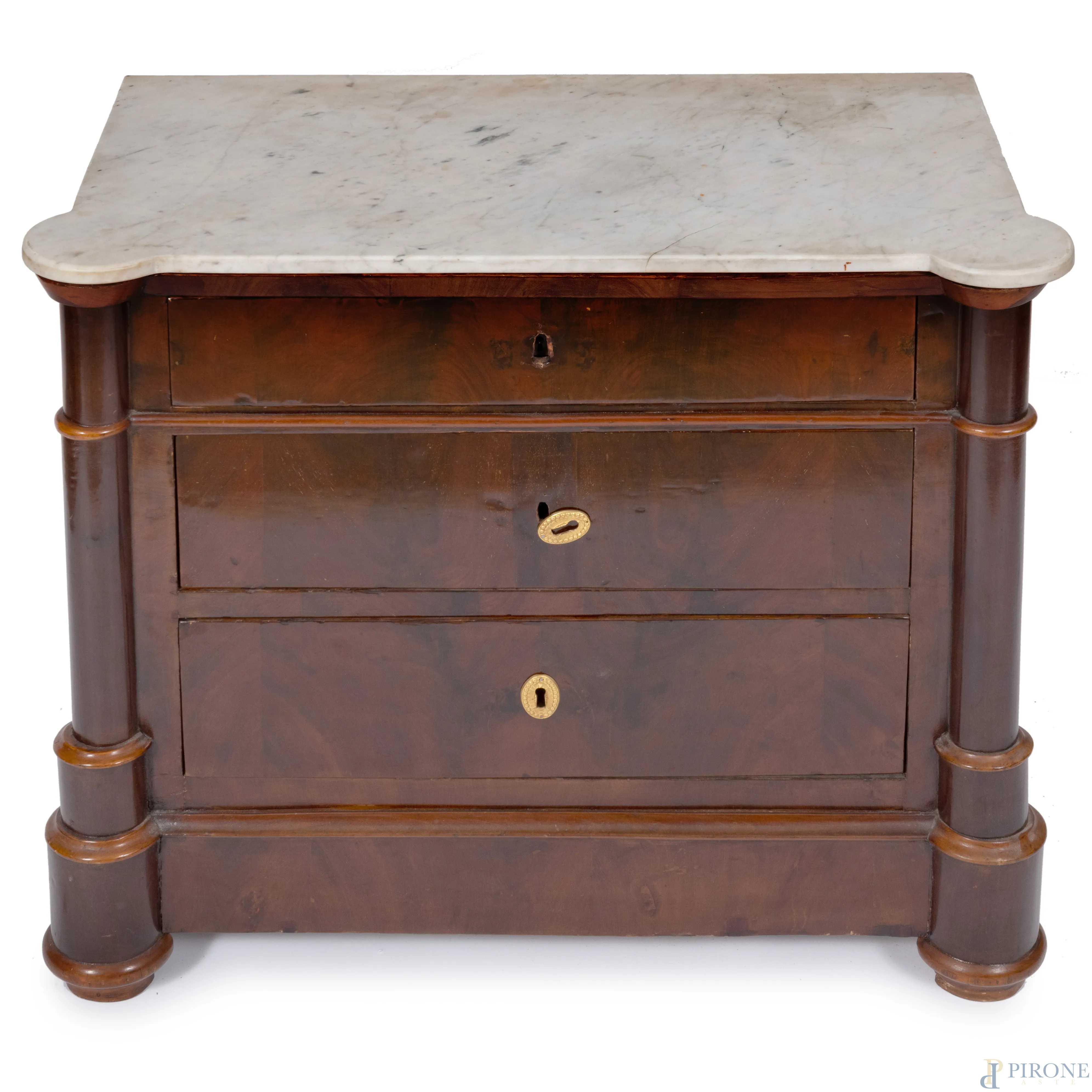 Cassettiera impiallacciata in piuma di mogano a tre cassetti con piano in marmo, XIX secolo, altezza cm 82x95x51, (segni di usura, difetti, scalfiture, rotture)