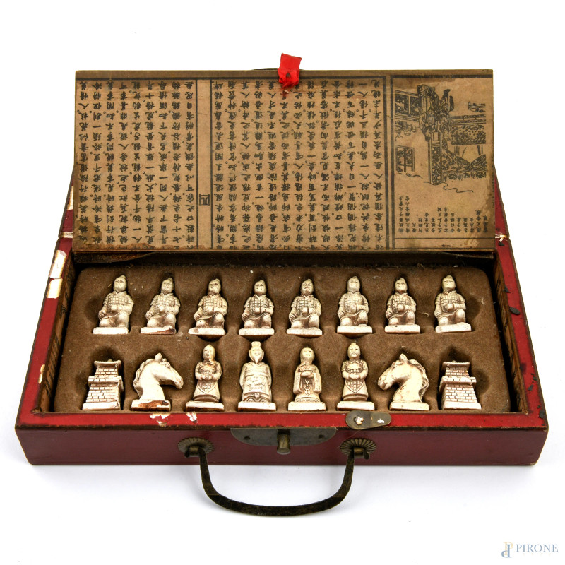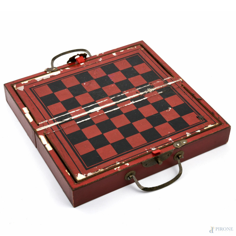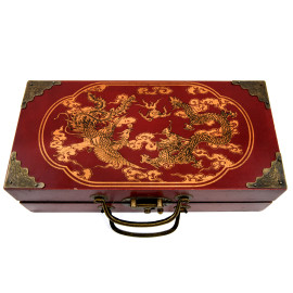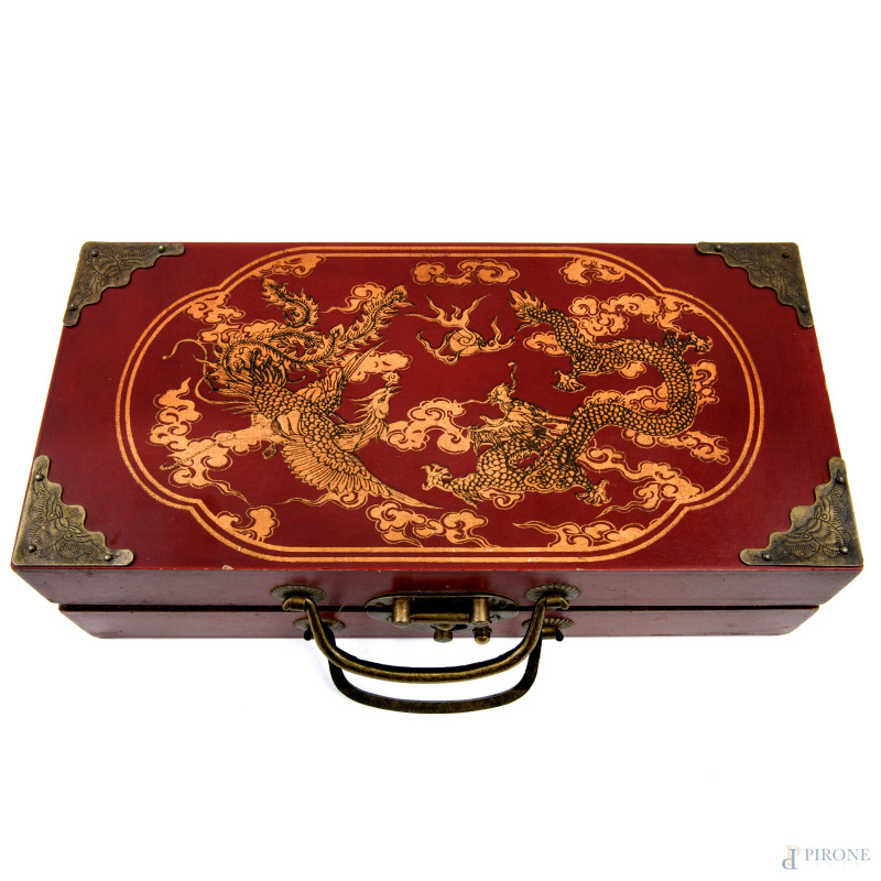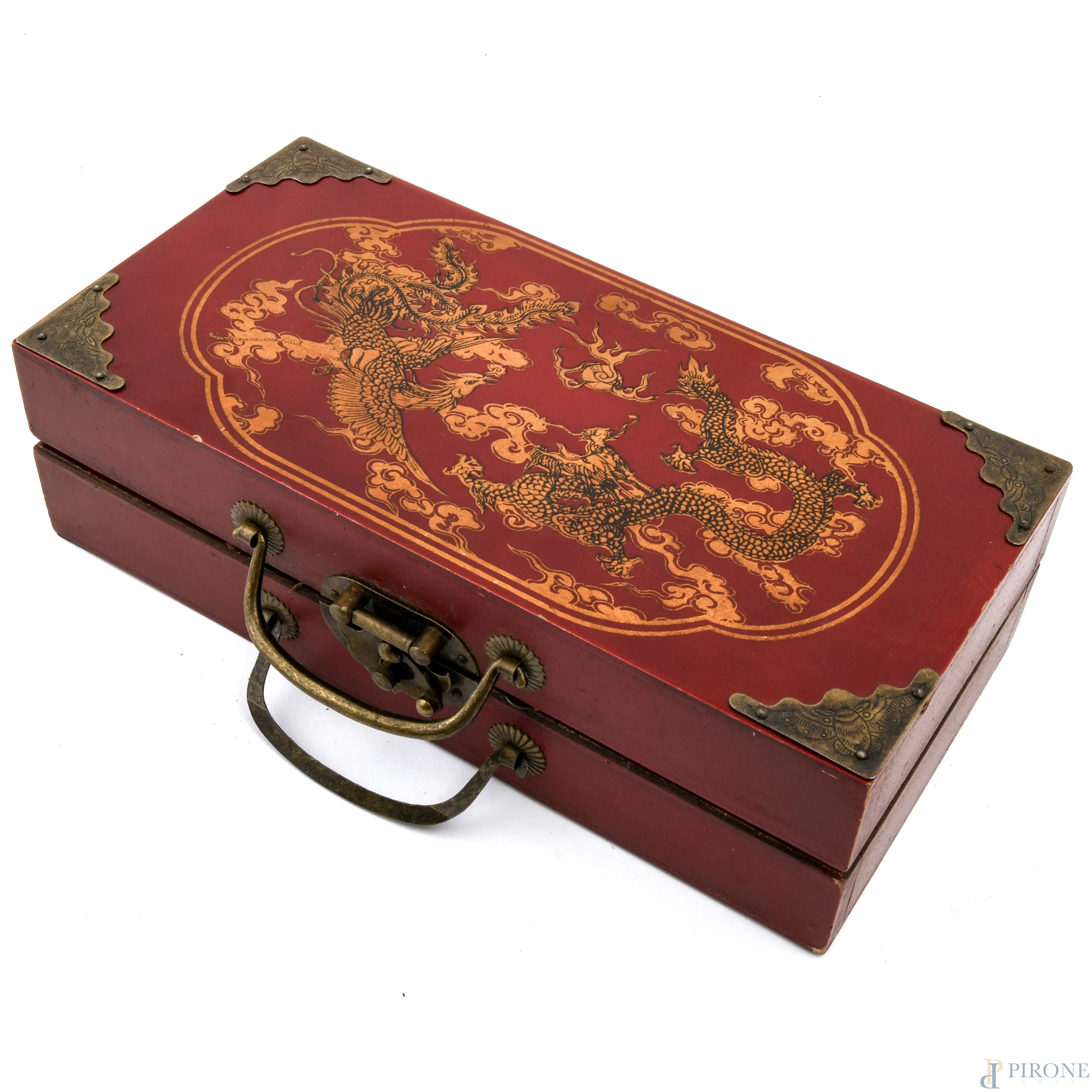 Cofanetto in legno laccato con decoro a dragoni contenente scacchiera e vani con pedine in legno per il gioco degli scacchi. Cina, XX secolo, misure aperto cm 4,5x23,5x24, misure chiuso cm 6,5x12x24, (segni di usura, difetti)