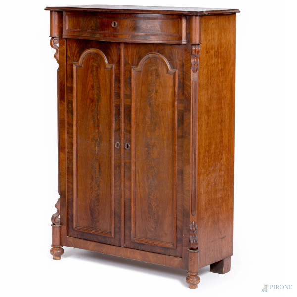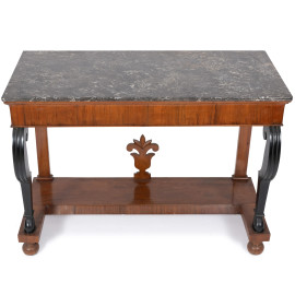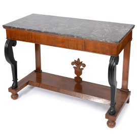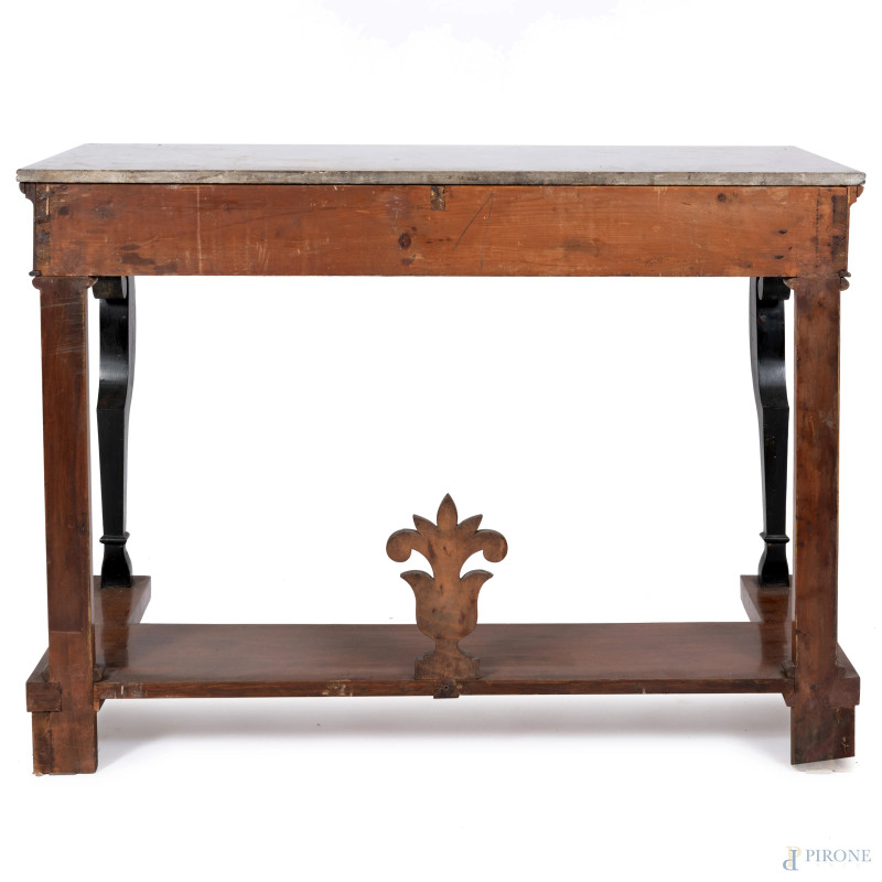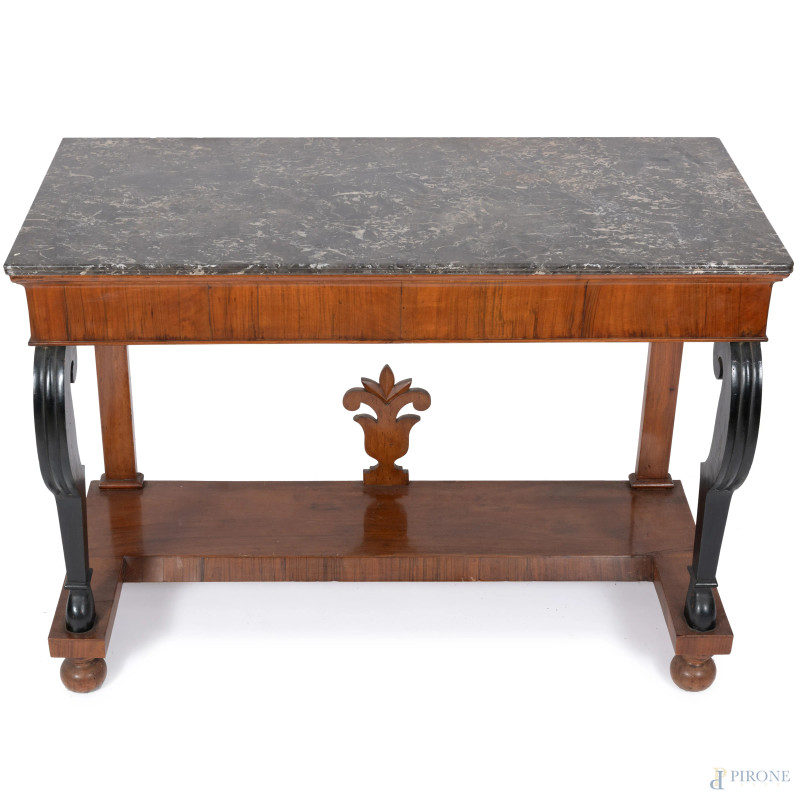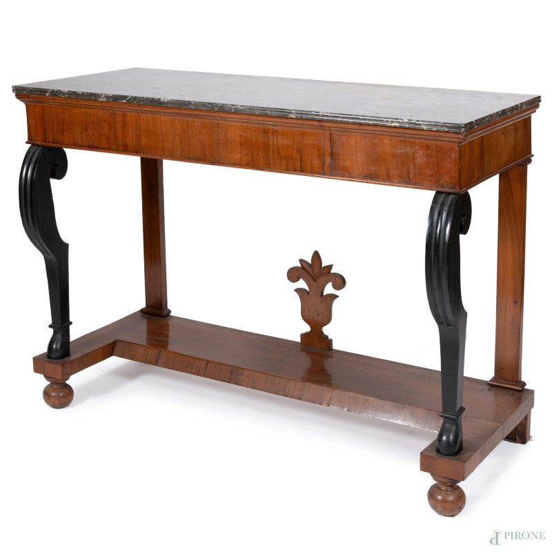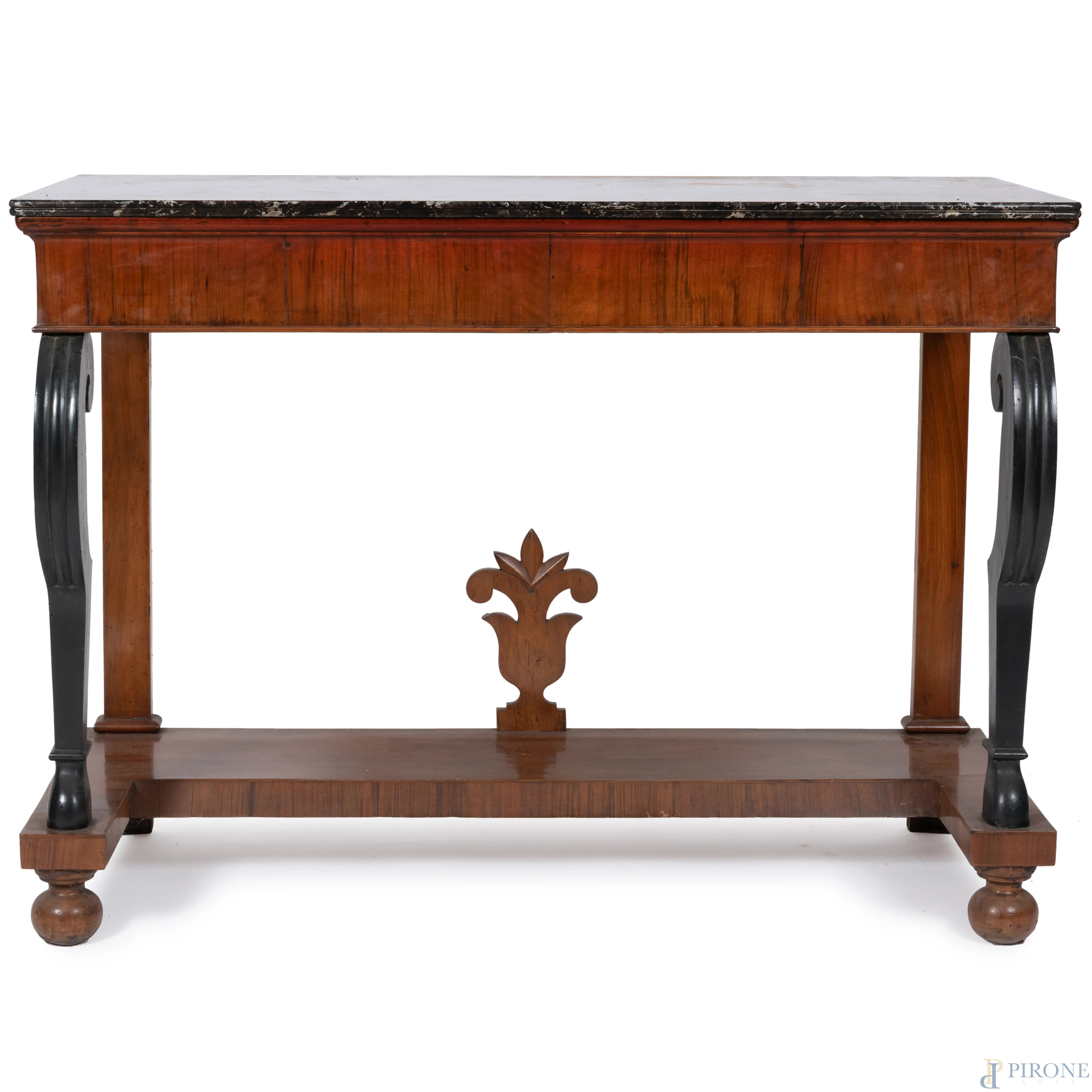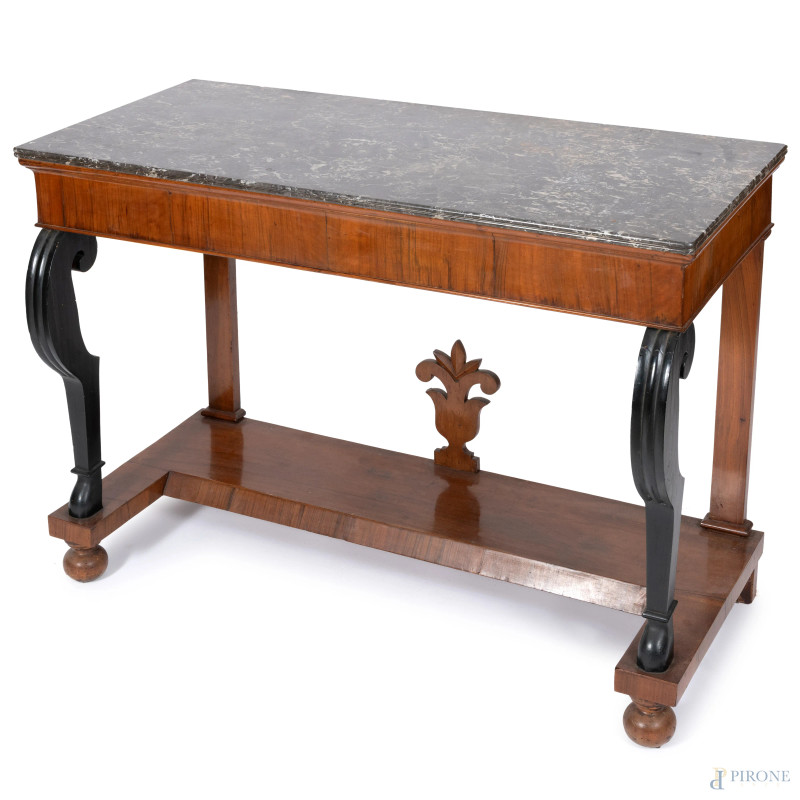 Consolle da muro in legno dipinto e impiallacciato in piuma di mogano con piano in marmo. Gambe anteriori a zoccolo raccordate da pedana intagliata, XIX secolo, cm 95x128,5x58, (segni di usura, scalfiture, difetti)