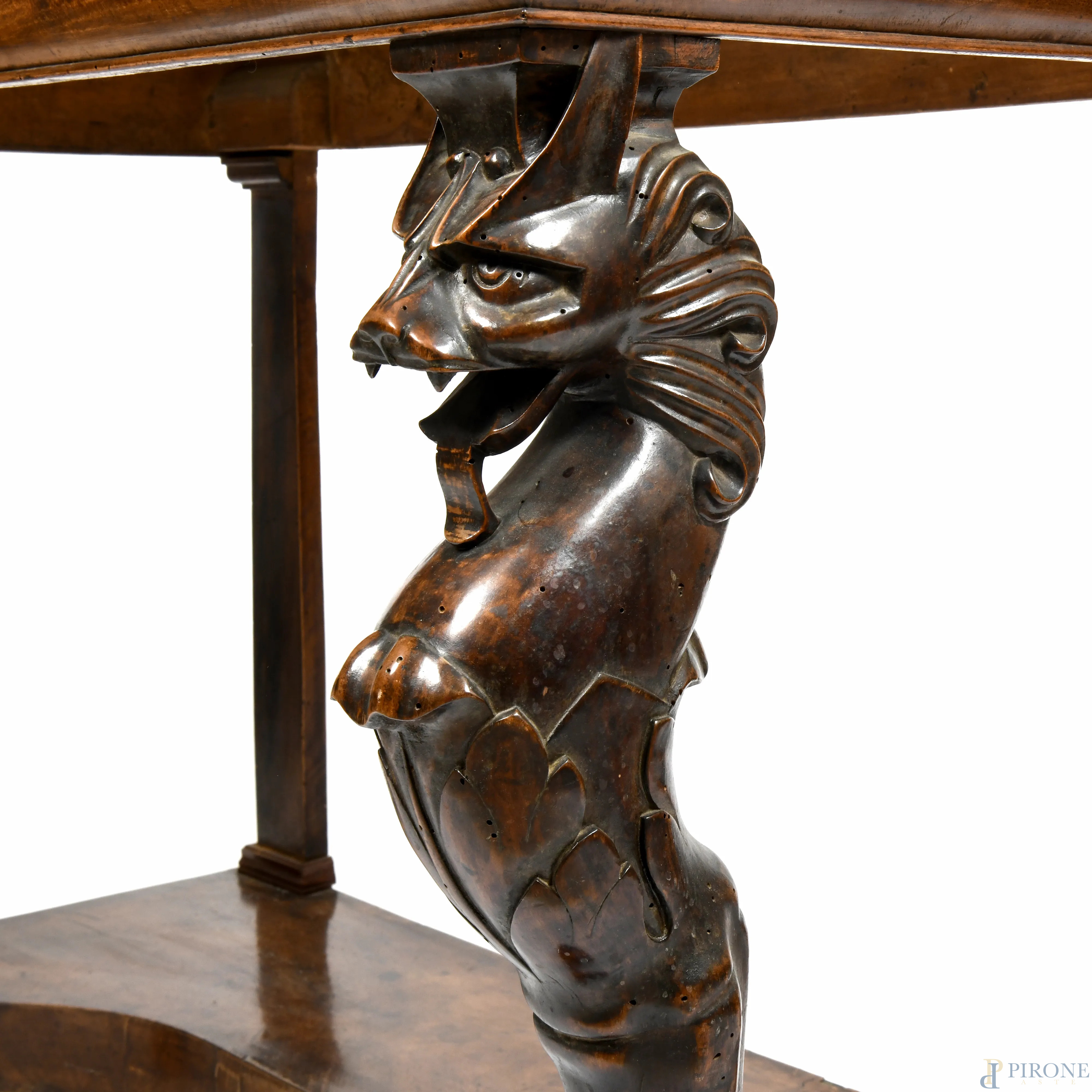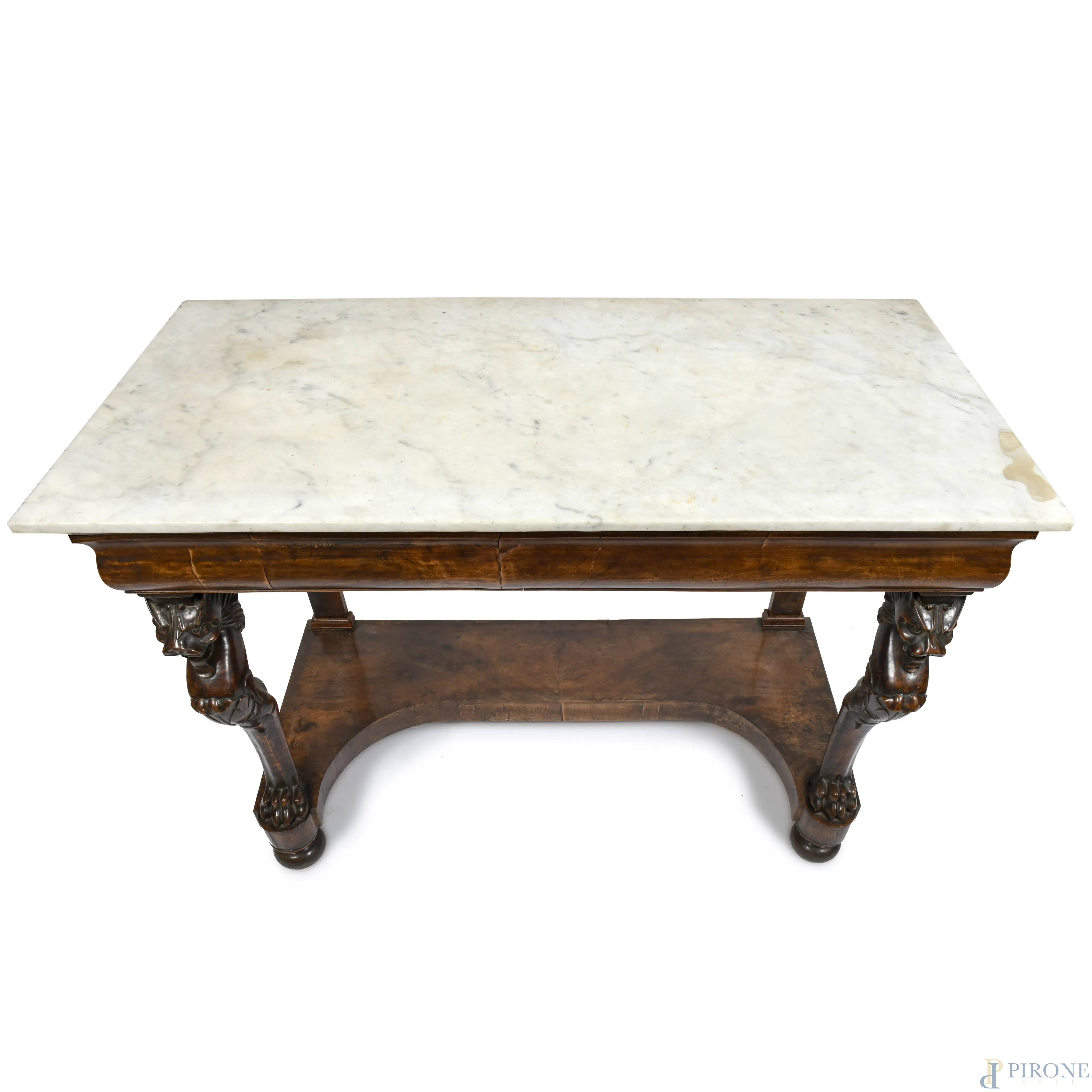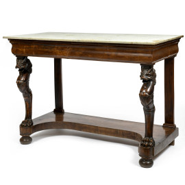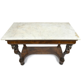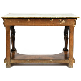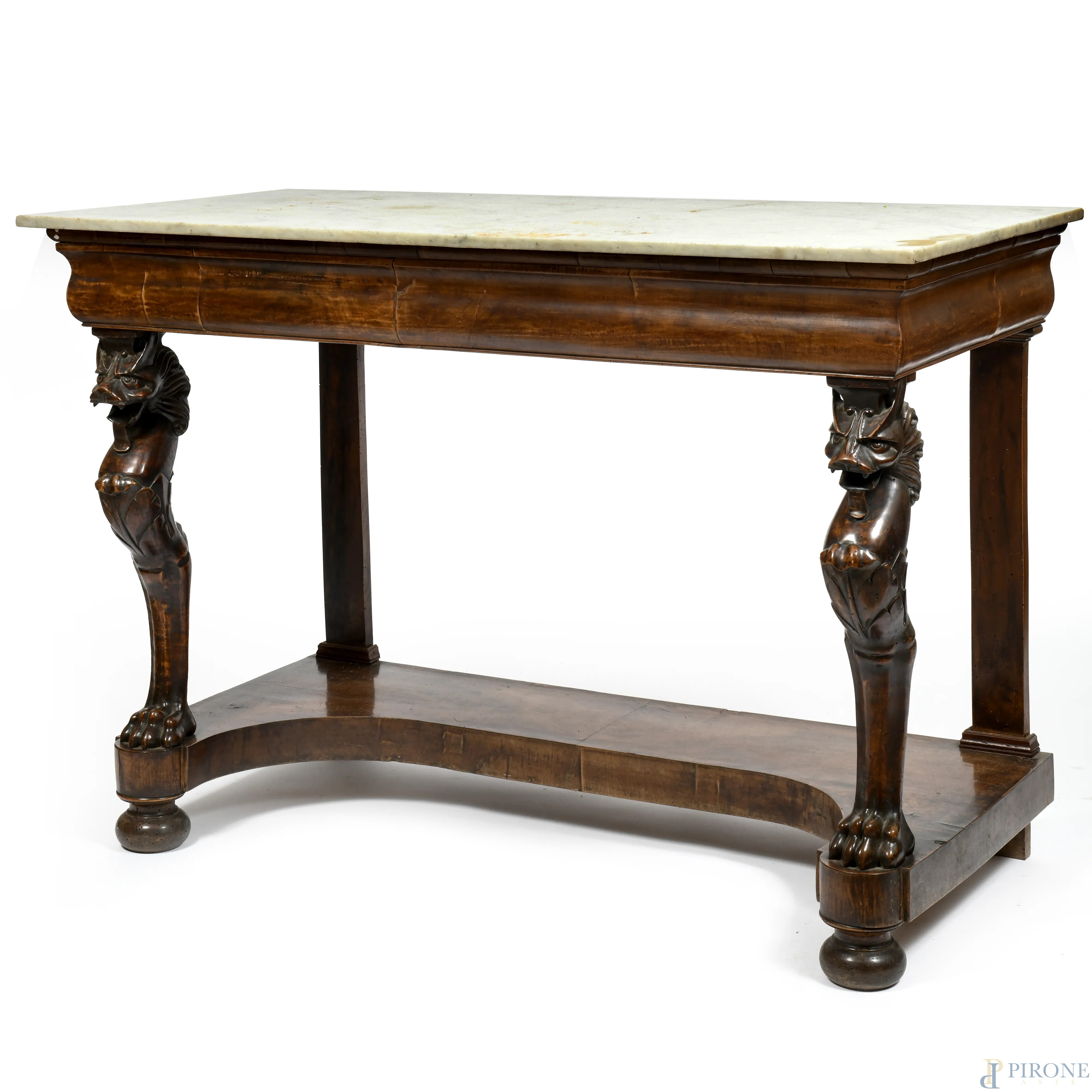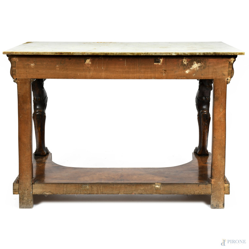 Consolle in legno impiallacciato e piano in marmo. Montanti anteriori a guisa di grifoni con piedi ferini e gambe posteriori a lesene lineari raccordate da pedana sagomata, XIX secolo, cm 95,5x134x66,5, (difetti al piano, scalfiture, fori di tarlo, segni di usura)