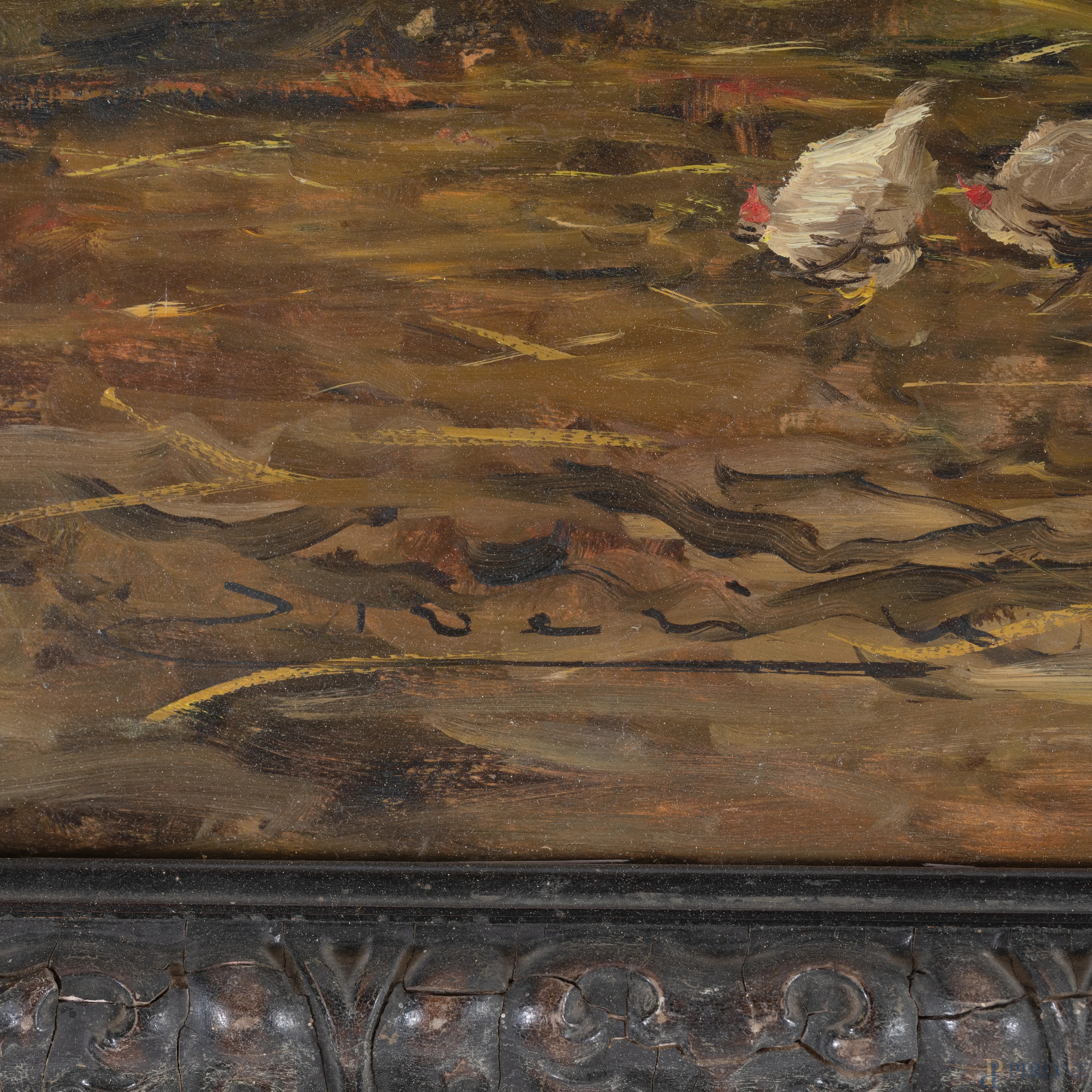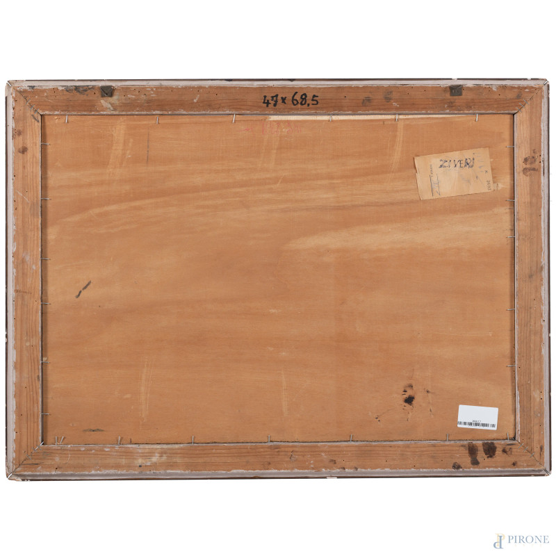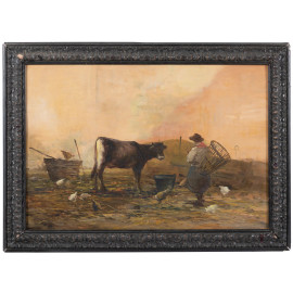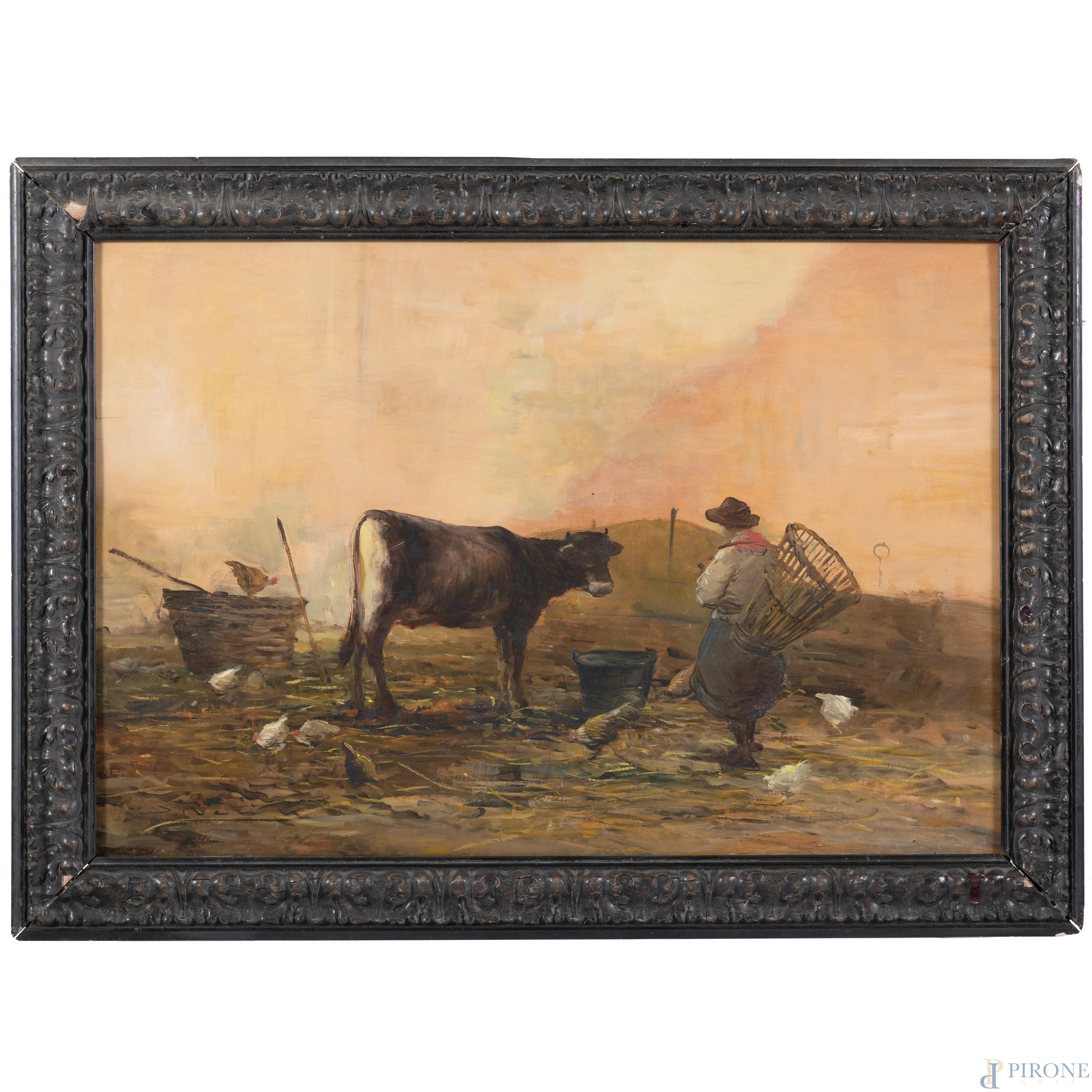 Contadina e armenti, XX secolo, olio su compensato, cm 47x68, firmato in basso a sinistra, entro cornice